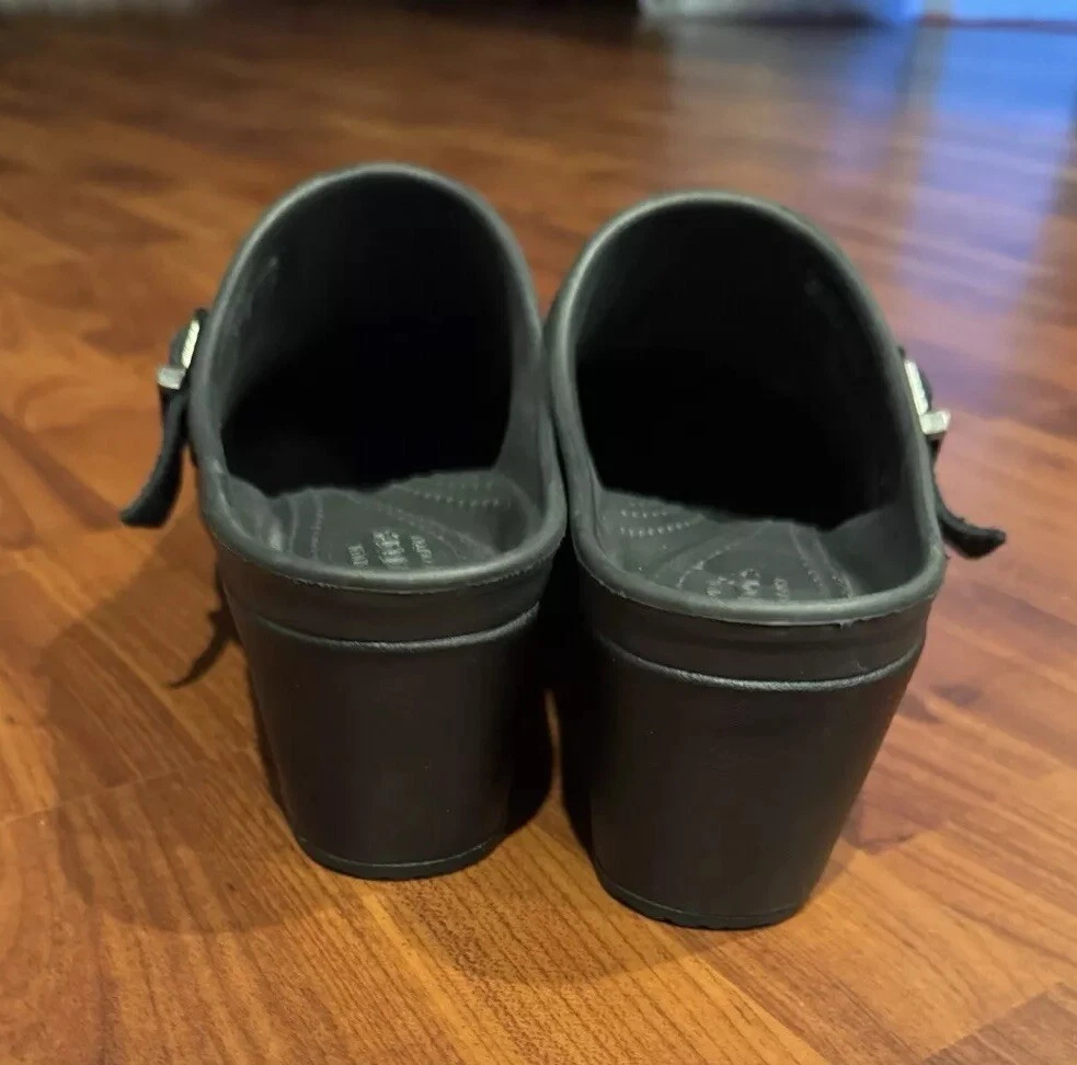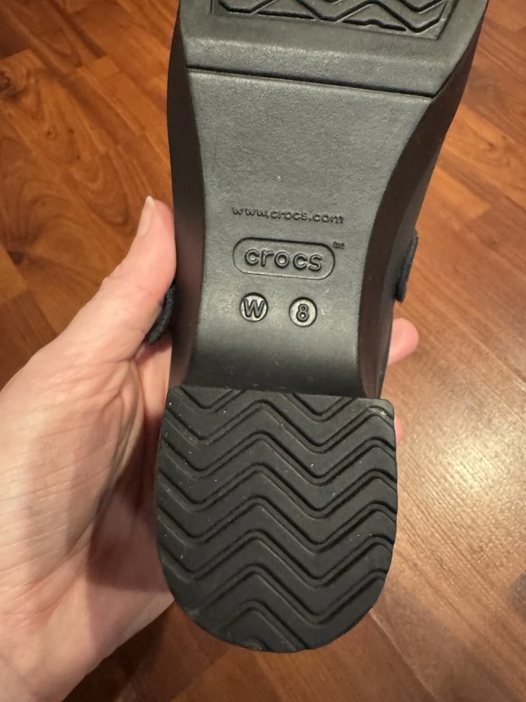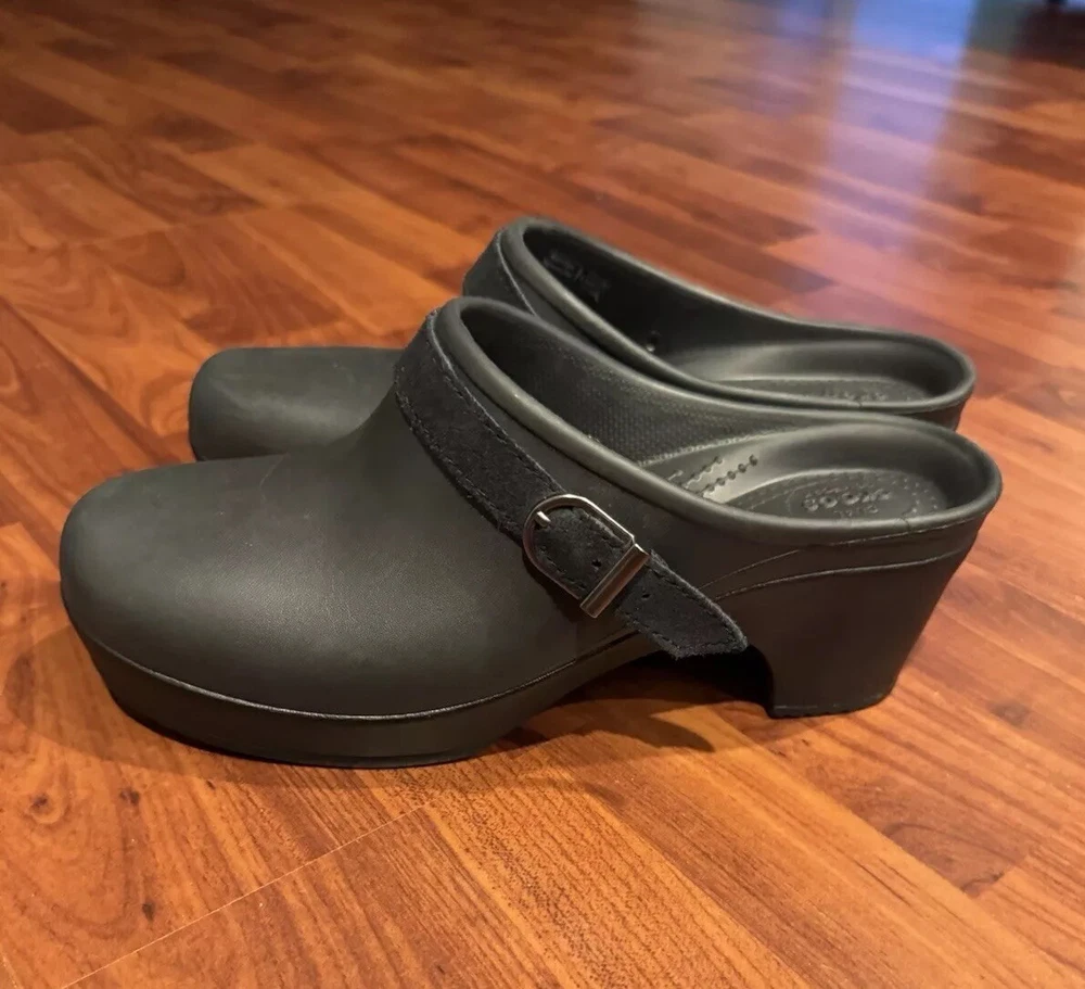 These are Crocs Sarah clogs for women in black, size 8, featuring a closed toe. They have a mid-height heel, suitable for travel and casual wear in summer, fall, and spring. The rubber outsole and breathable design offer comfort for walking and everyday wear. Excellent pre-owned condition. No flaws to notes. Coming from a smoke-free home.
