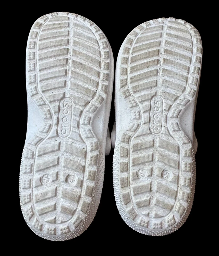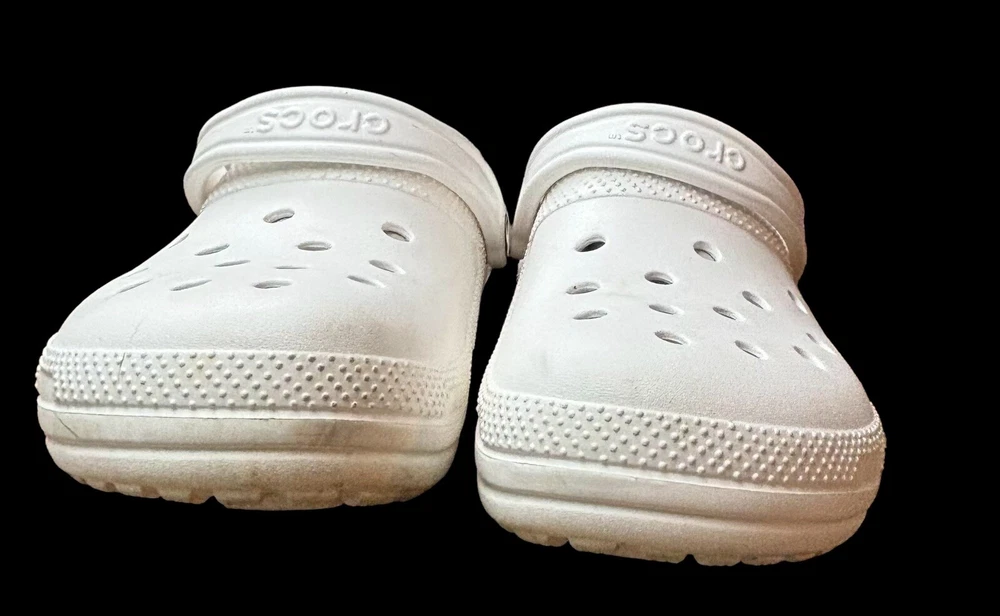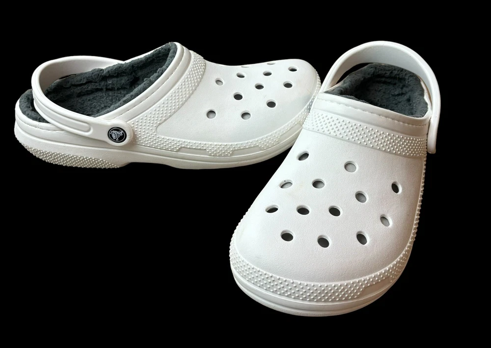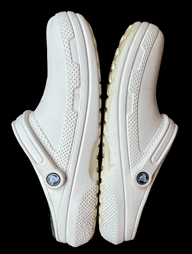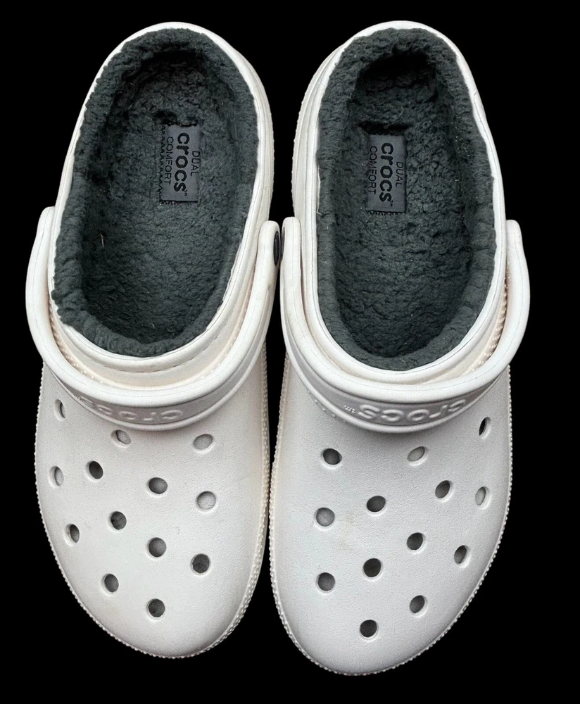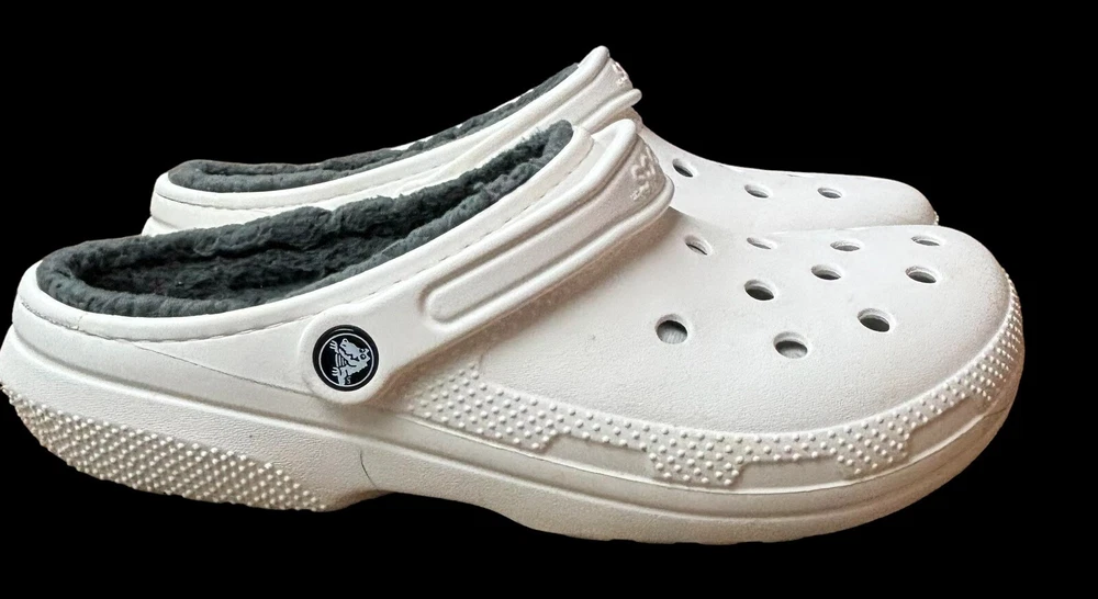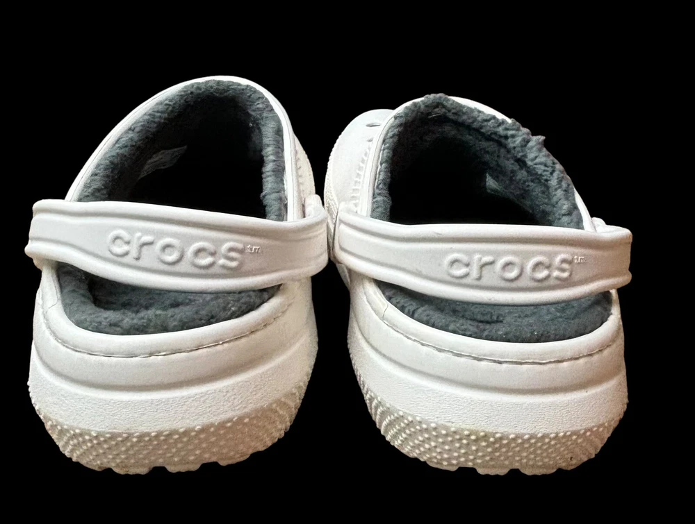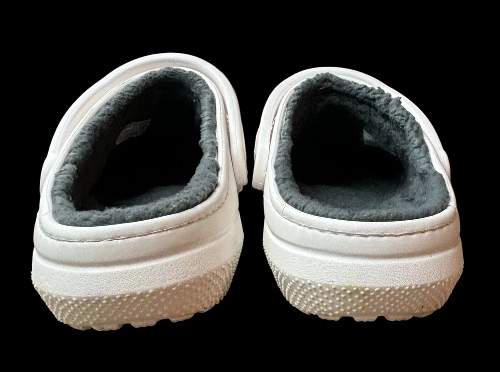 Step into cozy comfort with these Crocs Classic Lined Clogs. Perfect for casual occasions, these slip-on clogs feature a round toe shape and flat heel style. The white rubber upper material is accented with faux fur trim and a solid pattern, giving them a classic theme. The outsole material is made of durable rubber, making them perfect for walking in any season. The clogs are lined with soft fur for added comfort and warmth during winter, fall, and spring seasons. These Crocs are not handmade but feature the Crocs brand and are of type casual. They have standard shoe width. Mens 10 Women’s 12