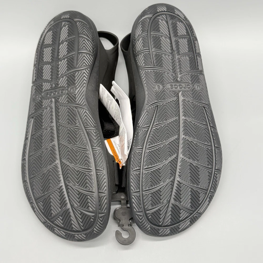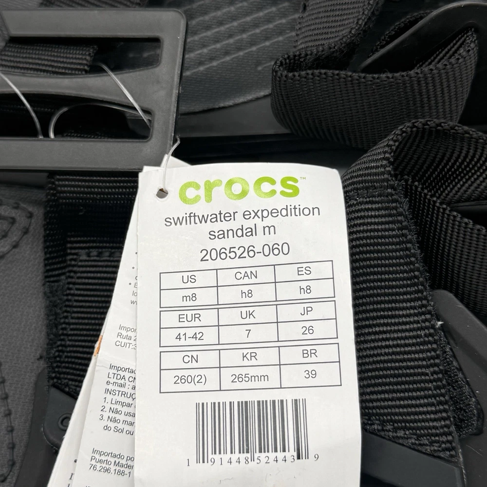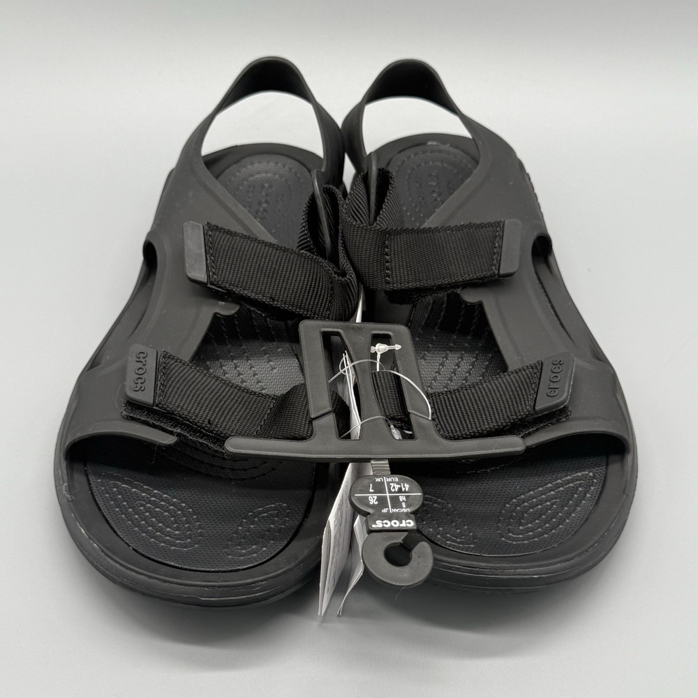 The Crocs Swiftwater Expedition Sandal M in Men's Size 8 is a versatile and comfortable slip-on sandal perfect for travel, casual wear, and work. With adjustable straps, cushioning, and a waterproof synthetic outsole, these sandals provide comfort and support for all-day wear. The black solid pattern and logo accents add a stylish touch to the lightweight and breathable design. Whether you're exploring the outdoors or running errands, these Crocs Swiftwater Expedition Sandals are a reliable choice for any season.