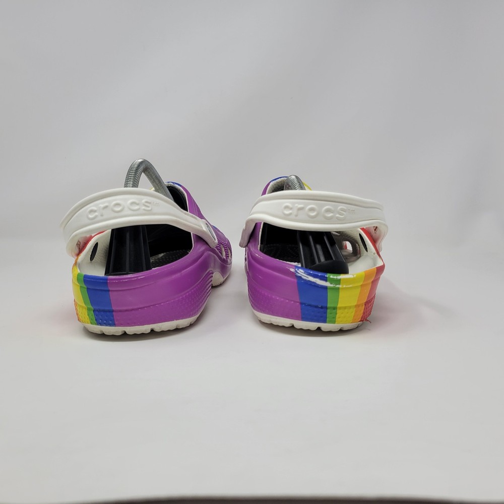 Crocs Men's Size 10 Women's Size 12 Rainbow Multi Pride Clogs Slip Ons Shoes are unisex round toe clogs with a multicolor rainbow pattern. They feature an ankle strap, logo accents, and are lightweight and breathable, making them suitable for travel, casual wear, work, and activewear. These synthetic clogs have a standard shoe width and a synthetic lining, with a synthetic upper and insole material. Perfect for those who appreciate art, hippie, bohemian, and outdoor themes. These shoes are in excellent “pre owned” condition. For more information, please see photos or feel free to contact me with any questions. All orders are shipped within 24 hours of payment received.