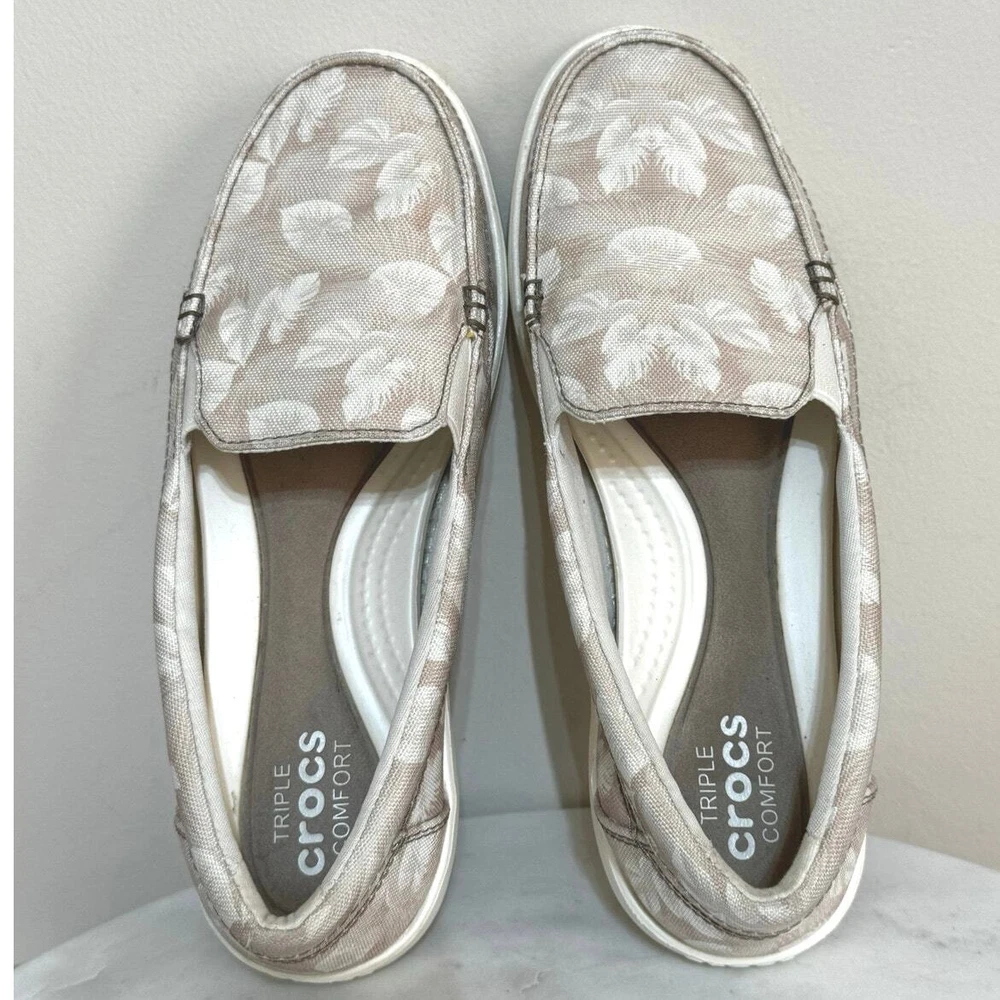 Crocs Walu II Women's Slip On Floral Canvas Boat Shoes Size 6 Beige & Ivory Print Canvas Upper Rubber Sole In excellent preowned condition No stains, rips, or holes Very clean! Shipped within one business day