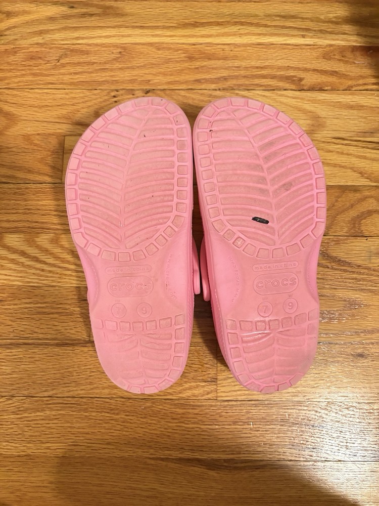 Crocs Women's 9 Men's 7 are pink clog-style shoes with a round toe shape and slip-on closure. They have a flat heel under 1 inch and feature the Crocs logo accent. These comfortable shoes are suitable for travel and casual occasions in summer and spring. The outsole and upper material are rubber, with a standard shoe width. Ideal for walking, they are part of the Comfort Slide product line.