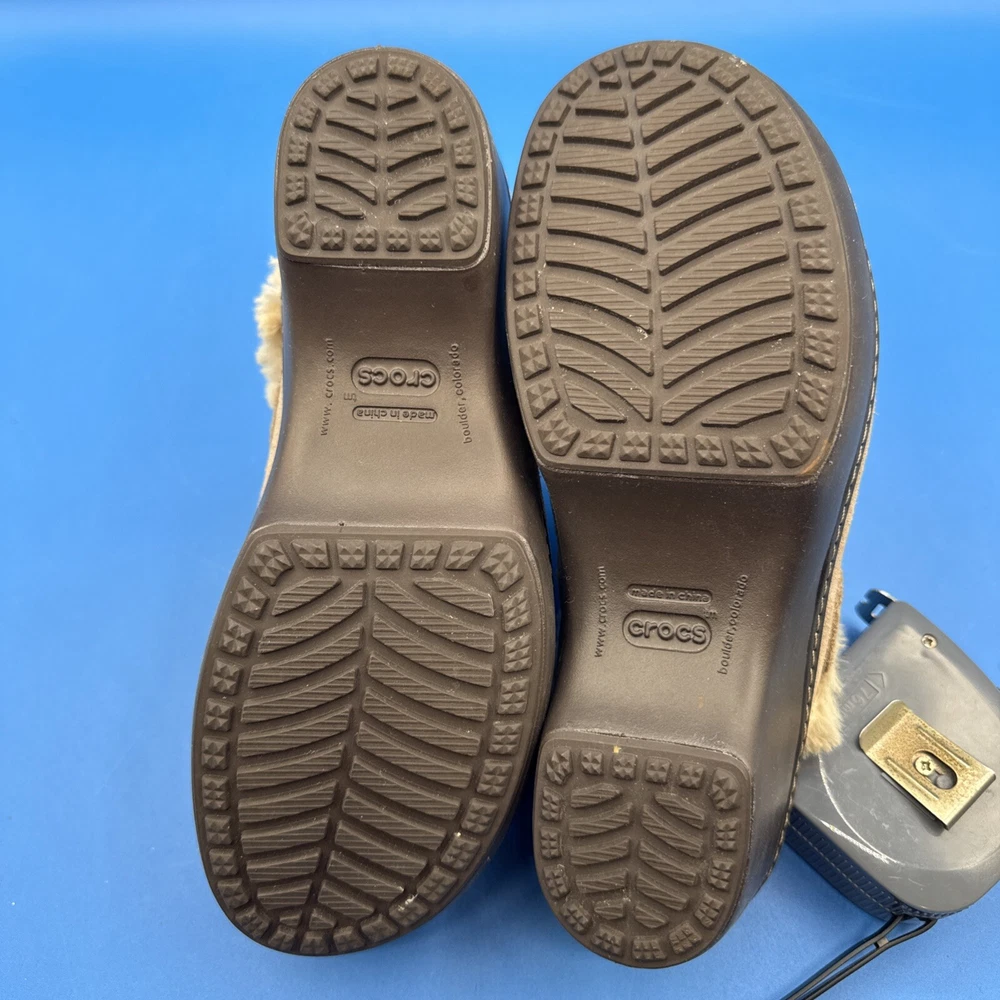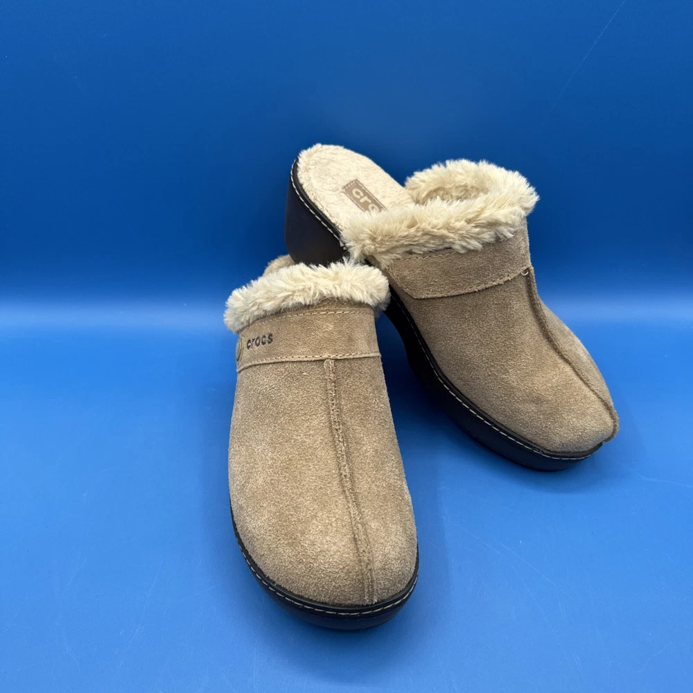 These Crocs Women's mule clogs are designed in brown suede with a faux fur lining for added comfort. They are slip-on style shoes with a faux suede outsole, perfect for casual wear. The size is women's 7, making them suitable for everyday use. Pre owned. Hardly used. No original box. Excellent condition. Size 7W. Please check the pictures carefully as part of the description. Feel free to ask questions if you need more information before you buy it. Thank you for your interest B-11