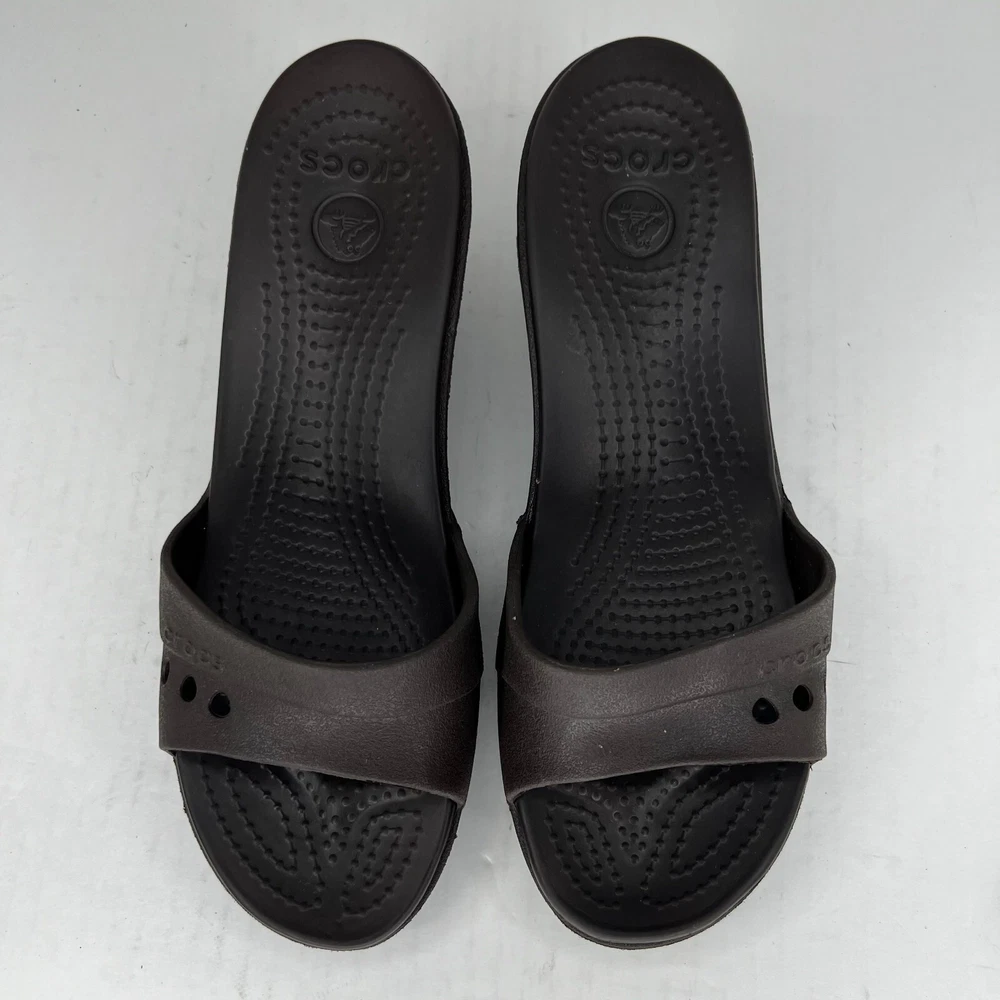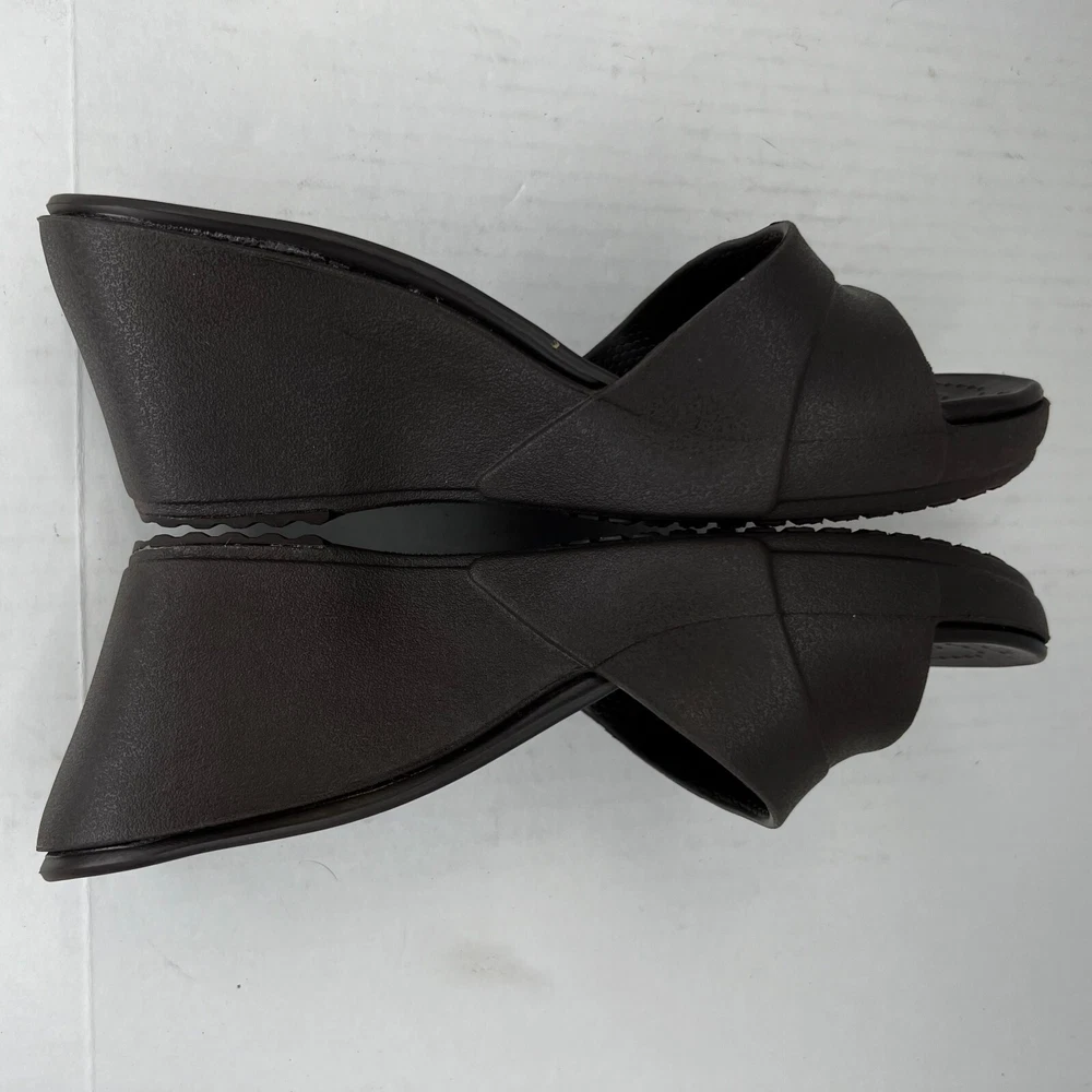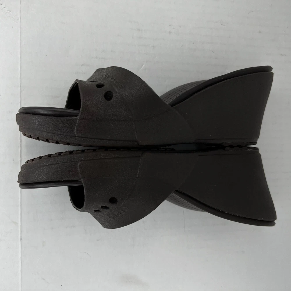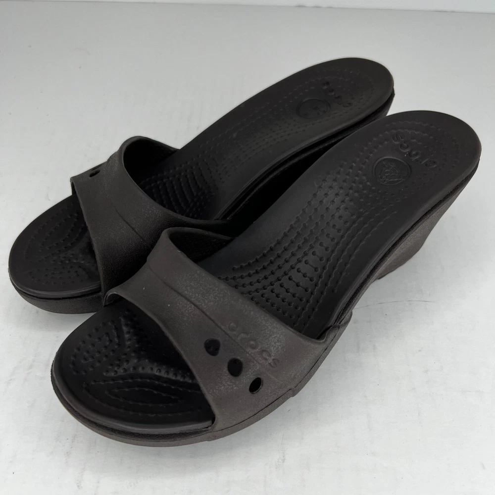 Elevate your shoe collection with these stylish slip-on wedge sandals from Crocs. Crafted with a solid black rubber upper and a comfortable mid-height wedge heel, these sandals are perfect for any occasion. The Kadee model features a logo accent on the top strap and a slip-on closure for easy wear. The synthetic lining and rubber insole provide all-day comfort, while the rubber outsole ensures durability and traction. These sandals are versatile enough to be worn in any season and are a great addition to any wardrobe. Don't miss out on the lightweight and comfortable design of the Crocs Kadee slip-on wedge sandals. 100% CUSTOMER SATISFACTION IS OUR GOAL! Our items are always carefully examined for condition, measured if necessary, and photographed in a climate controlled and smoke-free environment. We make every attempt to accurately describe and clearly picture the items we have for sale. Please, ALWAYS view all of the photos. We value your business and our goal is your complete satisfaction. FAST SHIPPING All items are packaged with care and shipped out the same or next business day via USPS, FEDEX, or UPS with tracking numbers so you are always informed. RETURNS We offer a 30-day return policy. All items must be unused and unopened in the condition in which they were received, with original packaging, and all accessories included for return. REVIEWS - CUSTOMER SATISFACTION - COMMUNICATION We aim to make you happy. After you receive your shipment, please leave a positive review . If you have concerns or questions about your order, please contact us so we can resolve the issue. We will do our best to make you satisfied. THANK YOU FOR YOUR BUSINESS!