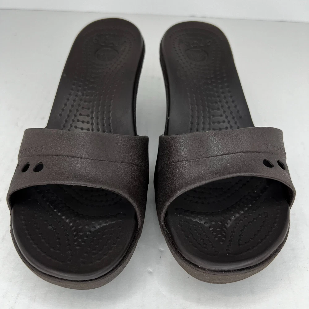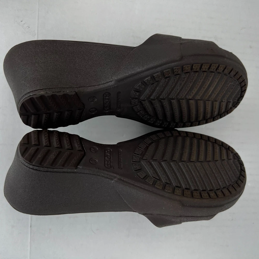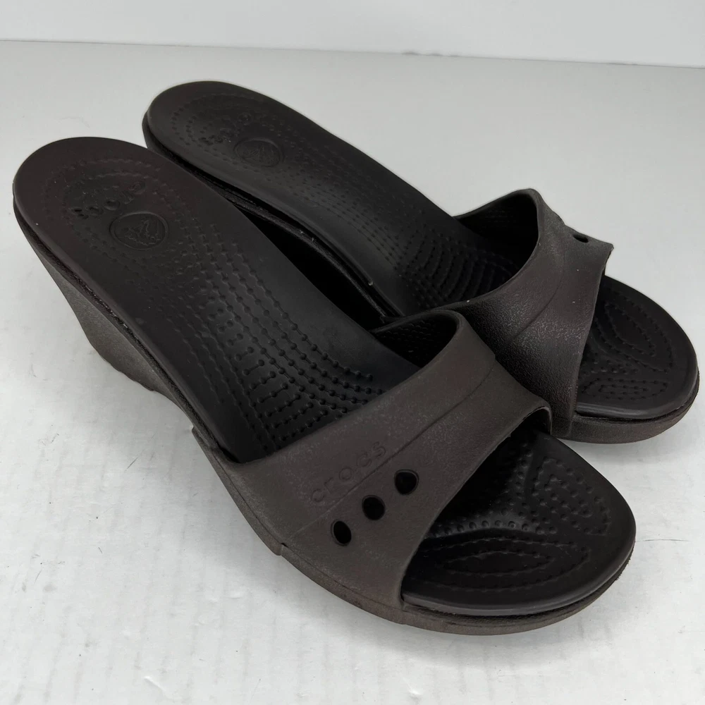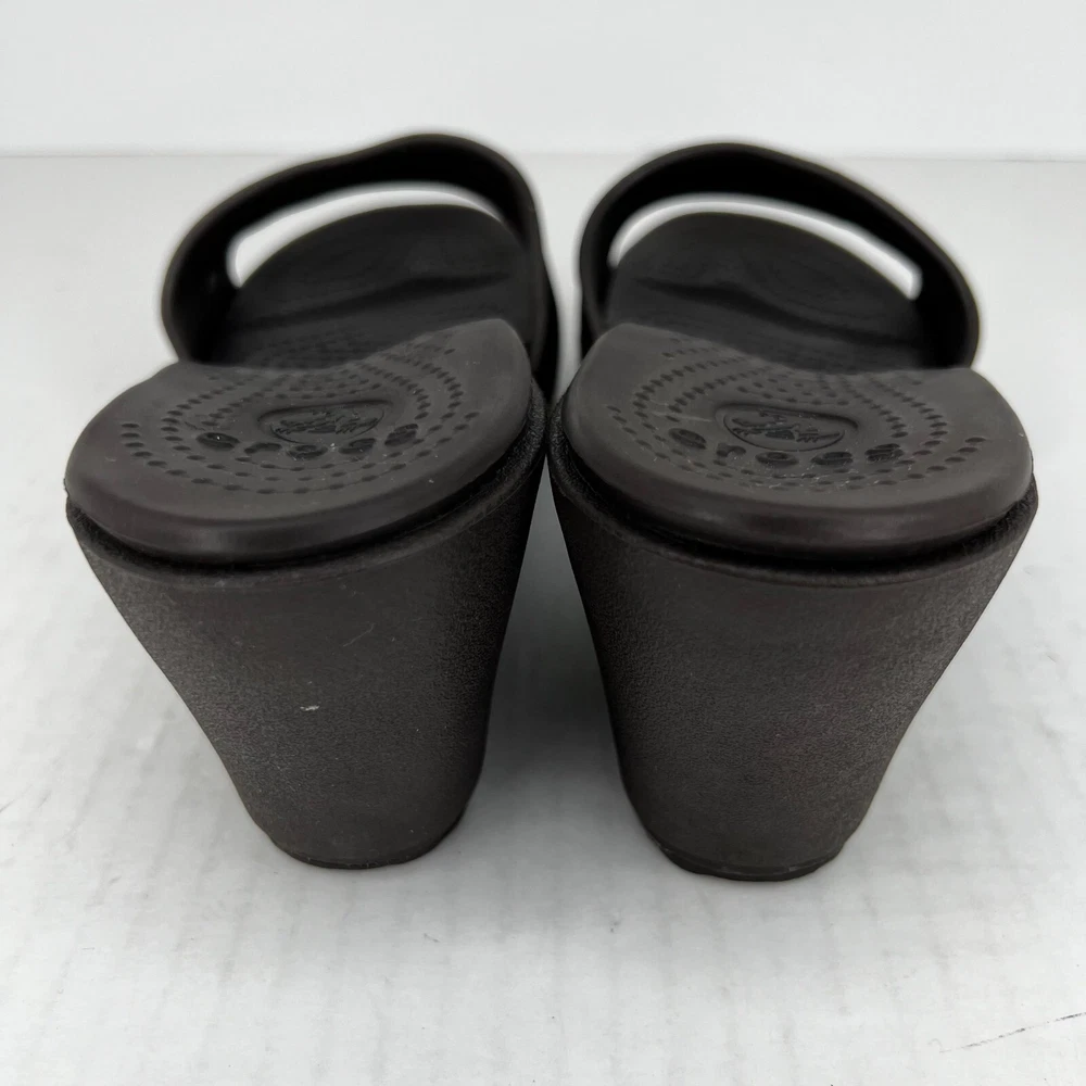 Elevate your shoe collection with these stylish slip-on wedge sandals from Crocs. Crafted with a solid black rubber upper and a comfortable mid-height wedge heel, these sandals are perfect for any occasion. The Kadee model features a logo accent on the top strap and a slip-on closure for easy wear. The synthetic lining and rubber insole provide all-day comfort, while the rubber outsole ensures durability and traction. These sandals are versatile enough to be worn in any season and are a great addition to any wardrobe. Don't miss out on the lightweight and comfortable design of the Crocs Kadee slip-on wedge sandals. 100% CUSTOMER SATISFACTION IS OUR GOAL! Our items are always carefully examined for condition, measured if necessary, and photographed in a climate controlled and smoke-free environment. We make every attempt to accurately describe and clearly picture the items we have for sale. Please, ALWAYS view all of the photos. We value your business and our goal is your complete satisfaction. FAST SHIPPING All items are packaged with care and shipped out the same or next business day via USPS, FEDEX, or UPS with tracking numbers so you are always informed. RETURNS We offer a 30-day return policy. All items must be unused and unopened in the condition in which they were received, with original packaging, and all accessories included for return. REVIEWS - CUSTOMER SATISFACTION - COMMUNICATION We aim to make you happy. After you receive your shipment, please leave a positive review . If you have concerns or questions about your order, please contact us so we can resolve the issue. We will do our best to make you satisfied. THANK YOU FOR YOUR BUSINESS!