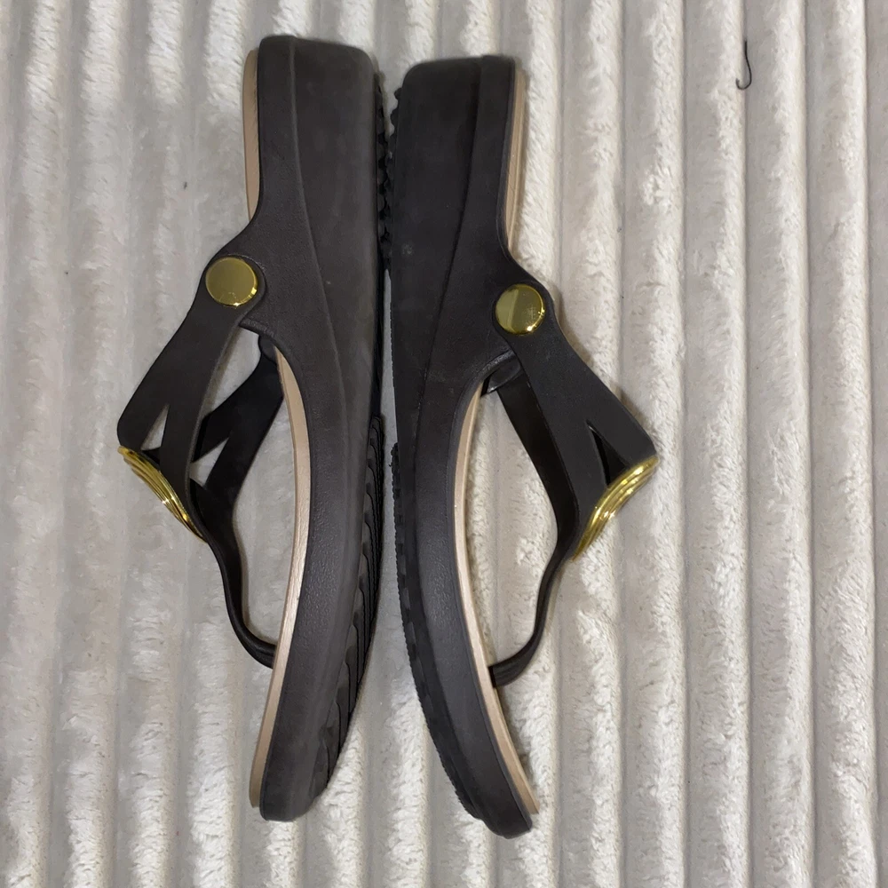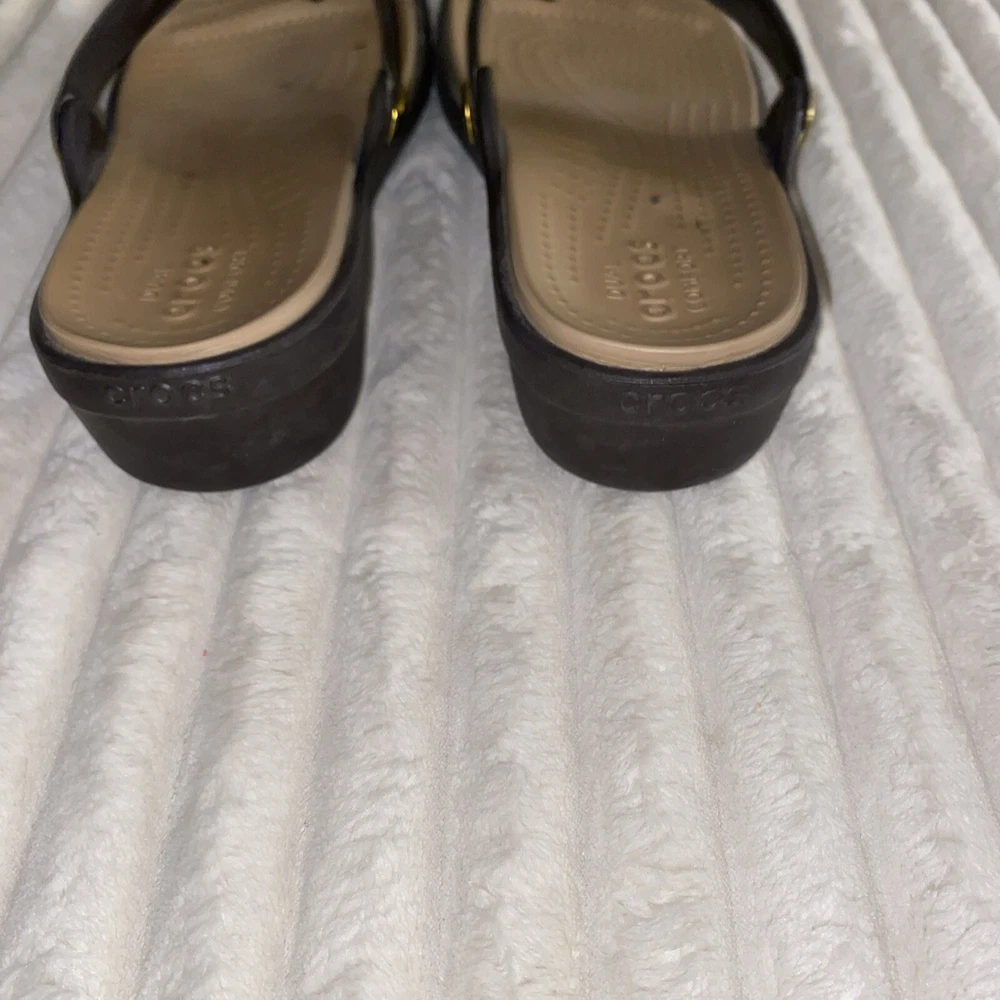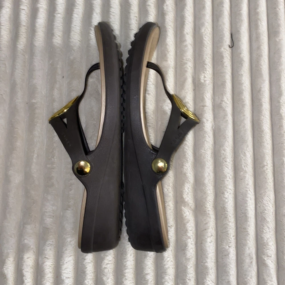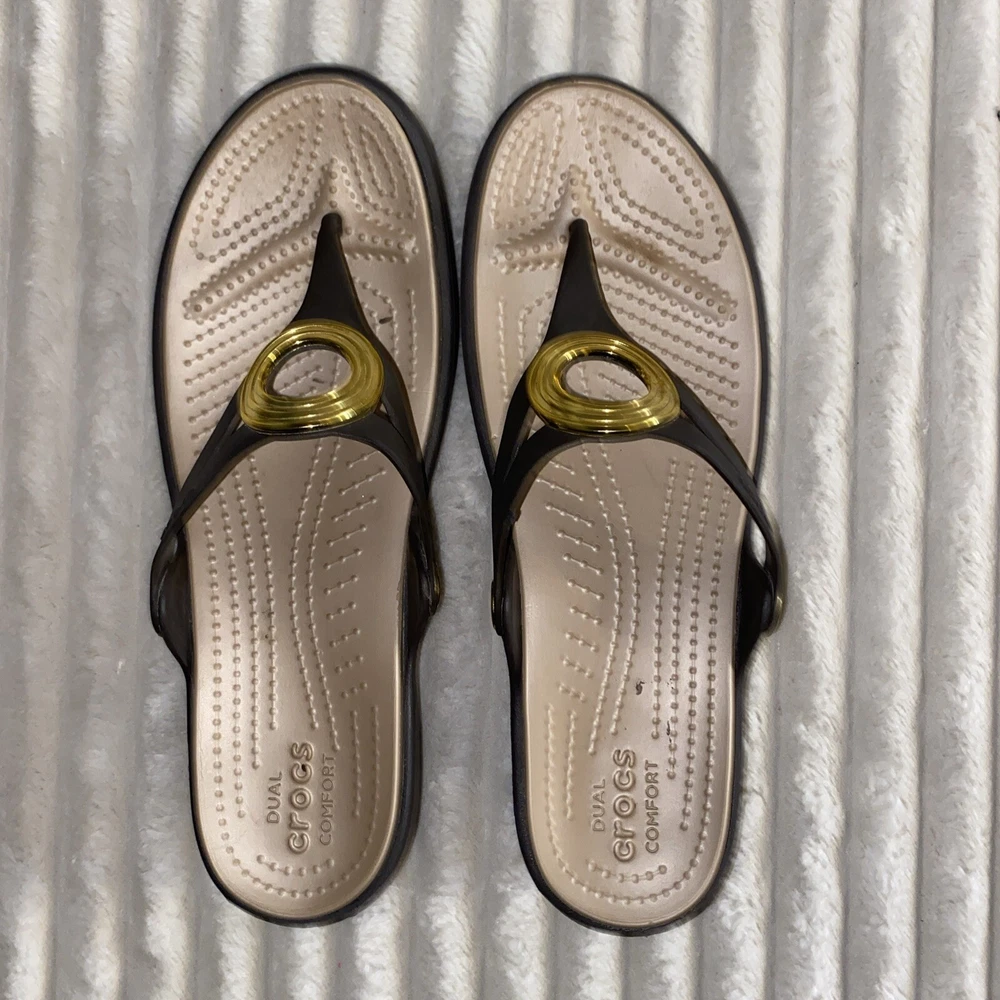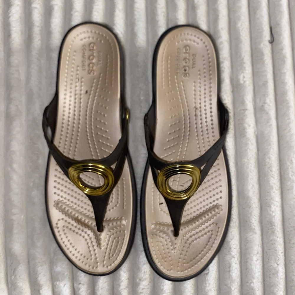 Crocs Women's Sanrah Silver Circle Slip On Thong Sandals in Brown, Size 10, are comfortable flip flops featuring medallion and logo accents. Made with a synthetic upper and outsole, they have a flat heel style and cushioned insole for added comfort. Ideal for travel or casual wear in any season, these gold sandals have a breathable lining and are perfect for outdoor activities. Brown with gold