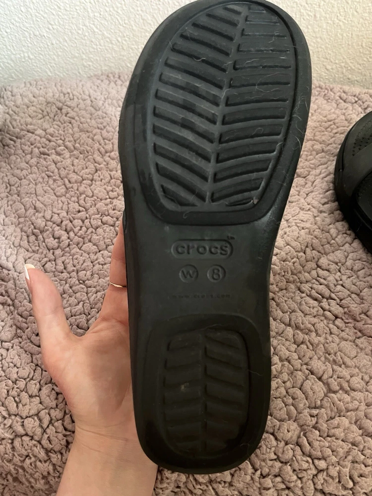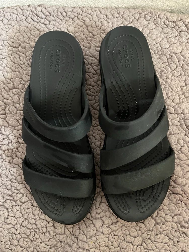 Crocs Women’s Size 9 Low Wedge Slip On Crocband Sandal Black White Stripe Accent