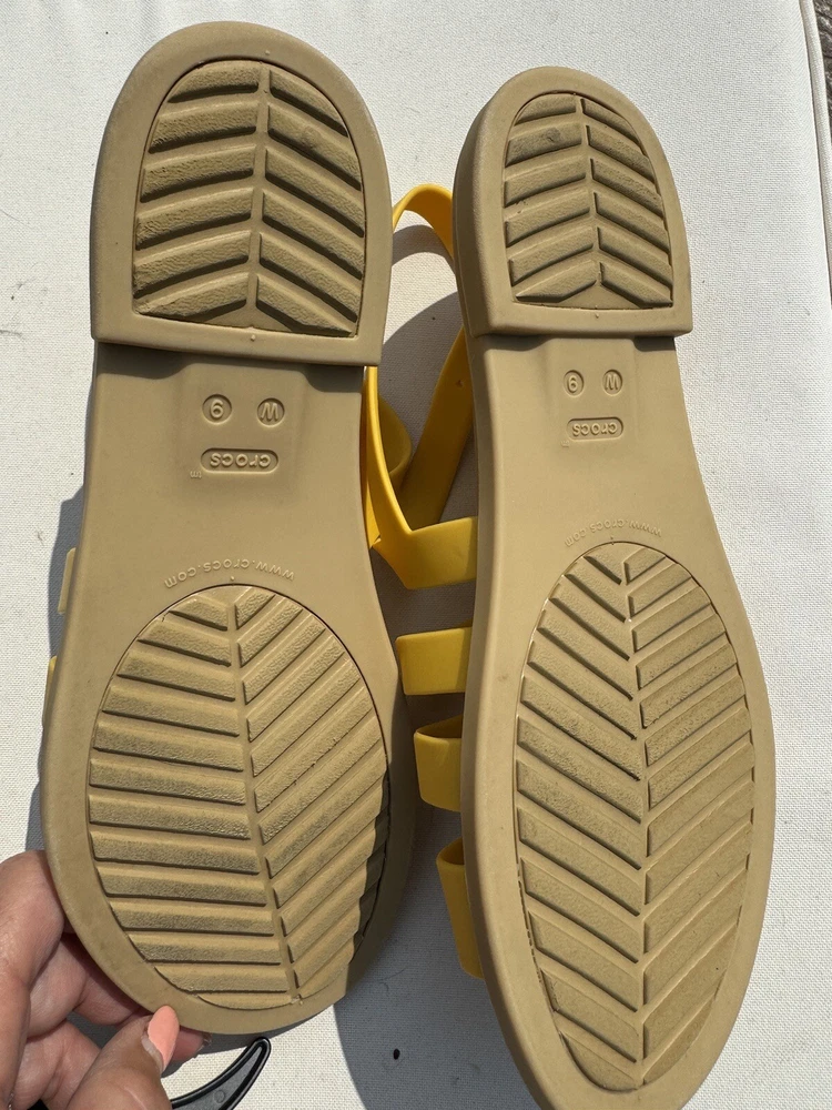 Elevate your summer look with these stylish Crocs flat sandals. Crafted with a synthetic upper material, these yellow sandals feature an adjustable buckle strap for a comfortable fit. The lightweight design and flat heel make them perfect for all-day wear. These sandals also come with a range of features, including a comfortable fit, adjustable strap, and a flat heel. Whether you're heading to the beach or running errands, these Crocs sandals are a versatile addition to your wardrobe. Get ready to step out in style this summer with these strappy flat sandals.