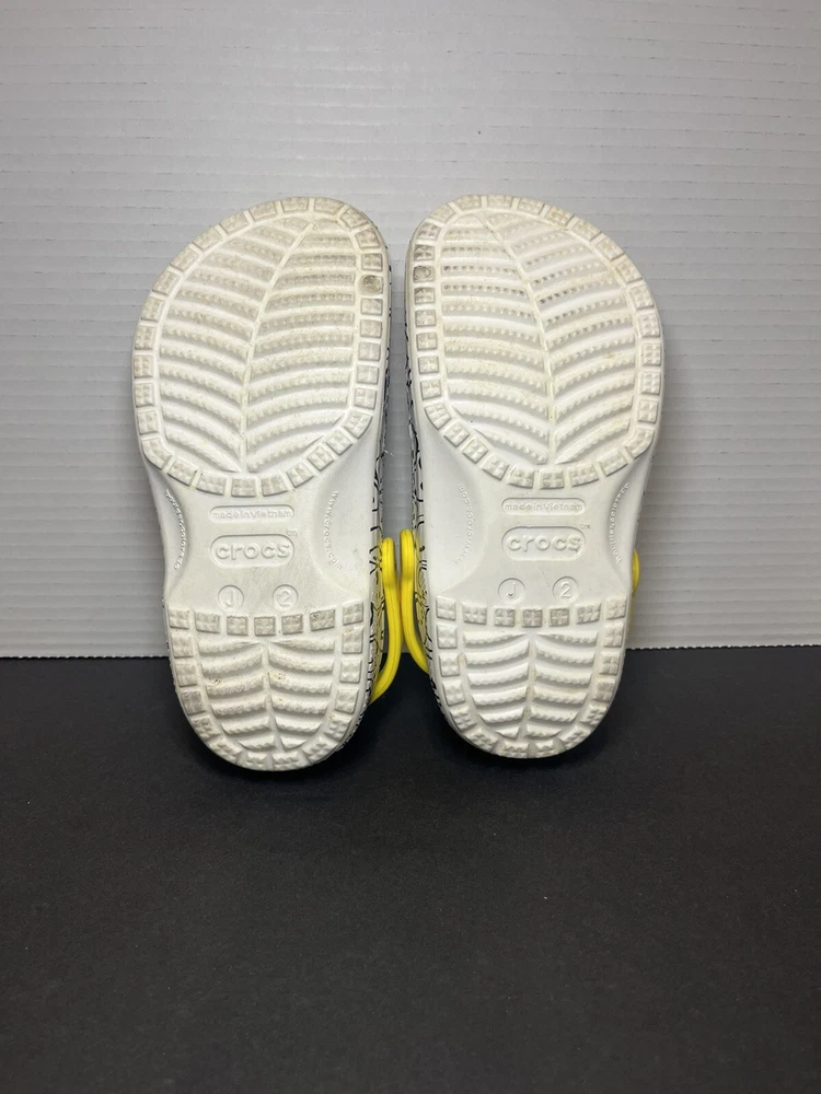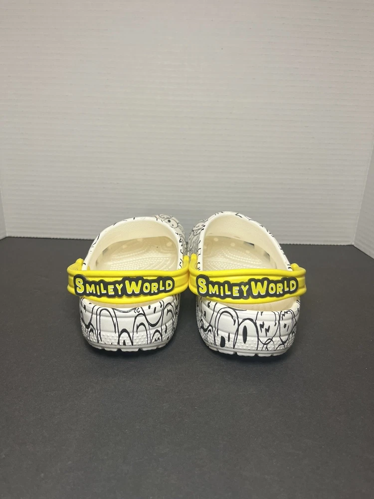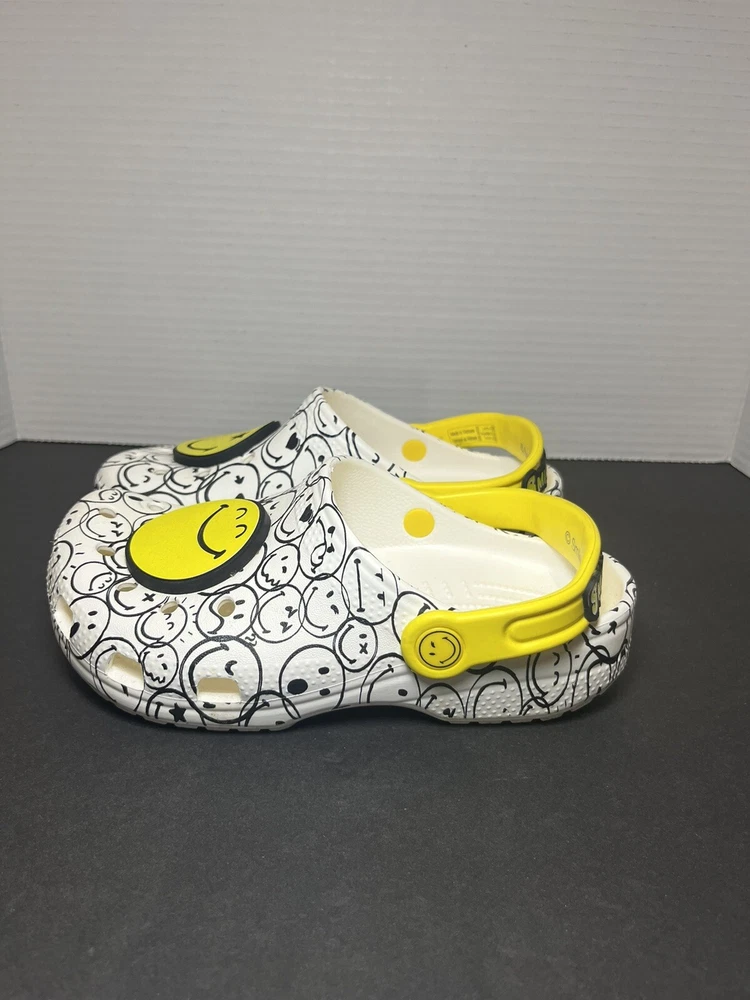 Elevate your child's footwear game with the Crocs X SmileyWorld Collab Classic Clog. This limited edition design features a round toe shape, slip-on closure, and a flat heel height of under 1 inch. The white color and happy, classic theme make it a perfect fit for any season, whether it's winter, summer, fall, or spring. The Crocs SmileyWorld Classic model is designed for comfort, breathability, and non-slip safety, making it an ideal choice for casual occasions. The ankle strap provides additional support, and the lightweight design ensures your child's feet stay comfortable all day long. Available in US shoe size 2 this unisex kids' shoe is a must-have addition to your child's wardrobe.