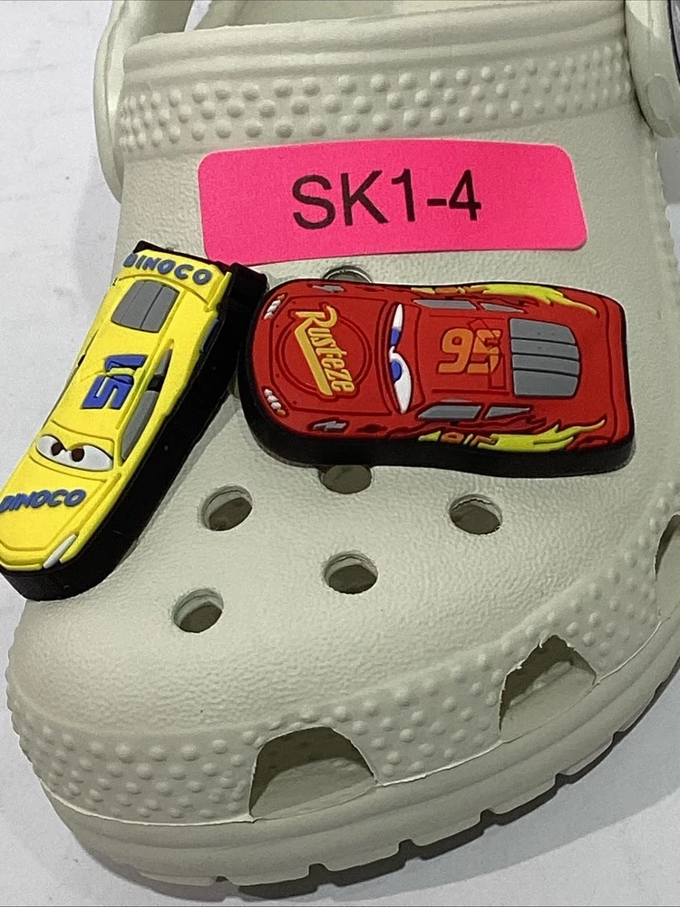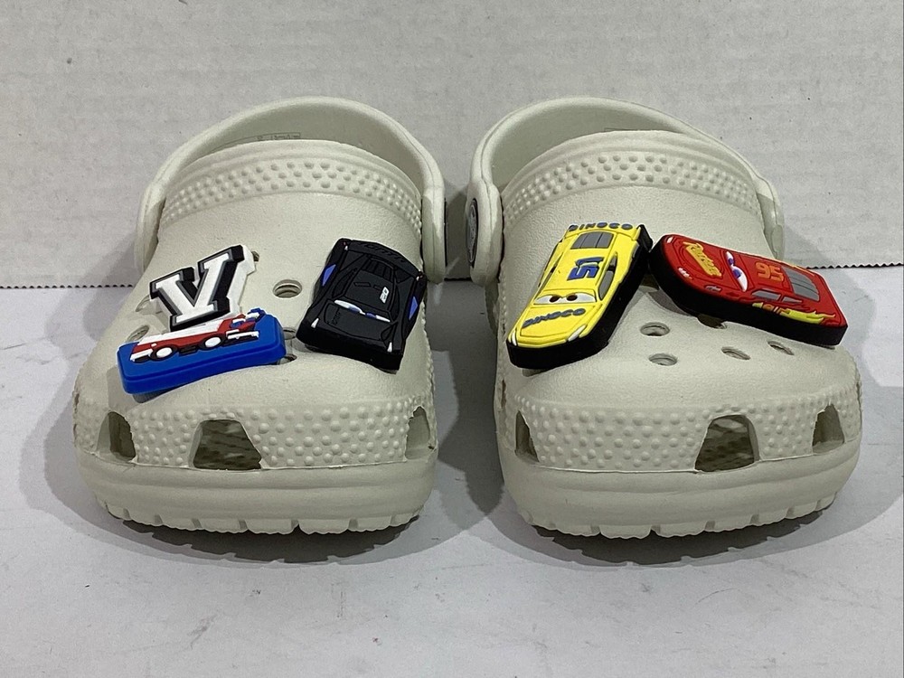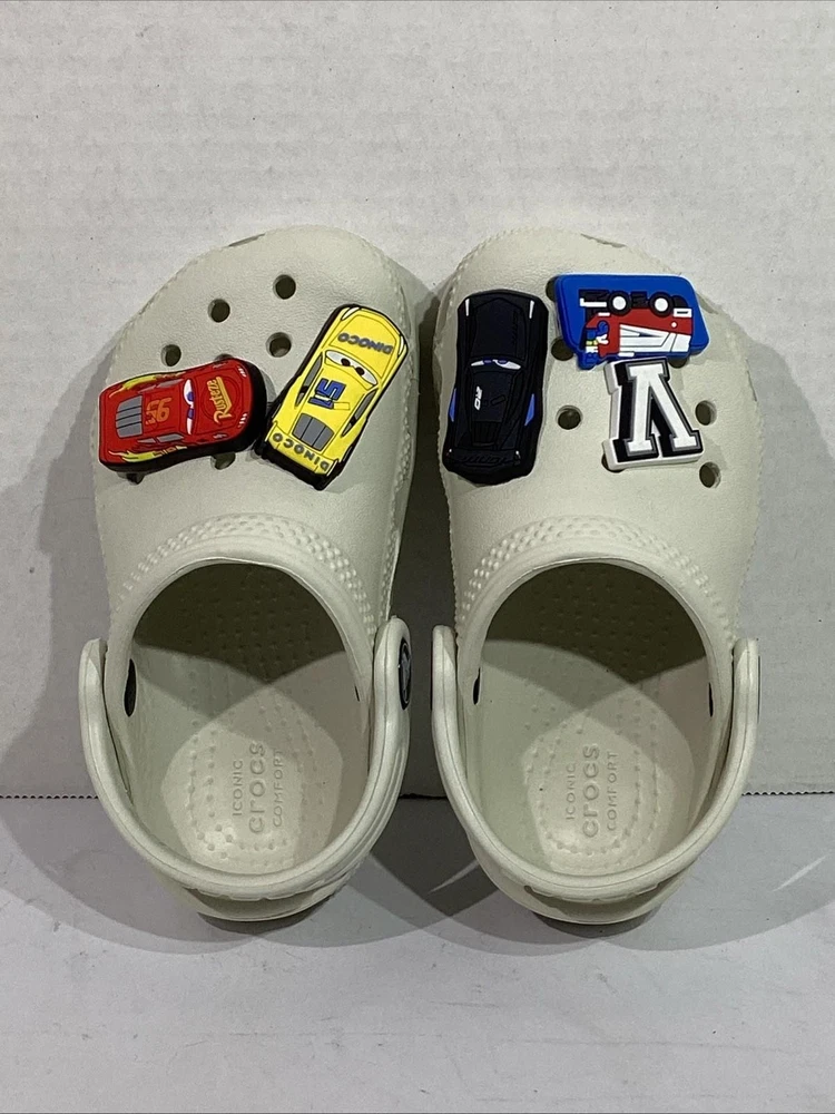 The product is a pair of Crocs youth size 7 gray clogs featuring 5 Disney Cars Jibbitz charms, including Lightning McQueen. These slip-on clogs have a low top design with a round toe shape and flat heel height, making them comfortable for casual wear. The standard shoe width and rubber upper material ensure a good fit for unisex kids. Perfect for the summer, fall, and spring seasons, these clogs are a fun and stylish choice for young fans of the Cars movie franchise. CONDITION: NEW without original Box. Additional details for this item can be found on the Manufacturer's website. CHECKOUT MY OTHER AUCTIONS........NEW ITEMS LISTED DAILY!! PLEASE LOOK AT ALL THE PICS CLOSELY FOR MORE DETAILS Highly popular Style, so bid QUICK & don't miss out! All Items come from a smoke-free, pet-free environment. "IF" shoes come with a box, it may need a little TLC due to storage & transit. All auctions must be paid within 3 days of ending. PayPal only accepted. Tennessee residents add 9.25% sales tax. INTERNATIONAL SHIPPING: We ship using Ebay's Global International Shipping program. All fees & pricing are calculated directly by Ebay, not the seller. We have no access to what Ebay charges or customs fees. RETURNS: We offer Ebay's 30-day Hassle-free Returns. Buyer pays return shipping. We process refunds less original shipping & a 10% restock fee. Exception: if you have a problem with your item, please contact us immediately, so that we can quickly resolve any "not as described" issues PRIOR to filing a claim with EBay. FEEDBACK: Your SATISFACTION is IMPORTANT to us! "Positive" feedback will be Automatically left once an item is paid. If you are HAPPY with your purchase........PLEASE leave us "Positive" Feedback & 5-star Detailed Seller Ratings. If you are UNHAPPY with your item or have any concerns, PLEASE contact us PRIOR to leaving Neutral or Negative feedback because we try our best to resolve any issues quickly. Listing and template services provided by inkFrog