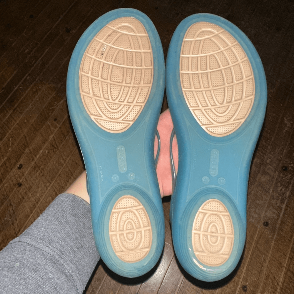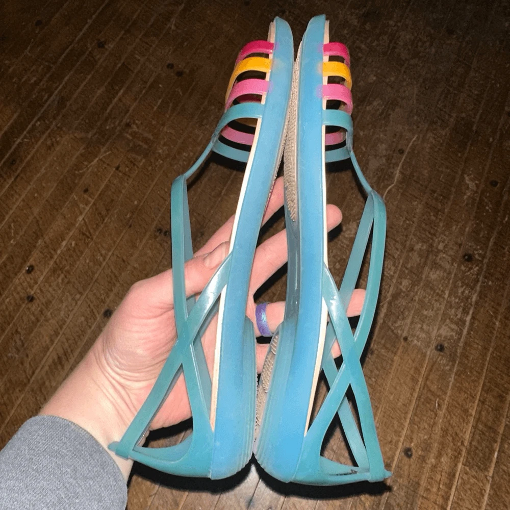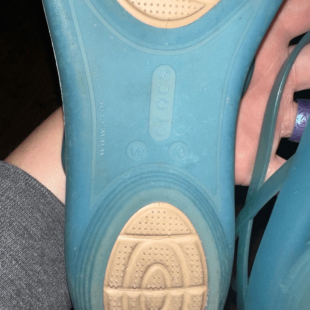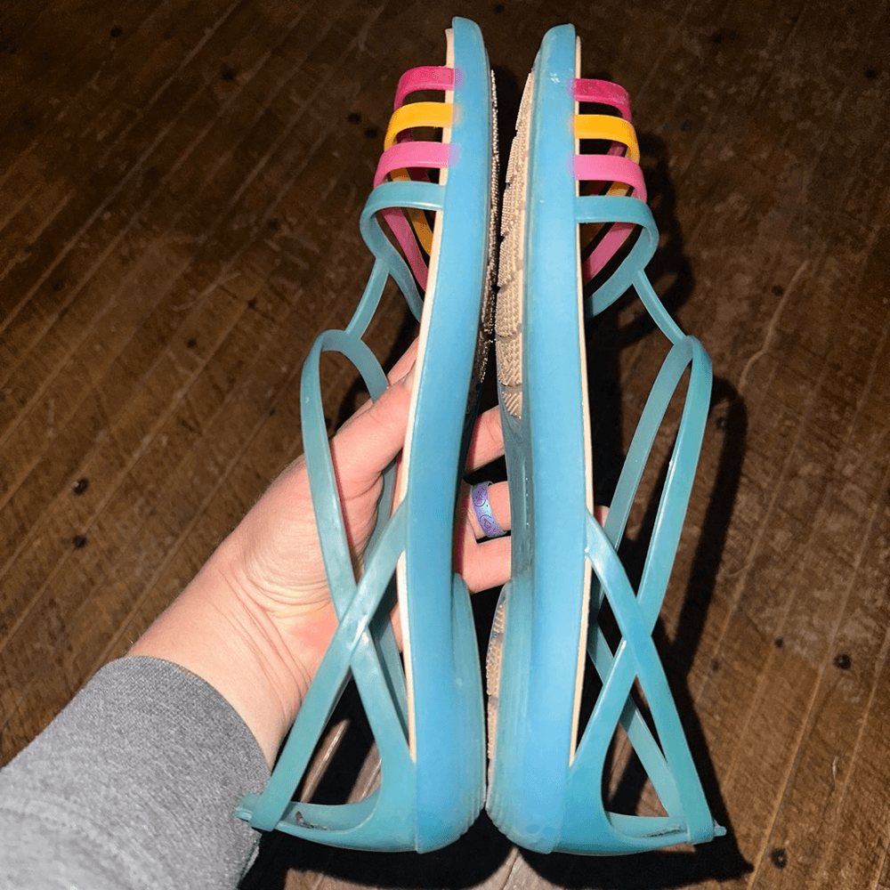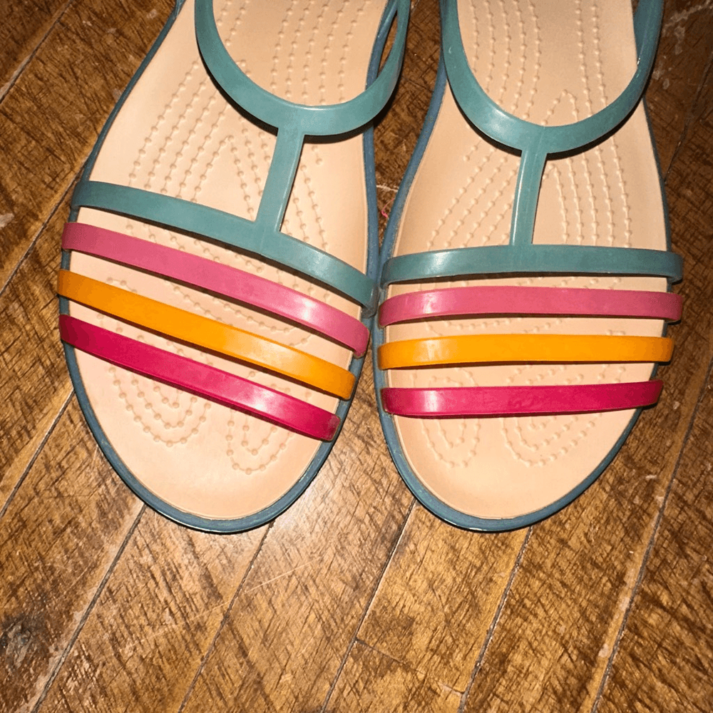 Crocs strappy, rainbow, rubber, washable, comfortable, nursing, ortho sandals. In good condition. From a pet and smoke free house.