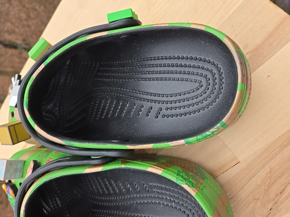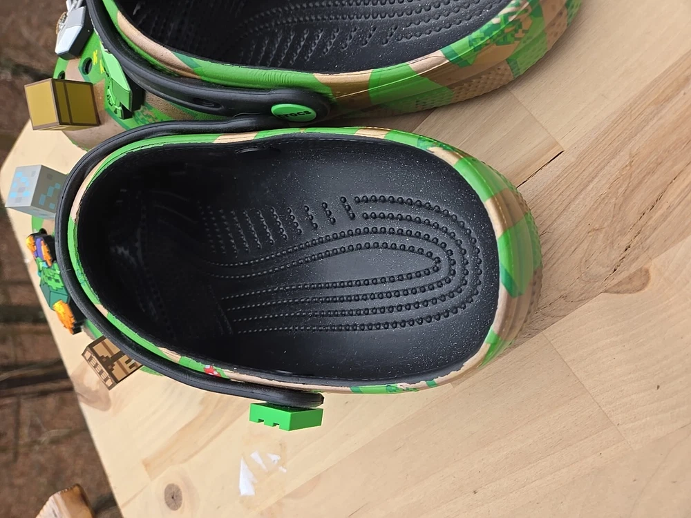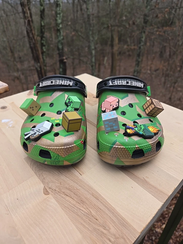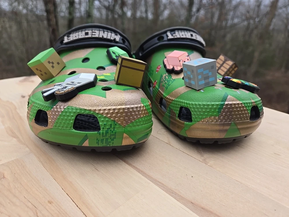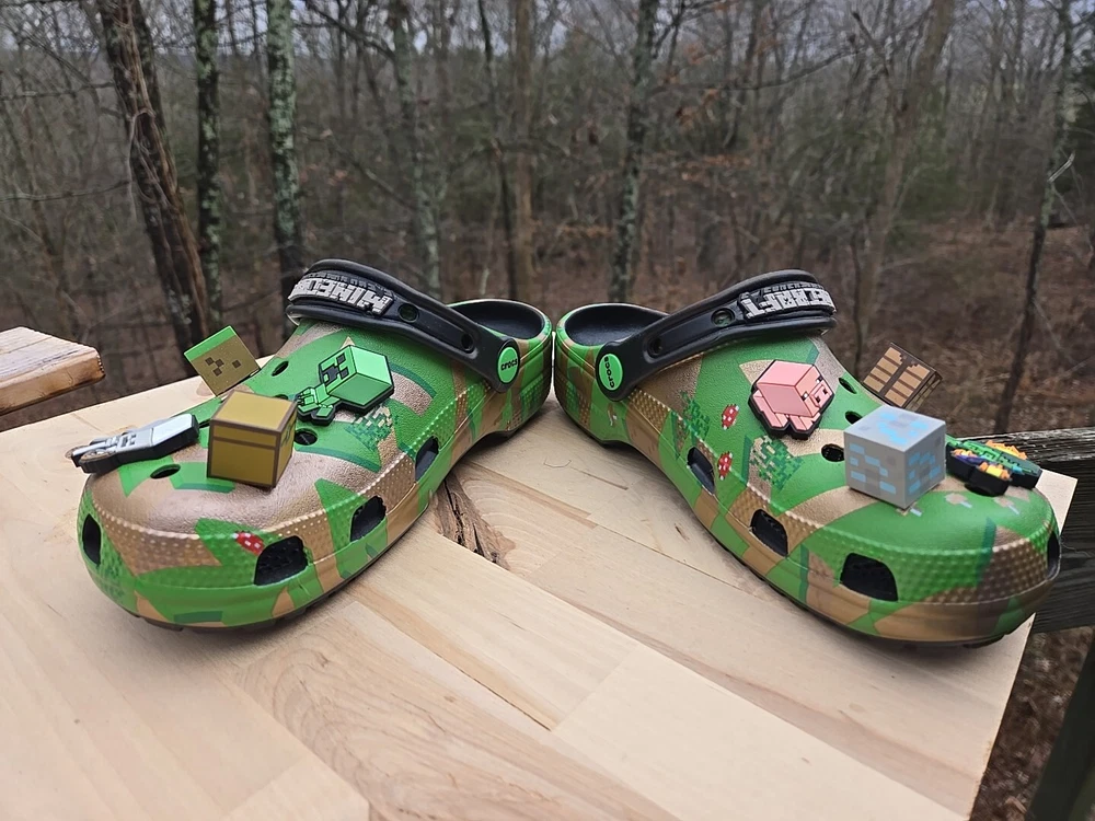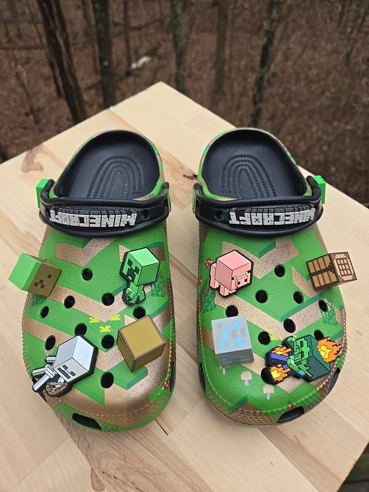 Elevate your casual shoe game with these Crocs x Minecraft Elevated Clogs in green. These limited edition clogs feature a camouflage pattern with Minecraft characters and ankle straps for a comfortable fit. The lightweight design makes them perfect for everyday wear, and the Crocs brand ensures durability. These shoes are customized and come with Jibbitz parts for added fun. They are perfect for casual occasions.