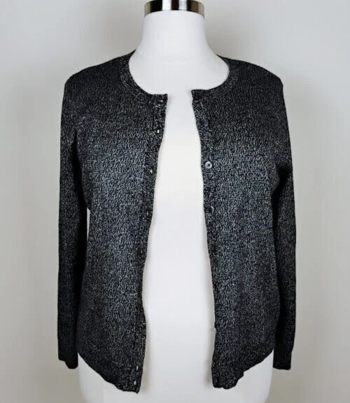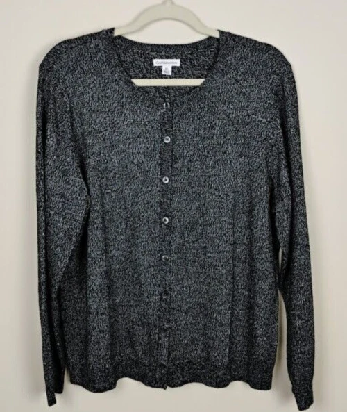 Features: All Seasons, Collarless Theme: Classic, College, Preppy, School, Teacher Personalize: No Color: Black Sleeve Type: Set In Season: Fall, Spring, Summer, Winter Brand: Croft & Barrow Fit: Classic Vintage: No Country/Region of Manufacture: China Style: Cardigan Type: Sweater Occasion: Business, Casual, Travel Garment Care: Machine Washable Sleeve Length: Long Sleeve Accents: Button Neckline: Round Neck Material: Acrylic Size: XL Fabric Type: Knit Department: Women Size Type: Regular Pattern: Marled Knit Style: Tight-Knit