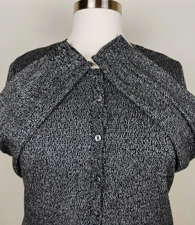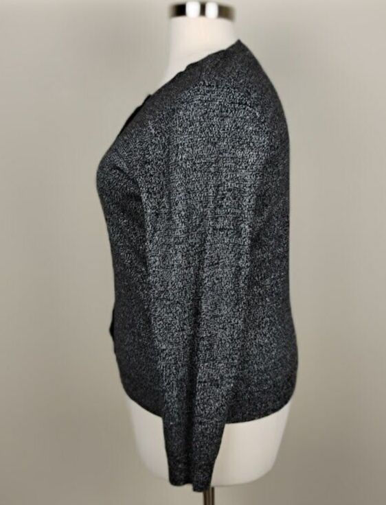 Classic cardigan for work or casual wear. Black and white knit creates a marled look. Cardigan has crew neck, long sleeves, button front and ribbed hem, cuffs and neck. Pair with jeans, slacks, skirts or dresses for a stylish finish to any outfit. SIZE: XL COLOR: Black FABRIC CONTENT: 100% acrylic STYLE: Cardigan CARE: Machine wash, dry flat CONDITION: Excellent pre-owned condition with no fading, stains, pilling, or holes/tears. Seems like it was never even worn. Please see photos for details. FLAT MEASUREMENTS (approximate) Underarm to Underarm: 22" Shoulder to Hem: 26" Sleeve Length: 24.5" Form measurements: Bust 46", Waist 38", Hips 48" If you have any questions, please don’t hesitate to ask. Thanks for viewing our listing! Teacher, career, church, capsule, neutral, easy care