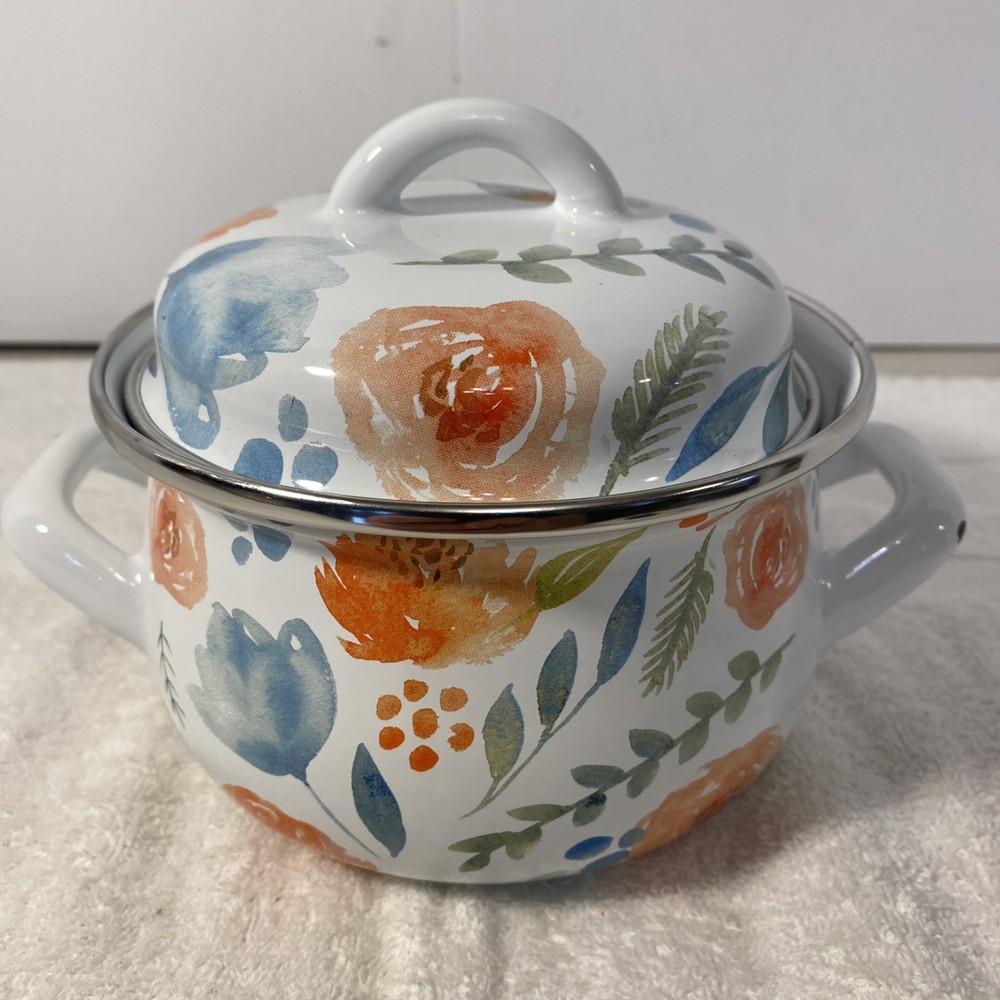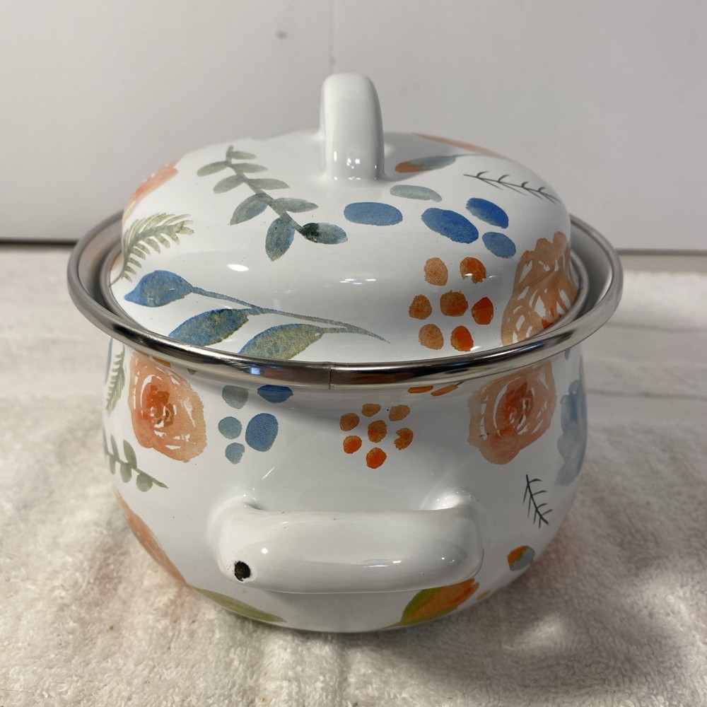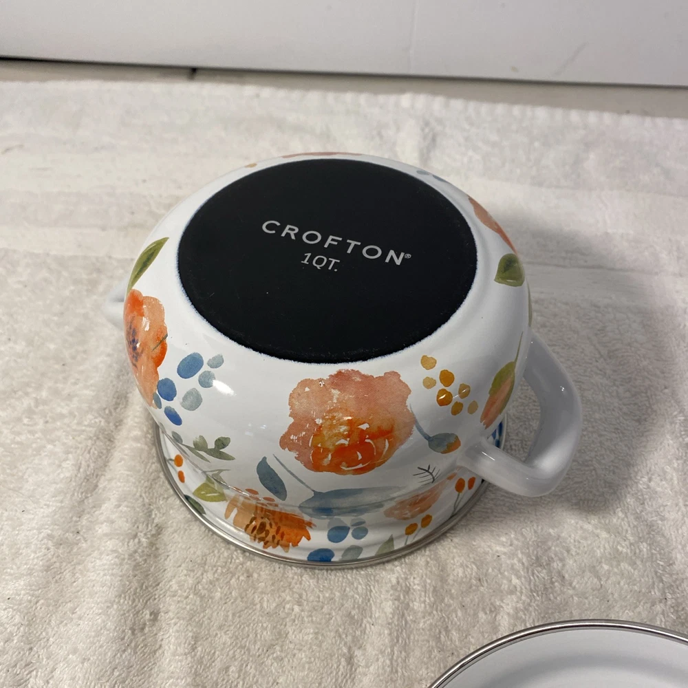 Crofton Casserole Pot Dutch Oven 1 Qt. Floral Enamelware Double Handle w/ Lid. Condition is Used. Shipped with USPS Ground Advantage.