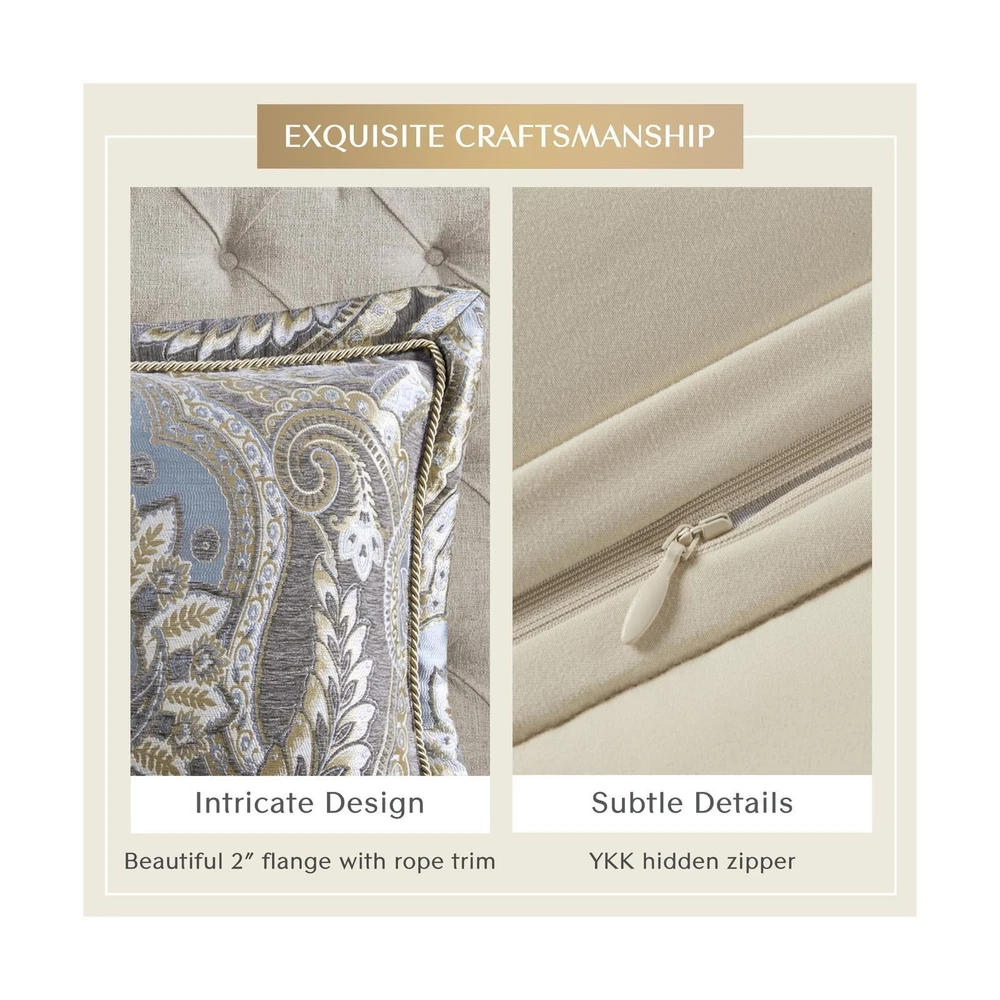 Croscill King Comforter Set, Luxe Chenille Jacquard Damask, Soft Microfiber Twill Comforter for a King-Size Bed, Oversized Comforter King Bedding, 2 Shams & Bedskirt, Julius, Blue/Grey 4 Piece Comforter and Sham Face: 100% Polyester Chenille Jacquard, Back: 100% Polyester Microfiber Twill Solid Dyed. Experience opulence with our Luxurious Bedding Set - a timeless blend of French 17th century inspired design. Immerse yourself in the lustrous comfort of a damask jacquard weave, evoking the classic opulent lifestyle with a touch of modern elegance Exquisite craftsmanship - Indulge in the luxurious and lavish comfort of a chenille jacquard weave paired with a soft microfiber twill reverse. Embrace cozy and intimate moments at home, surrounded by beauty and elegance crafted with meticulous attention High Quality - Discover perfection in our matching shams, featuring hidden zippers, a sophisticated flange with delicate rope trim. Elevate the design with a lustrous antique satin bedskirt; all with the assurance of high-quality Oeko-Tex certification Comforter set includes oversized: 1 Comforter: 110"W x 96"L, 2 King Shams: 20"W x 36"L + 2"D , 1 Bedskirt: 78"W x 80"L +15"D Care for your luxurious bedding with sophistication: Opt for dry cleaning for the comforter and shams, while the bedskirt revels in the ease of machine washing. (See sewn-in label for care instructions) Size King Included Components 1 Comforter, 2 King Shams, 1 Bedskirt Color Blue/Grey Style Traditional