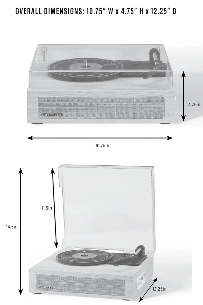 π Product Description Compact in size but not in sound, the Scout Record Player has all the features of a full-sized stereo system in a sleek, minimalist package. The belt-driven turntable boasts three speeds and a built-in speaker, plus a Bluetooth receiver for streaming when you are not in the mood for vinyl. And for times when you want to drown out the rest of the world, we've included a headphone jack for private listening. With a natural finish that mirrors the warmth of analog music, the Scout will add vintage style to your space. π Specifications size One Size color Walnut model CR6042A-WA style Retro material Wood itemWeight 6.45 pounds partNumber CR6042A-WA manufacturer Crosley productDimensions 13.3 x 5.0 x 12.2 inches β Fast Shipping | β Quality Guaranteed | β Customer Support 30-Day Returns β’ 100% Satisfaction