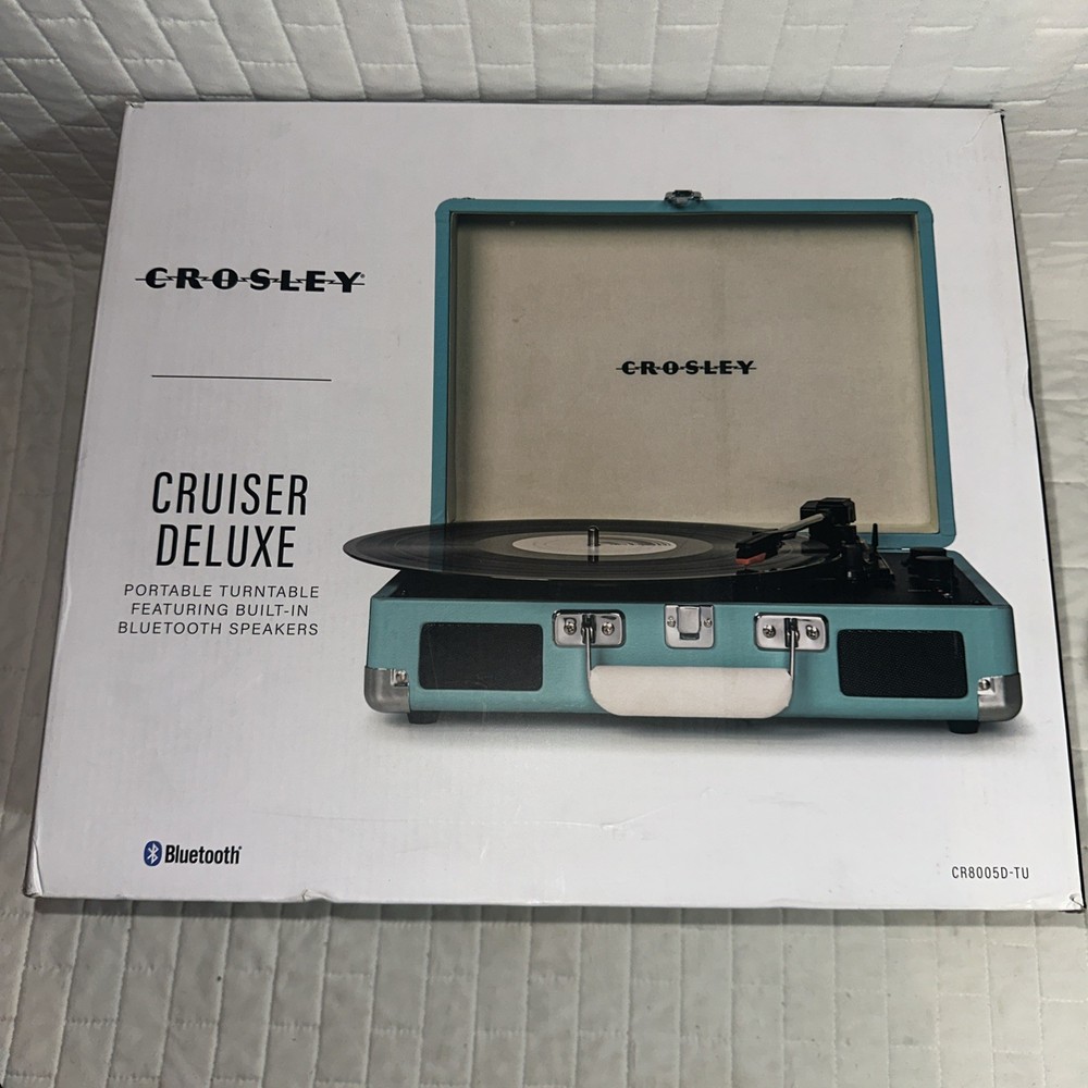 The Crosley Cruiser Deluxe 3 Spd Bluetooth Speaker/Record Player Cr8005d-tu in Turquoise is a versatile media player that combines classic turntable functionality with modern Bluetooth connectivity. With speed settings of 45RPM, 33.3RPM, and 78RPM, this model allows for playing vinyl records with precision and ease. The Bluetooth feature allows for streaming music wirelessly, while the headphone jack and digital coaxial RCA outputs provide various audio output options. The sleek design, featuring a tourmaline color and compact dimensions of 4.72 inches in height, make this Crosley turntable a stylish and functional addition to any home audio setup.