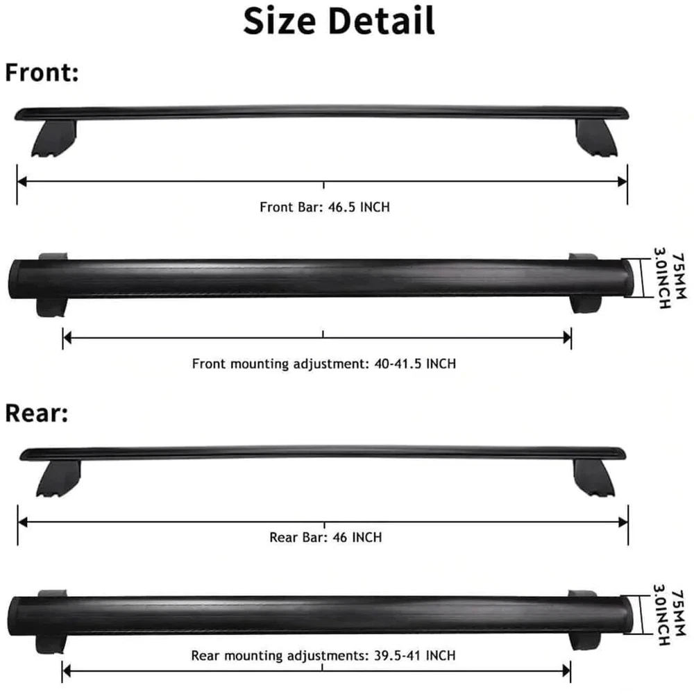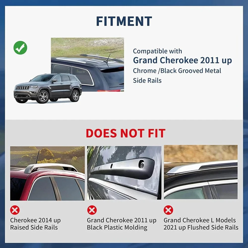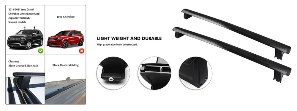 NEW IN (OPEN) BOX ~ YITAMOTOR 2011-2021 JeepGrand Cherokee Cross Bars Roof Racks Aluminum Roof Rail Luggage Carrier Bar Retail Price: $125! SKU: YZ1001W007 DESCRIPTION: YITAMOTOR specializes in the production of automotive partsand has been doing this for many years. We offer a wide range of auto partsproduction lines for your car, SUV, van, or truck. Our goal is to provide ourcustomers with reliable advice and real-world solutions for repairing andreplacing automotive parts. We pride ourselves on providing quality automotiveparts. FITMENT: 2011-2021 Jeep Grand Cherokee, vehicles with CHROME SIDERAILS (GROOVED SIDE RAILS) Professional installation would be highly recommended. FEATURES: The front crossbar is a little longer than the rear one toaccommodate vehicle size. Streamline appearance with anti-theft lock design, mountedon the side rails. The perfect solution to hold luggage, cargo, and snowboardon the roof when going on a trip. The special T-slot design, helps you carry your luggage,boxes, bikes, snowboards, kayaks, and canoes easily. Easy to install & dismantle in minutes with theinstallation guide. No drilling is necessary. INSTALLATION MANUAL: Slightly open the crossbar cover. Remove the pre-assembled screw from the bar. Attach the two crossbars onto the rail. The front crossbaris a little longer than the rear one. Secure the crossbars. Press down on the crossbar cover. NOTE: 1. Please check that this product fits your vehicle beforeinstalling it.NOT Fit Altitude and SRT models 2. The Front crossbar is longer than the Rear one to fitthe vehicle, and there are no labels in it, please check before install. 3. Check the roof rack cross bar mounting bolts frequentlyand re-tighten them if necessary. 4. Distribute the weight of the cargo evenly, and do notexceed the maximum weight capacity of 150 lbs(68kg). Brand: YITAMOTOR Max Load Capacity: 150 LBS (68 KG) Color: Black Front Cross Bar Length: Approx 46.5"/1181MM Rear Cross Bar Length: Approx 46"/1168MM Height: 93MM Special Features: Anti-Theft Lock, Waterproof Material: High-grade Aluminum Package Includes: 2 roof rack cross bars; 1 installationguide; Accessories as the picture shown