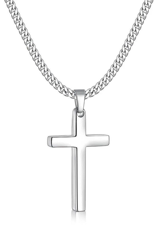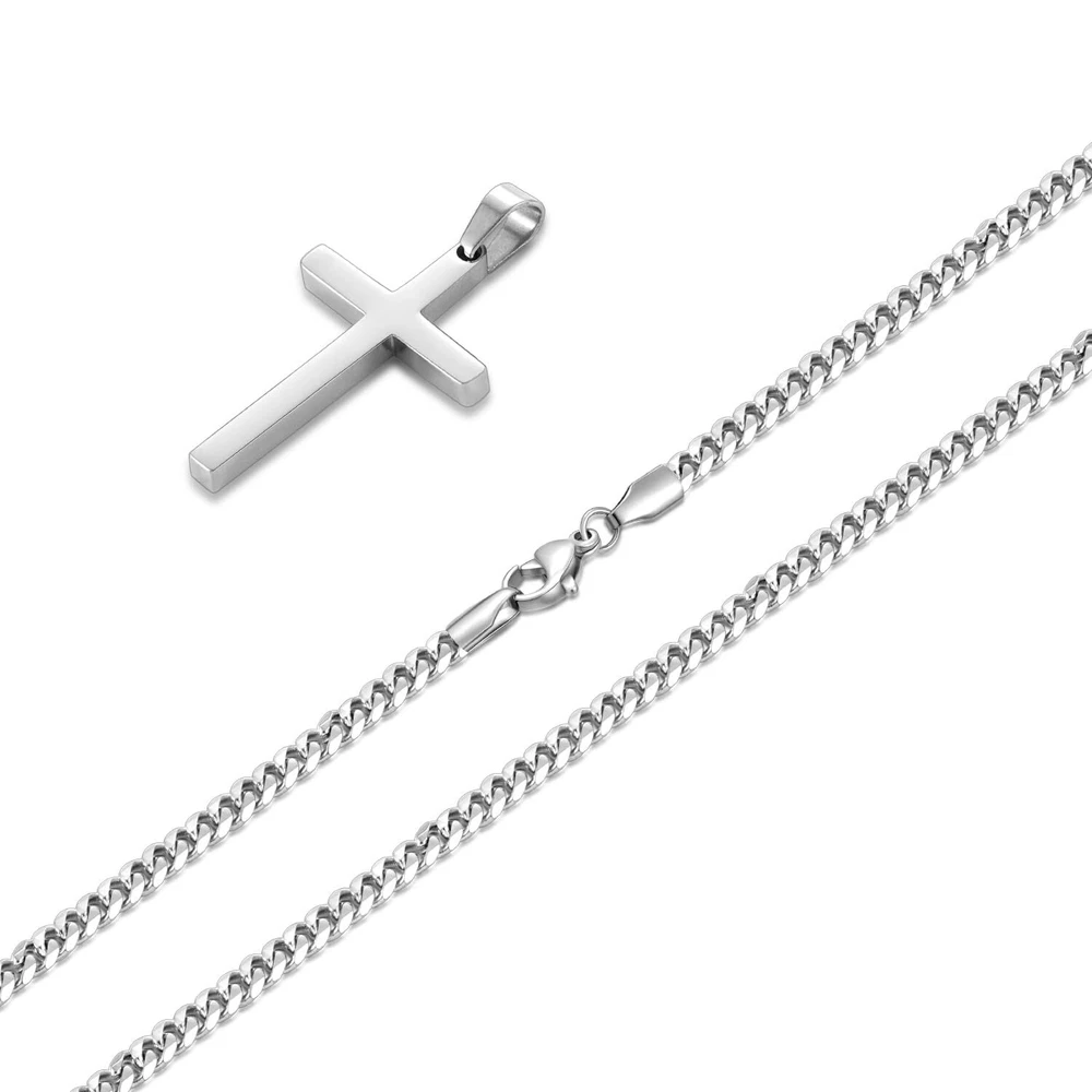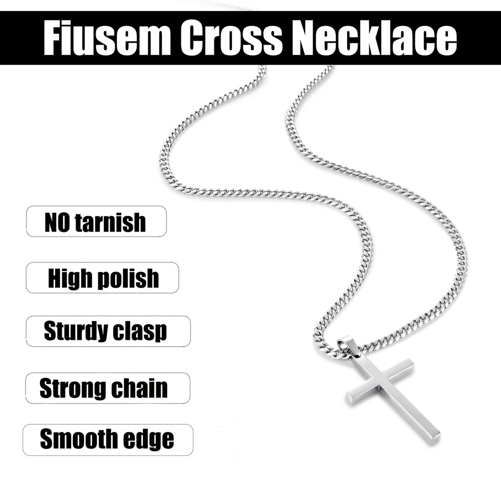 Mens Cross Necklace Specification: Type: Cross Necklace for Men Color: Gold/Black/Silver Tone Size: 3.5mm width Chain, 16"-24" length Chain: Cuban Pendant: 0.8"*0.4" tiny 1.2" * 0.7" small cross, 1.8" * 1.0" medium cross, 2.1" * 1.2" big cross Material: 316L Stainless Steel Clasp: Lobster Claw Clasp Applicable: Men Women Girls and Boys cross chain Package: Gold/Black/Silver Tone Cross Necklace for Men*1 Bright blue gift box*1 Thank You Card*1 Necklace for Boys, wear it every day: ✔ Hypoallergenic ✔ Sturdiness ✔ High quality ✔ Giftable ✔ Craftsmanship ✔ Not tangled ✔ Last long time Sturdy: High-316L stainless steel cross chain for men, sturdy mens necklaces for everyday wear Hypoallergenic: Smooth touch and hypoallergenic silver tone cross necklaces for men, comfortable for your sensitive skin, siutable to wear in daily life Craftsmanship: Diamond-cut and polished cross necklace, more reflective and shiny than standard stainless steel necklace for men Perfect size: Light weight 1.2*0.7" cross pendant, 3.5mm width 20" length mens silver tone chain. Wear alone or layered for a personal statement Jewelry for him/her: cross necklace packaged with a delicate jewelry box, great jewelry ideas for men, women on birthday, anniversary, Christmas etc.
