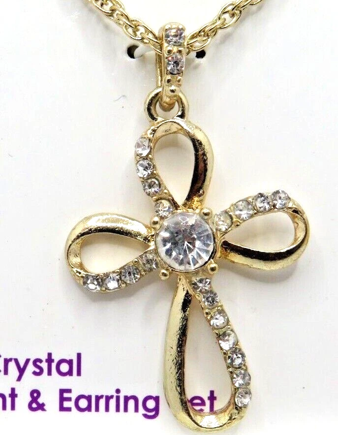 Genuine Crystal Cross Gold tone 18’ Pendant And Earring Set Thanks for looking.. Please review photos closely. Message me for any questions you have.