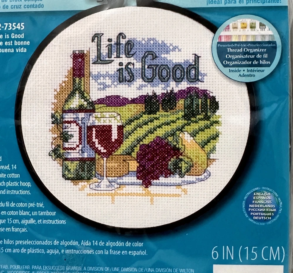 Cross Stitch Kit w/ 6" Round Frame "Life is Good", Dimensions Learn a Craft. NEW