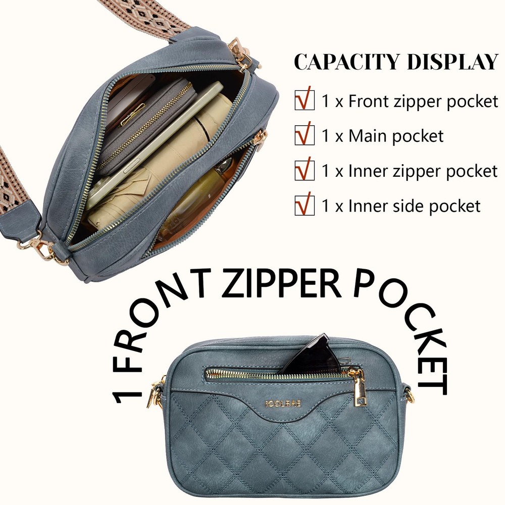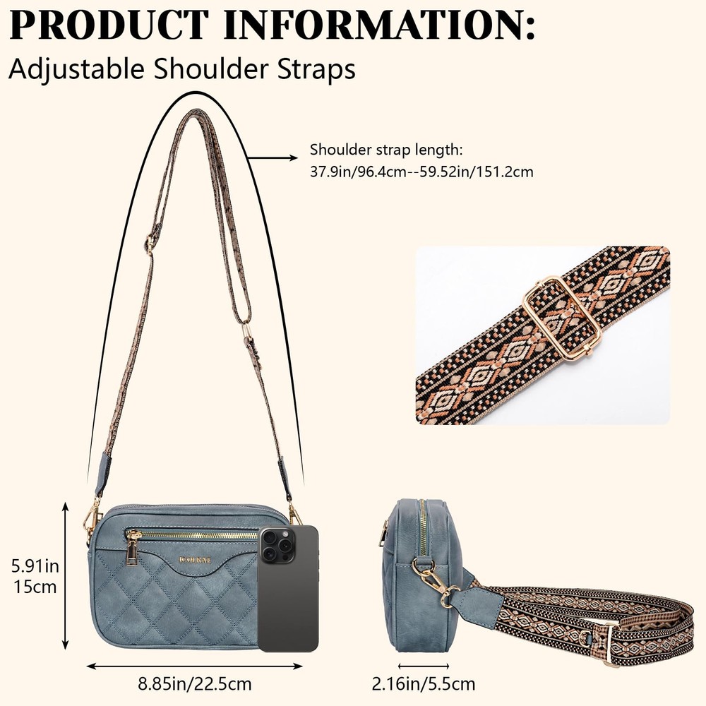 Blending style and functionality, crossbody bags for women with quilted vegan leather and a classic design—ideal for daily outings, trips, or errands. Measuring 8.85"(L) x 2.16"(W) x 5.91"(H), this women’s crossbody bag fits your phone (even large models), wallet, keys, and essentials, offering just enough space without bulk. The adjustable strap (37.9"-59.52") lets you switch between crossbody (hands-free) and shoulder carry, ensuring comfort for all. Crafted from waterproof, anti-peel synthetic leather, it’s durable and easy to clean; peach-skin velvet lining protects belongings, while gold-tone hardware adds elegance. Main pocket, inner/outer zippers, it keeps items organized—no more digging. It’s lightweight for all-day carry. Perfect as a Valentine’s Day, Mother’s Day, or birthday gift, crossbody bag merges quality, modern design, and practicality—essential for fashion-savvy women. ★【Stylish & Functional Design】 This trendy crossbody bags for women has beautiful quilted, compact and lightweight. It is made from soft vegan leather and feels soft to the touch. Smooth fabric interior prevents scratching items inside, and a wide adjustable strap for all-day comfort. ★【Multi-functional Pocket】 The women crossbody purse equipped with 2 zipper pockets, including a front zipper pocket, a main zipper pocket with an inner zipper pocket and an inner side pocket, can carry your phone, wallet, keys, sunglasses and makeup without clutter. ★【RFID Blocking Protection】 Safeguard credit cards & passports from digital theft with effective RFID-blocking lining, ensuring the safety of your personal information during travels or daily commutes. ★【Adjustable & Secure】 The small shoulder bag is 8.85"(L) x 2.16"(W) x 5.91"(H) in size. 37.9"-59.52" detachable guitar strap for crossbody, shoulder, or clutch wear. Zippered pockets protect essentials from pickpockets. ★【Ideal Choice】 The women's crossbody handbag will be your stylish companion for dating, shopping, travel, hiking or work. Ideal for birthdays, holidays, or everyday use.