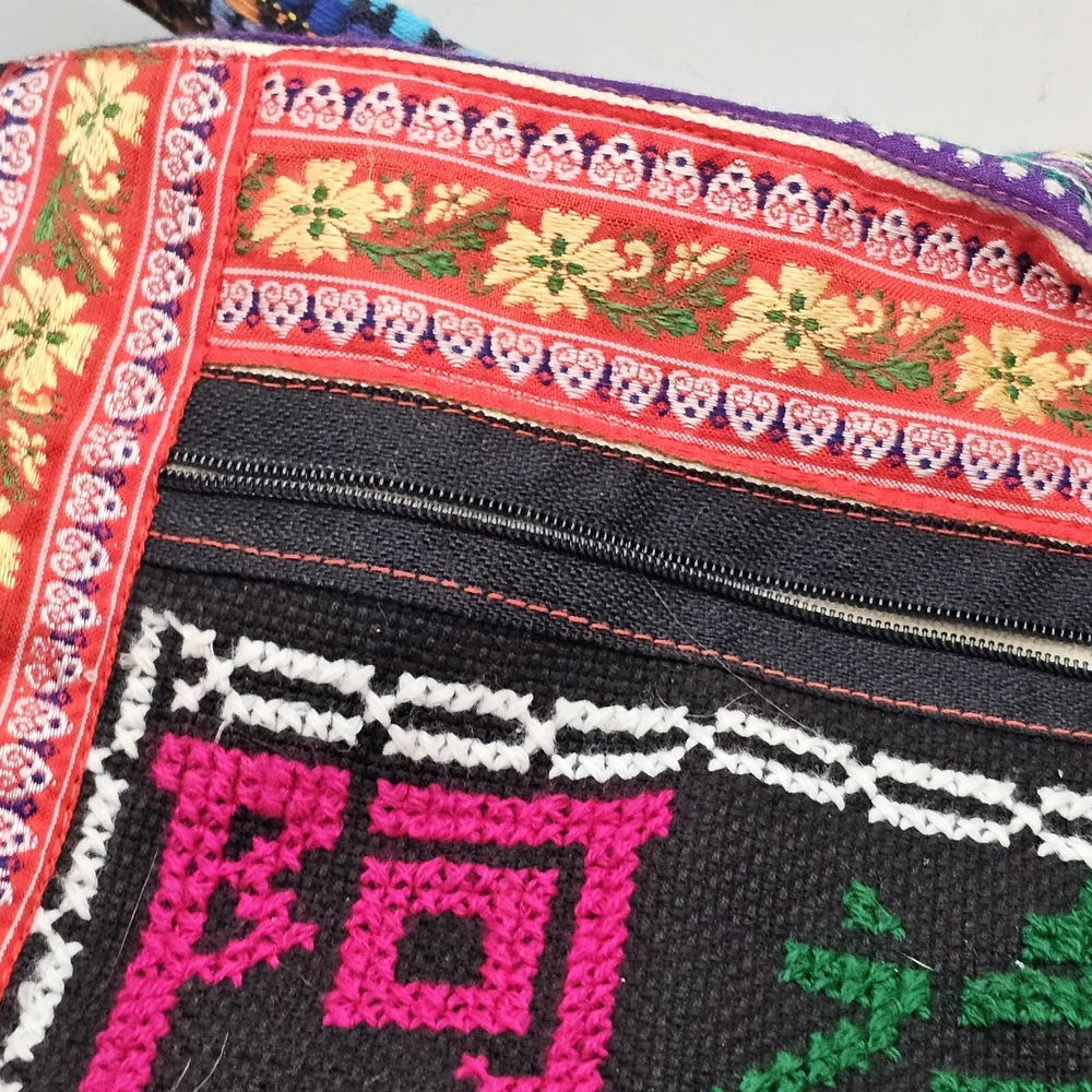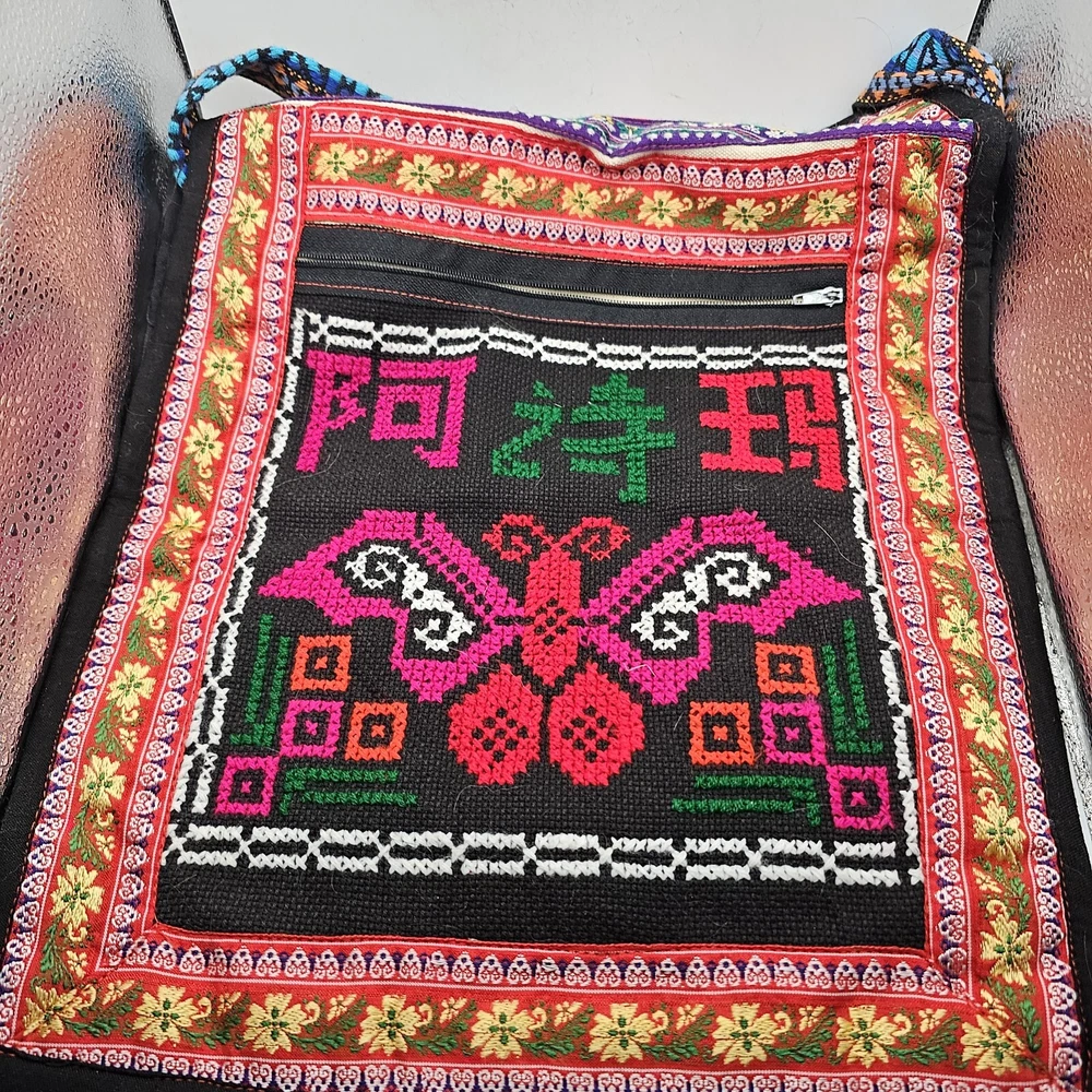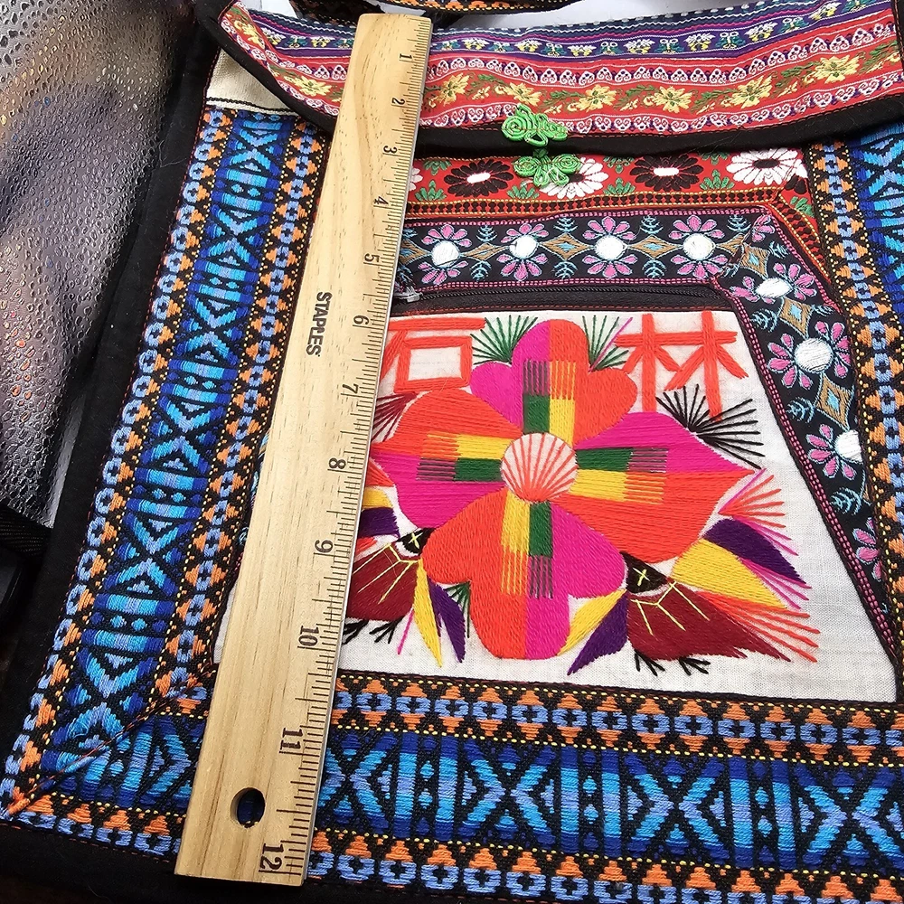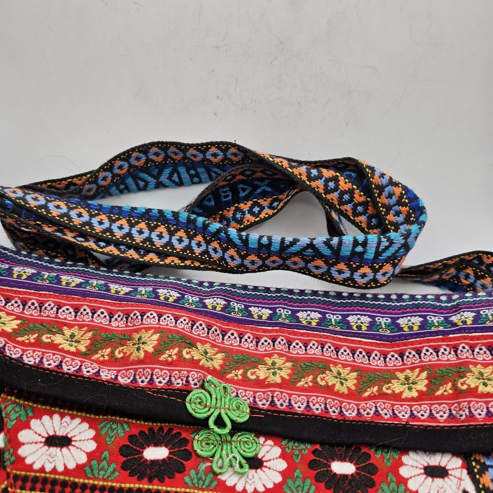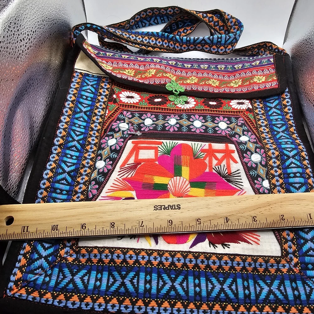 This is a handmade crossbody purse with a floral butterfly design, featuring a boho hippie style. The bag is made of a cotton blend exterior material and has a zip closure. It has a width and height of 12 inches, with a multicolor exterior. The bag is designed with a yarn art theme, perfect for women who appreciate artistic and unique accessories.