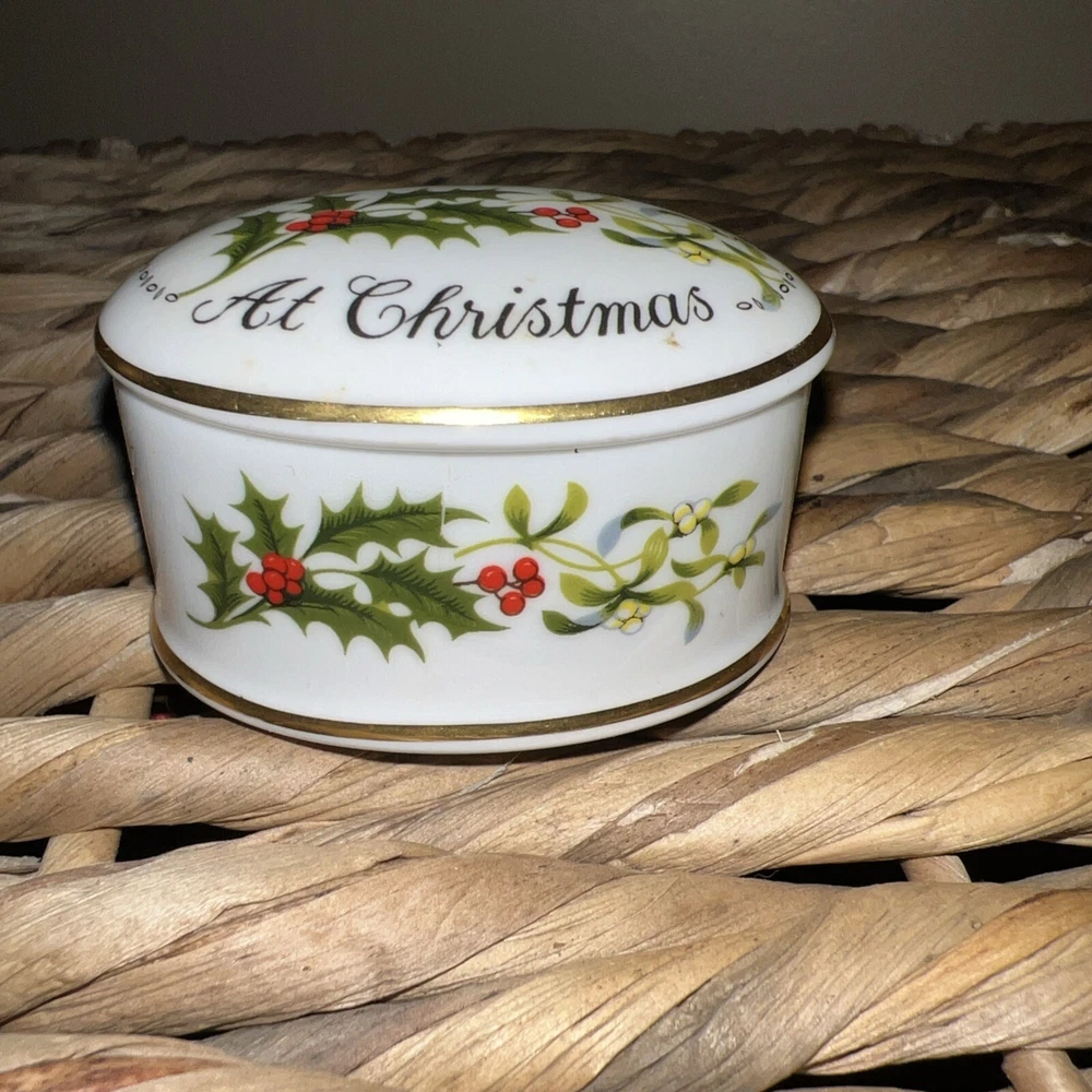 The Crown Staffordshire Bone China Love & Best Wishes Christmas Oval Trinket Box with Lid is a small trinket box made of bone china. It features a floral pattern of painted holly flowers, perfect for Christmas. The box is oval in shape and has an English style, part of the Love collection. It was manufactured in the United Kingdom in the 1980s by Crown Staffordshire. New without box