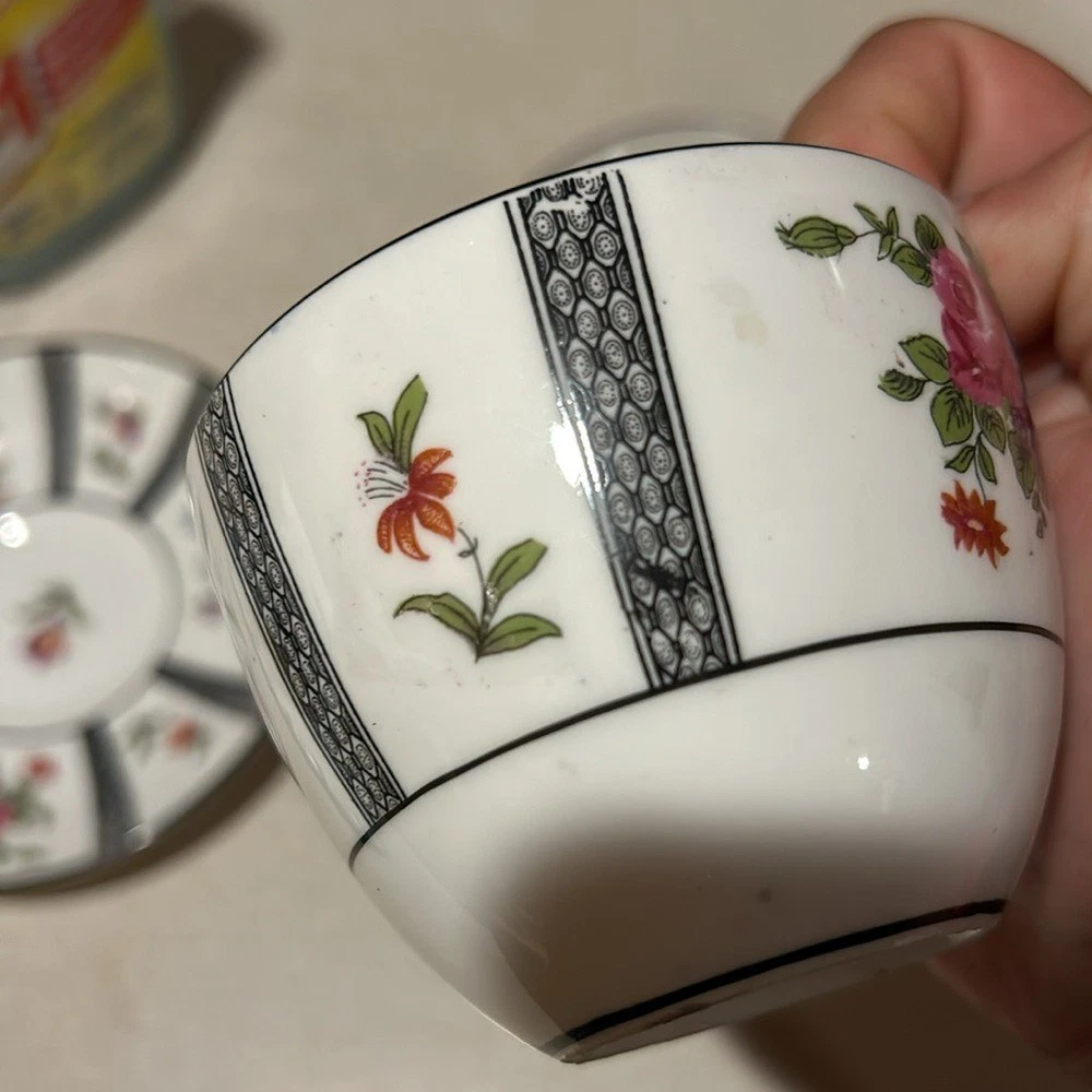 Beautiful Crown Staffordshire Bone China English Tea Cup & Saucer Set. 2 cups and 2 saucers Cup measures 2 1/2" tall with a 3 3/8" top diameter. Saucer is 5 1/2" in diameter. White base color with floral design spray and black trim with lattice lines. See pictures the black is worn.