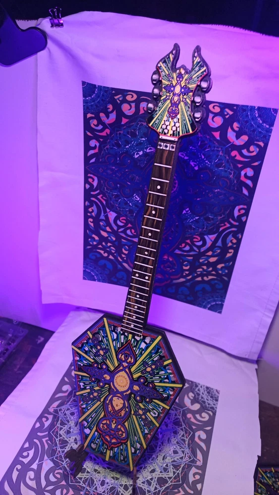 ***Treasure Suite offers you many pieces of my art prints now*** ###This section is for extra large sized laser cut art guitars,cellos,etc. Approximate measurements are 24hx6"wx.25"d. ### Welcome to my unique collection of digital art, where creativity meets craftsmanship! Each piece in this category features my original designs, heat pressed into vibrant sublimation prints on laser cut wood or polyester canvas material. These art pieces are not just decorations, they are collectibles that bring a touch of gothic, rock and roll, horror, pin-up, and lowbrow art into your space. Explore an array of striking designs on my mini guitars to other stringed instrument laser cut art pieces, available in 2 sizes and complete with custom laser cut foldable stands that I personally designed. These pieces are perfect for adding a distinctive edge to your home or office, and they make fantastic gifts for art enthusiasts and collectors alike. Looking for something truly one-of-a-kind? I may accept custom orders to bring your unique vision to life. Dive into a world of bold, expressive art that stands out and speaks to the rebel in all of us!