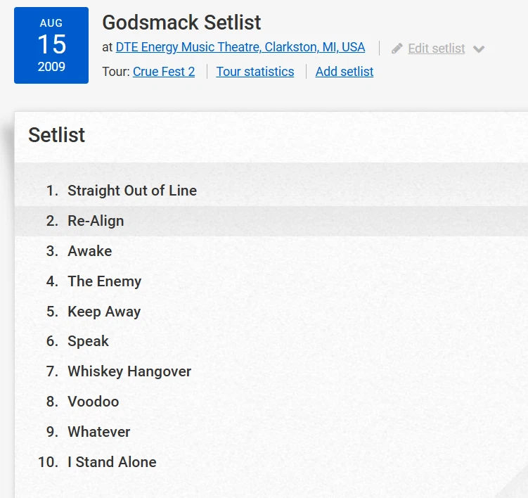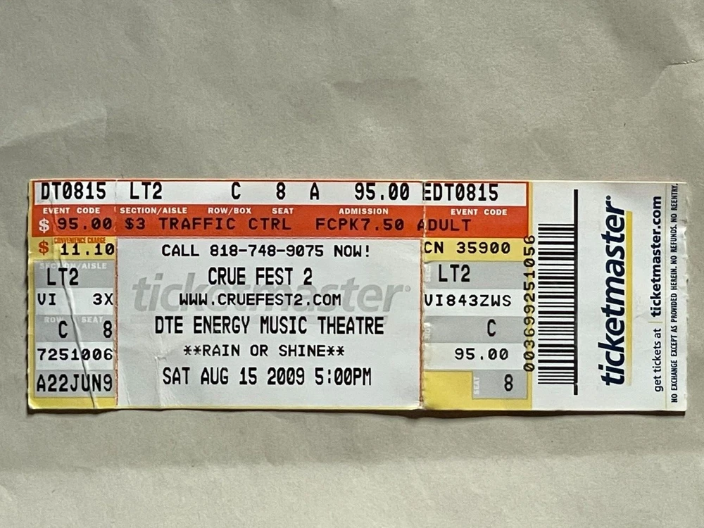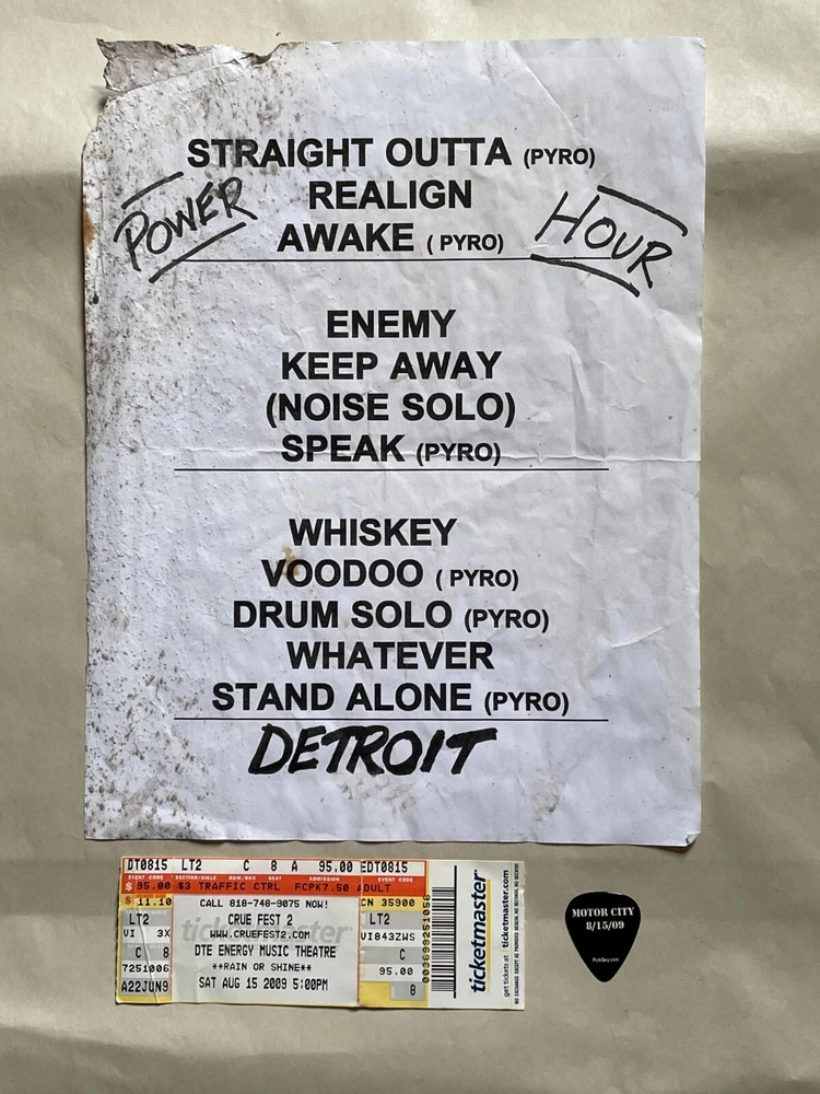 Crue Fest 2 concert 3 piece collection All concert used concert ticket Godsmack setlist (concert worn) Motley Crue guitar pick reference: Godsmack Concert Setlist at DTE Energy Music Theatre, Clarkston on August 15, 2009 | setlist.fm