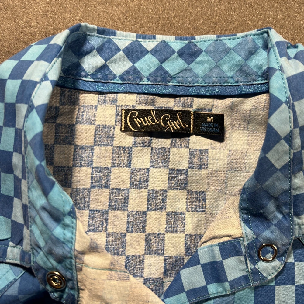 *Please review all photos closely before purchasing due to shirt having mild signs of use and wear and right back sleeve having several faint color fade areas from washing/use to prevent return.* Elevate your wardrobe with this stunning Cruel Girl shirt in a beautiful shade of blue. The shirt features a collared neckline with plaid pattern and pearl snap closure, perfect for any occasion from casual to formal. Made of 100% cotton, this shirt is machine washable and has a regular fit. The long sleeve shirt has a woven fabric type and comes in a women's size medium. It has accents of the brand's logo and features a slimming, easy care, lightweight, stretch, and all-season design. It also has pockets and is wrinkle-resistant, making it the perfect travel companion. This shirt is suitable for any season, whether it's winter, summer, fall, or spring. Add this elegant and bohemian shirt to your collection today! Rodeo Horse Back Riding Cowgirl Ranch Rancher Farm Farmer Barrel Racing Pole Bending Church Wear Dress Up Pearl Snap Shirt Collection Country Western Wear Checkered Plaid