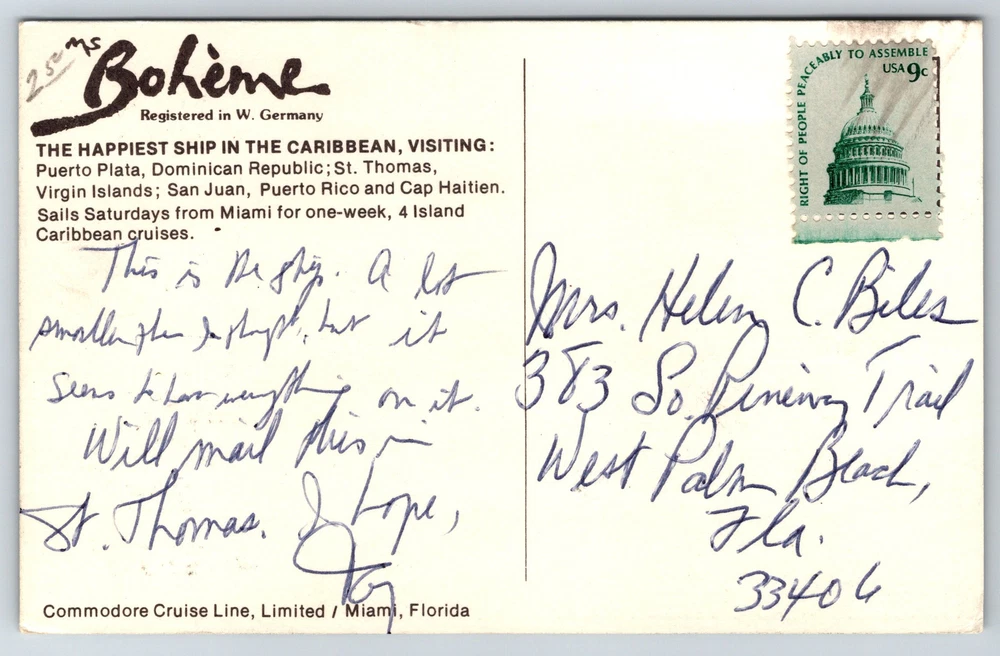 Cruise Ship MS Boheme Caribbean Passenger Ship Commodore Postcard Z13