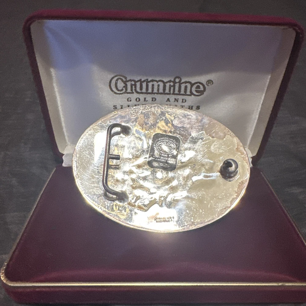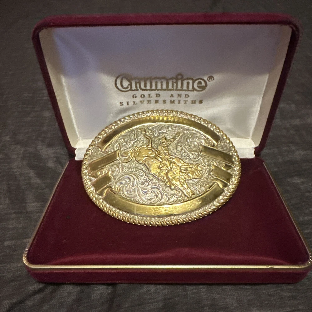 Add some Western flair to your outfit with this Crumrine gold and silver cowboy belt buckle. Crafted from durable metal, it features intricate details that showcase the iconic cowboy theme. The buckle is designed to fit any belt of your choice and is perfect for any collector! It comes with its original red velvet box and it is pretty big if you are looking to stand out of the crowd. Made in USA.