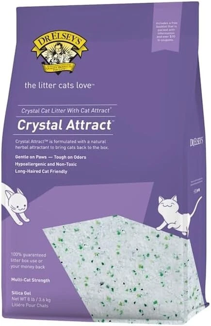 Silica gel litter infused with hydrolyzed herbs draws cats to the litter box. Particle size long haired cats prefer, won't adhere to or color kitty's coat. Traps urine and odor on contact. Hypo-allergenic and non-toxic. Easy to scoop, low tracking formula. Amorphous Silica Gel Hydrolyzed herbal attractant