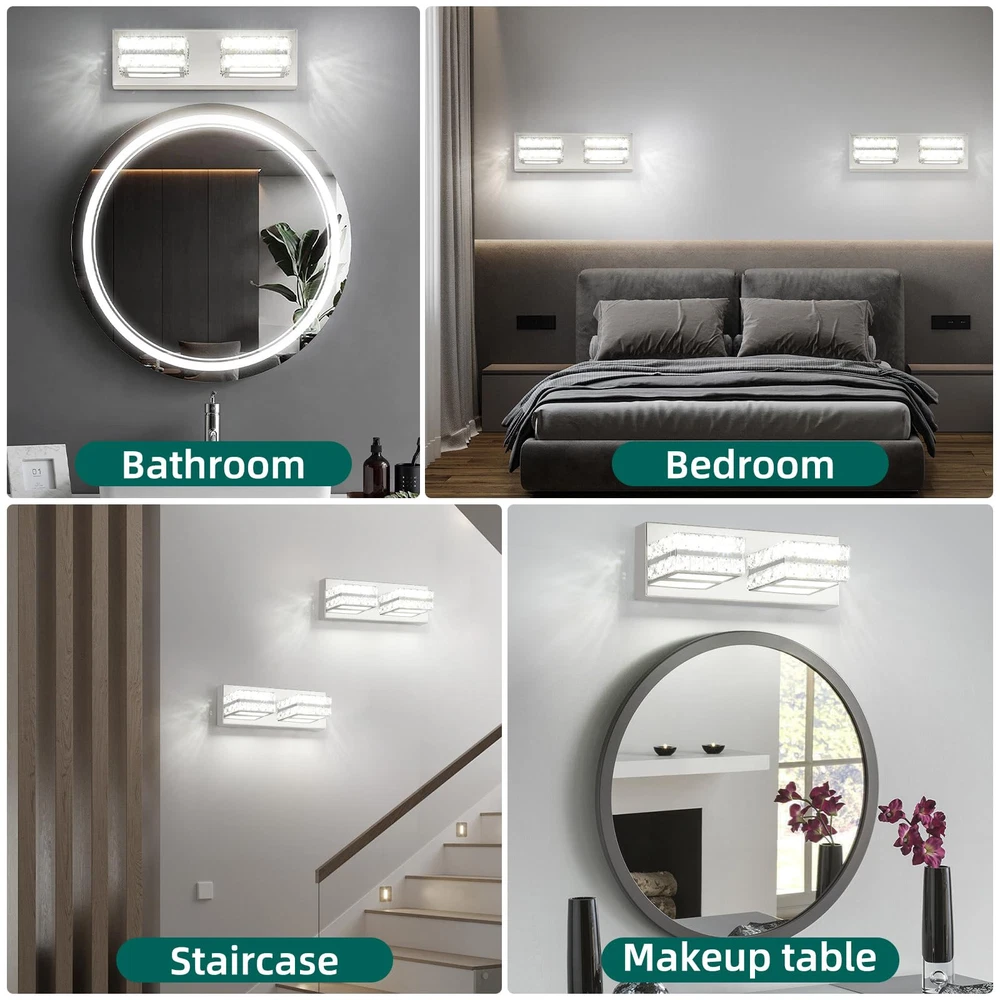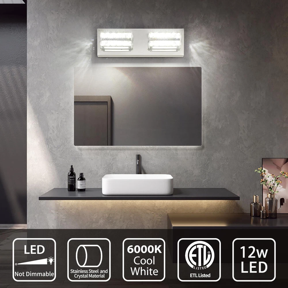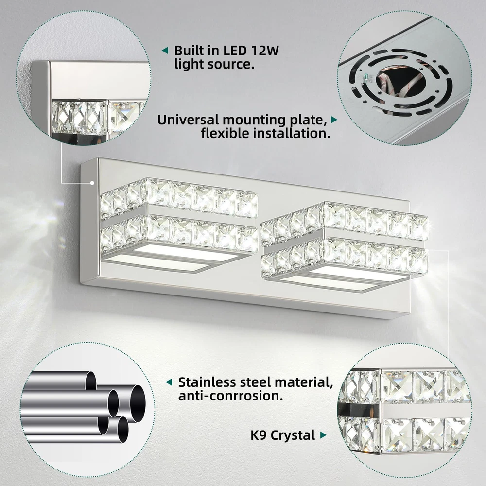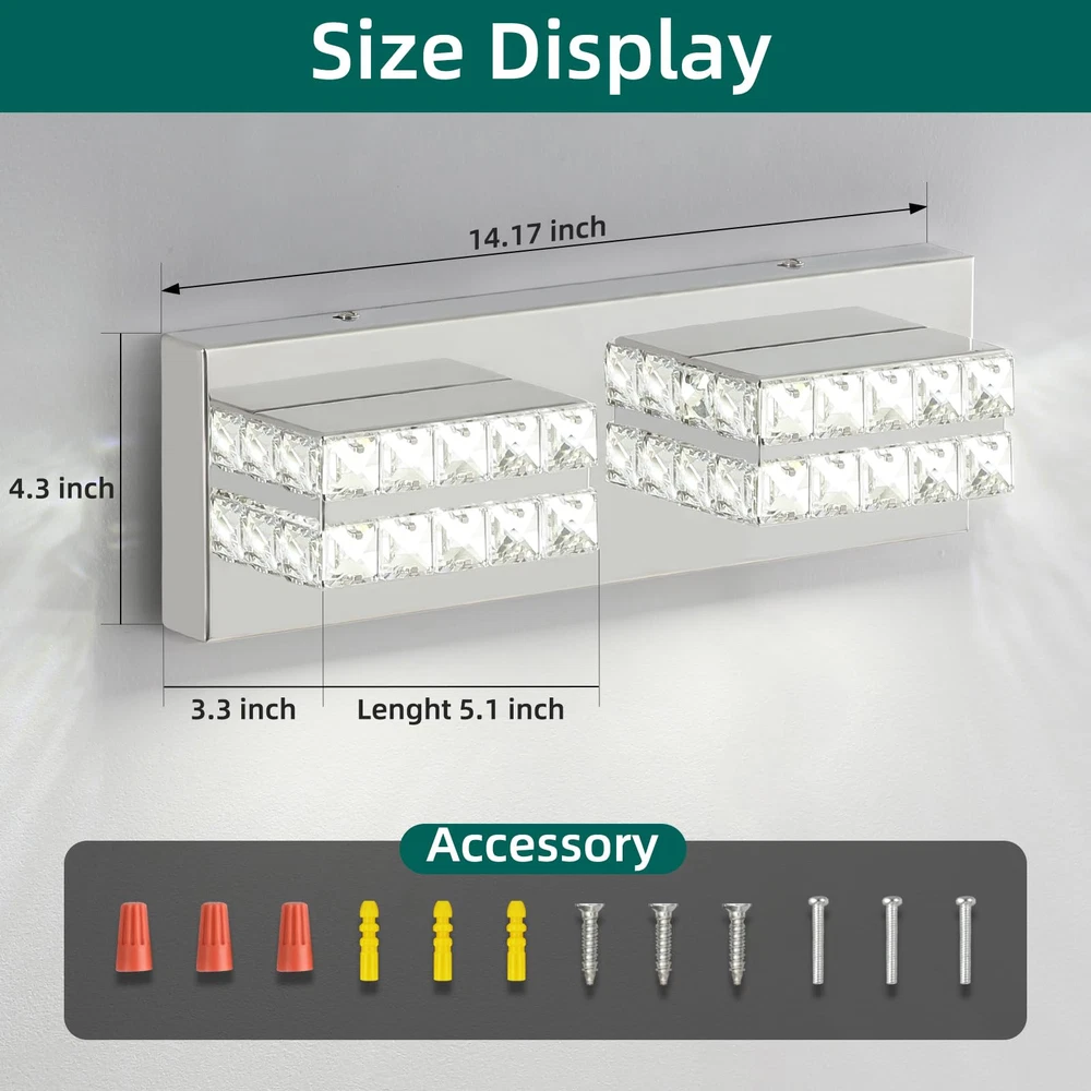 Modern Chrome Vanity Lights for Bathroom: Designed to be mounted directly above the mirror for a clean, integrated appearance. The Crystal vanity light with a chrome finish and crystal lampshade for a luxurious look. Dimmable Cold White 6000K Light: Provides a bright, clear illumination ideal for makeup application and grooming. When used with a dimmer, it is compatible with dimming. (Excluding dimmer) Dimensions: The crystal bathroom vanity light fixtures' dimension is L14.17'' x W4.3'' x H 3.3'', designed to fit most bathroom spaces. Application: Bathroom wall light fixtures offer flexible lighting for multiple rooms. They're perfect for bathrooms, but also enhance living rooms, dining rooms, hallways, and bedrooms. Easy Installation: The crystal vanity lights for bathroom come with all the necessary hardware for a quick and hassle-free setup. The over sink lighting fixtures have ETL certification and can be used with confidence. After Sales Support: 3 Years of return and exchange service support. If you have any problems, please let me know at any time, and we will reply within 24 hours and provide you with satisfactory solutions.