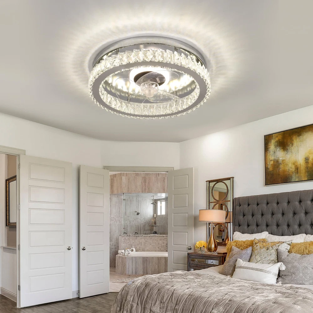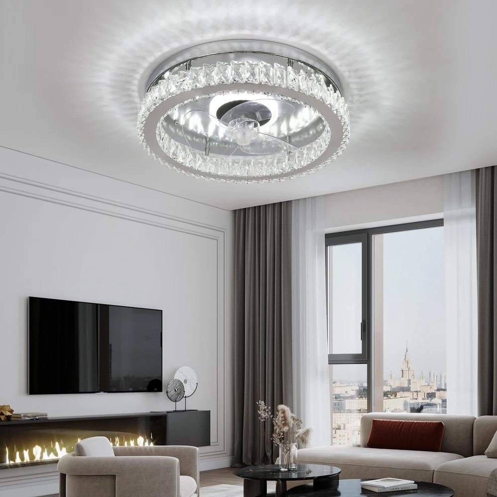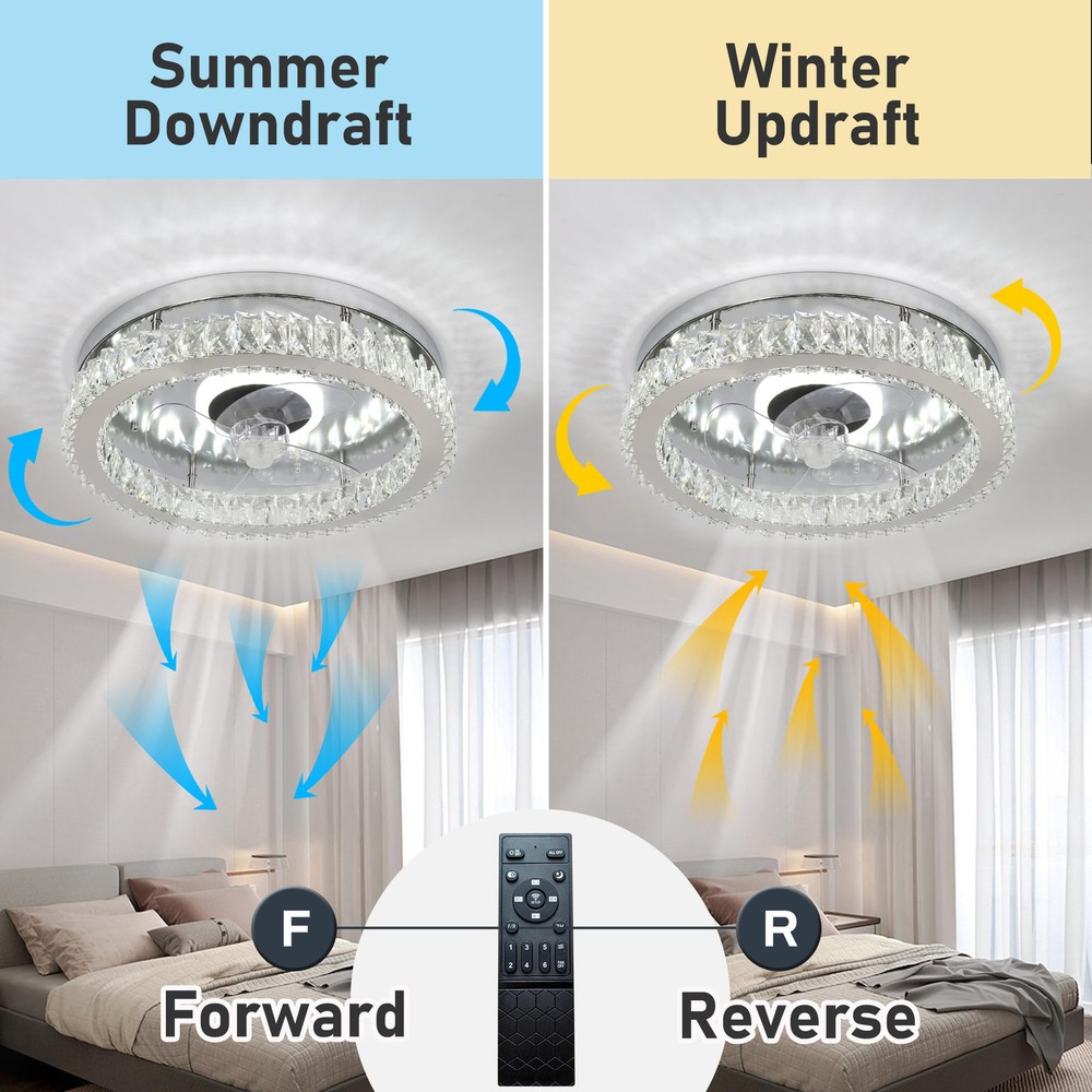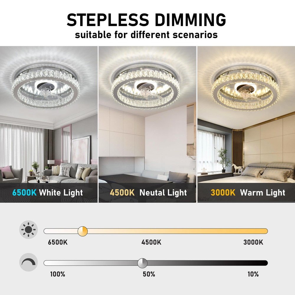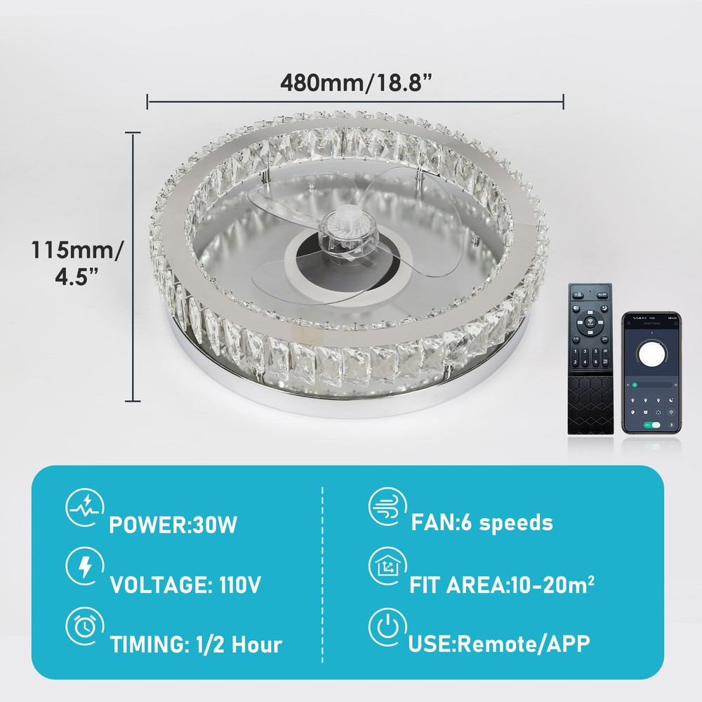 【Ceiling Fans with Lights】 Built-in LEDs light source(800K-6500K), can freely adjust the color temperature and brightness by the remote control. Power: 30W, with timing function. 【Low Profile Ceiling Fans】 Size: Diameter 18.8 inch (48cm), height 4.5 inch; Voltage:85-265V; 1 remote control, DC motor and 3 blades, applicable area 10-20㎡. 【Mute Motor and Timing】 The pure copper silent motor of the crystal ceiling fan runs smoothly without making noise, and the night mode and timing mode provide you with a quiet and comfortable sleeping environment. 【Forward and Reverse Mode】 Freely change the direction from downdraft mode during the summer to updraft mode during the winter. The ceiling fan can be used all seasons. 【Easy to Install】 Instructions and all mounting hardware are included for your easy installation. If any questions, please feel free to contact us.