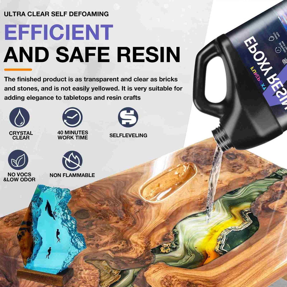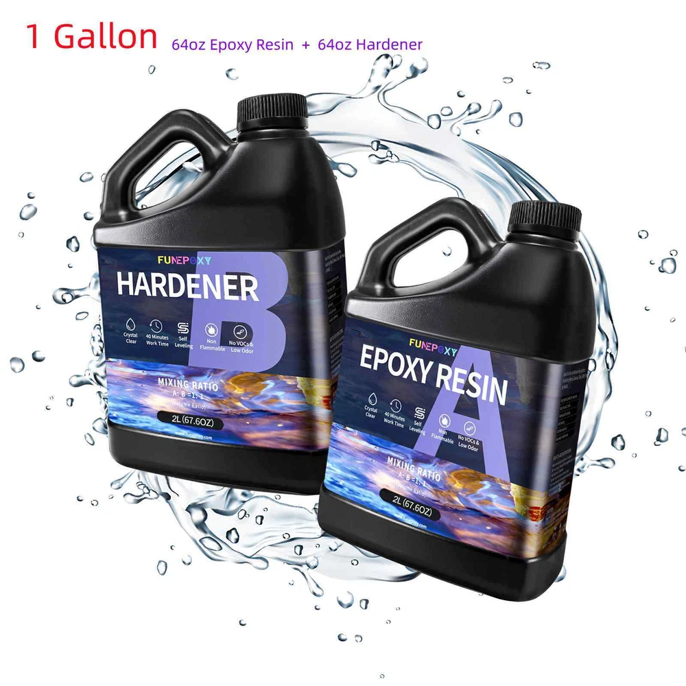 The resin 1:1 mix ratio by volume, 1 Gallon kit is volume 1 Gallon mixed, is the total volume 1 Gallon kit : 64oz resin A + 64oz hardener B (Total 1 Gallon) Features: Mix Ratio...............1:1 by volume Work time ..............45-60 minutes Hardness....................D70-80 after full cure Mixed Viscosity..........2500-3500cps. Chemical Resistance.......excellent Moisture Resistance........excellent FDA Compliant / Food grade: Yes, in its inert fully cured state Heat resistance: up to 80℃ (please don't leave hot pans on it,a coaster needed) Approximate Coverage: 12 square ft per gallon at 1/8 inch thickness Perfect for tabletops, fiberglass work, small castings (under 1.2" /3CM), electrical potting, jewelry making, concrete - pebble coating, marine applications- boat building The resin 1:1 mix ratio by volume , 1 Gallon kit is volume 1 Gallon mixed, is the total volume 1 Gallon kit : 64oz resin A + 64oz hardener B (Total 1 Gallon) package weight : 10lbs Features : Mix Ratio...............1:1 by volume Work time ..............45-60 minutes Hardness....................D70-80 after full cure Mixed Viscosity..........2500-3500cps. Chemical Resistance.......excellent Moisture Resistance........excellent FDA Compliant / Food grade: Yes, in its inert fully cured state Heat resistance: up to 80℃ (please don't leave hot pans on it,a coaster needed) Approximate Coverage: 12 square ft per gallon at 1/8 inch thickness Perfect for tabletops, fiberglass work, small castings (under 1.2" /3CM), electrical potting, jewelry making, concrete - pebble coating, marine applications- boat building, & wood water proofing - repairs. Tips for operation This product is 1:1 fast cure resin, each time mixed, pour No more than 150ml total, (that is 75ml A + 75ml B, A must be ≥ B), with a thickness range of ≤1.2" to avoid bursting. and you can go as deep as you like, just make sure to work in stages. stay under 1.2" per pour. after the surface film cures begin your second pour. the surface set time is roughly 1 hour at room temp. the full cure time is 8-12 hours in summer and 12-24 hours in winter Operation steps 1:1 ratio for A&B glue by volume (A can be 2-5% more than B to make harder) Pour into the mixing cup Along the cup wall and bottom stir it evenly for 1-2 minutes Add glitter or pigmentand if you need Slowly pour mixed resindown the mold Add other decorative Important This chemical needs to be stored in a dry, safe, temperature controlled environment. Always keep the lids tightly sealed when not in use. Remember, oxygen and moisture oxidize and can rapidly degrade the epoxy and hardener. Moisture is also a potential issue. Always keep the bottles sealed when not in use. When applying this product, use gloves, goggles, and proper safety equipment. Please refer to the safety data sheet before using any of our epoxy products. Payment Shipping details Return policy About us Contact us Payment We accept Paypal,Google Pay,VISA,Master Card,American Express and Discover. Shipping details We usually ship from US within 1-3 business days with tracking number by USPS or UPS. Return policy 30 days returns. Seller pays for return shipping. About us We are a trustworthy and professional eBay seller. Contact us If any problems about our product and service,contact us for free at any time via eBay messages. A:B Ratio 1:1(volume ratio) Brand FUNEPOXY Color Clear Handmade Yes Capacity 1 Gallon Total Volume Kit 64oz epoxy resin A + 64oz hardener B
