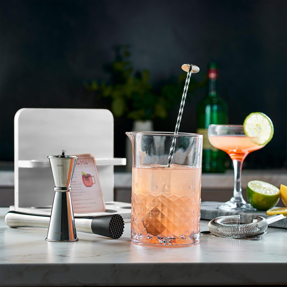 Crystal Cocktail Mixing Glass Set with Bamboo Stand - 22 Oz 650ml - Thick and Sturdy Bottom, Durable and Seamless Design with Bar Accessories IMPRESS YOUR GUESTS WITH STYLE: Mixing Glass features an etched diamond pattern and looks stunning in any bar. This classic ultra-clear mixing glass is an elegant and practical solution when you need to stir your cocktail instead of shaking it. SUPERIOR SEAMLESS DESIGN - The lead-free glass is handcrafted to avoid cracking like cheap machine-made mixing glasses. Its thick walls provide better insulation, and its capacity (22 Oz) makes it perfect for home bartenders to serve drinks to friends and family. DIAMOND PATTERN : The beautifully etched diamond pattern makes mixing easier, while the weighted base gives the glass more stability and balance. With both of these features combined, you can mix and pour cocktails with greater ease. STAND FOR BAR TOOLS: This unique bar tool holder features design dents and wood partitions, making it thick, stable, and solid PREMIUM STAINLESS STEEL BARWARE: A bar muddler, mixing spoon, double jigger, strainer and recipe card set complete the mixing process. Our bar essentials are practical, elegant, and durable. All are made of heavy gauge stainless steel with high end finishes. Home bartenders will love this cocktail kit!
