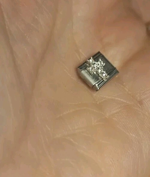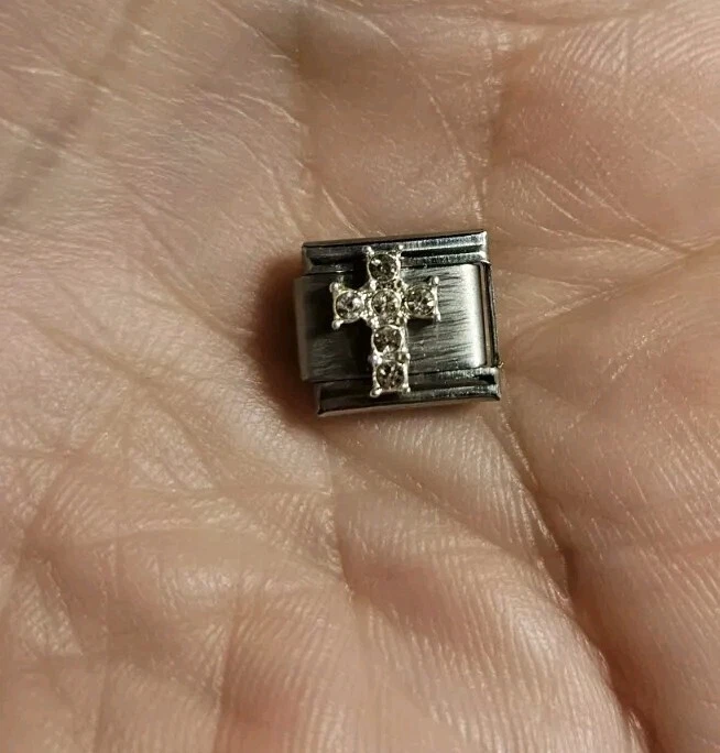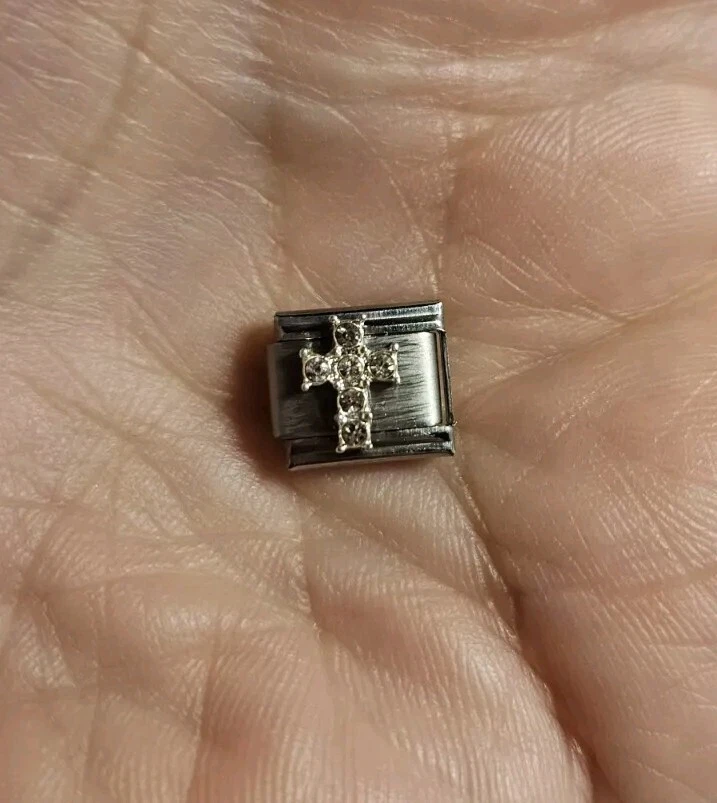 Crystal cross Italian Charm. 9mm. Crafted from stainless steel. The charms feature a rectangular shape with a link closure, making them easy to add to your bracelet.