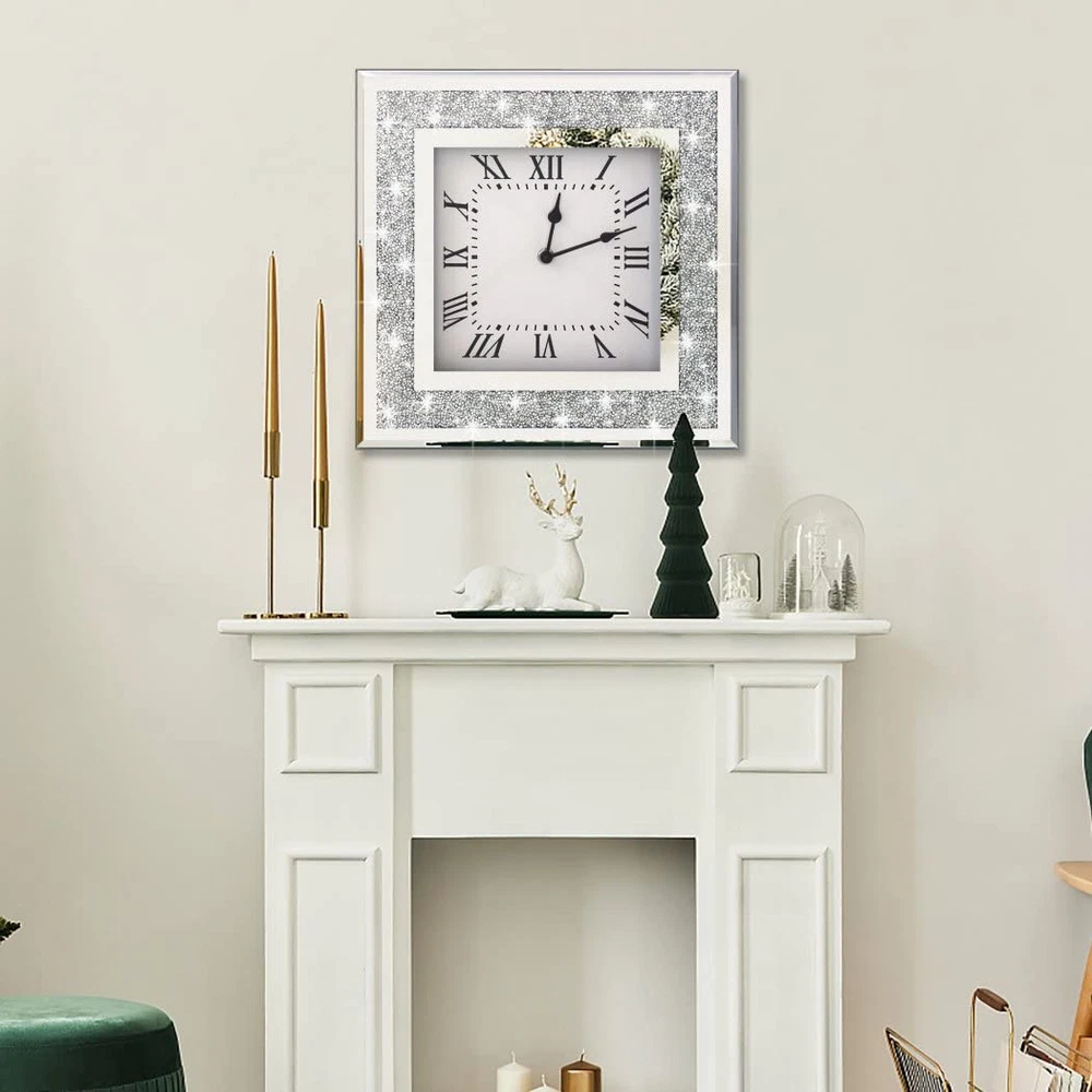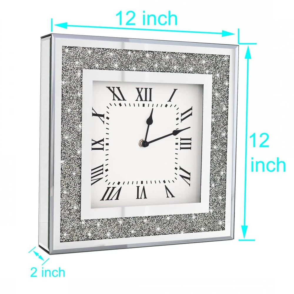 Crushed Diamond Mirror Wall Clock size: 12x12x2inches. Use AA Battery (For safety reason, Battery is not included in package). Clock Material: front surface all covered by silver mirror and glass, excellent bevel craft. Crush diamond for decoration. Quartz Clock. Upgrade Clock Mechanism: is the key point for accurate time, pointer silent movement help people sleep peaceful and comfortable. Gorgeous crystal crush diamond with mirror frame, simple clear Roman numbers dial, black metal pointer, comfortable and easy to read time. Europe top grade design in exquisite craft: crush diamond big mirror clock will add sparkle twinkle bling live element to you home. Fashion beautiful elegance gorgeous, impress everyone. Well decorate home, office, living room, bedroom, restaurant, dining room and other place. Install Instruction: Back with 2 hangers, easy for wall hang. Clock need one piece of AA battery, for safety reason, battery is not included in the package.