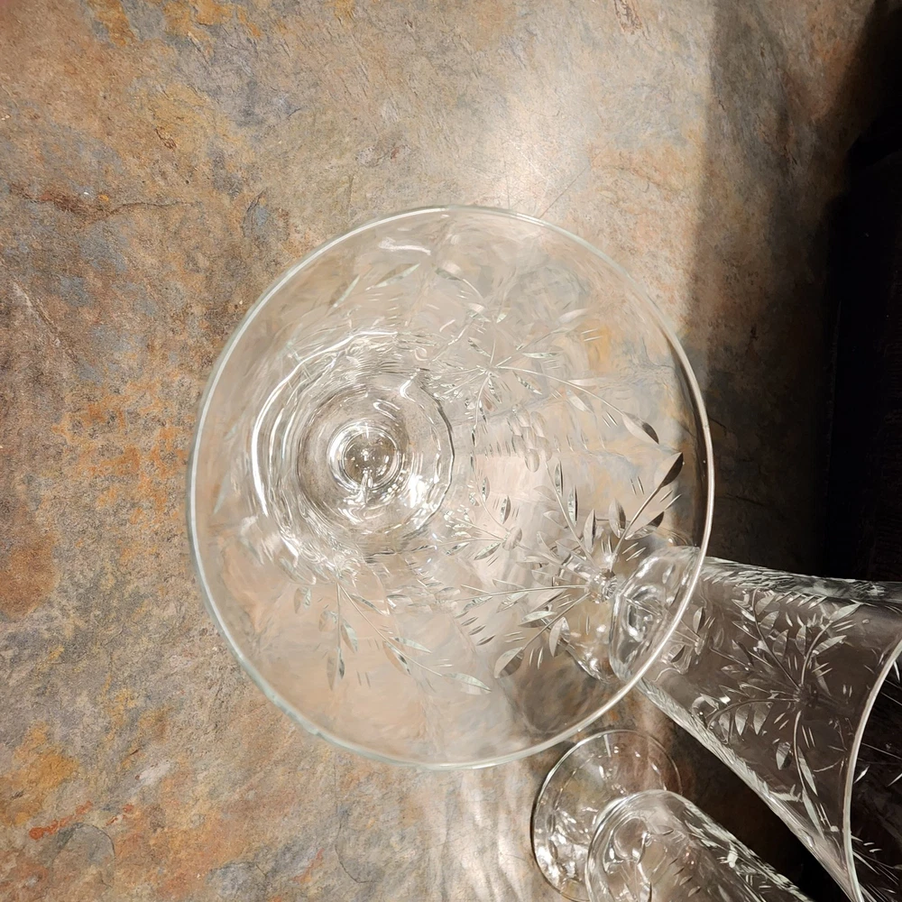 Elevate your table setting with this set of four vintage cordial glasses. Made of crystal, these glasses feature exquisite etched patterns with a floral theme. The glasses stand at 4 3/4 inches tall and are perfect for all occasions. The clear color of the crystal allows the intricate designs to shine through, making them a great addition to any drinkware collection. These glasses are a perfect representation of cut glass production style. They are a great addition to any vintage collection. Use them to serve juice or any other drink that you think will complement their beauty.