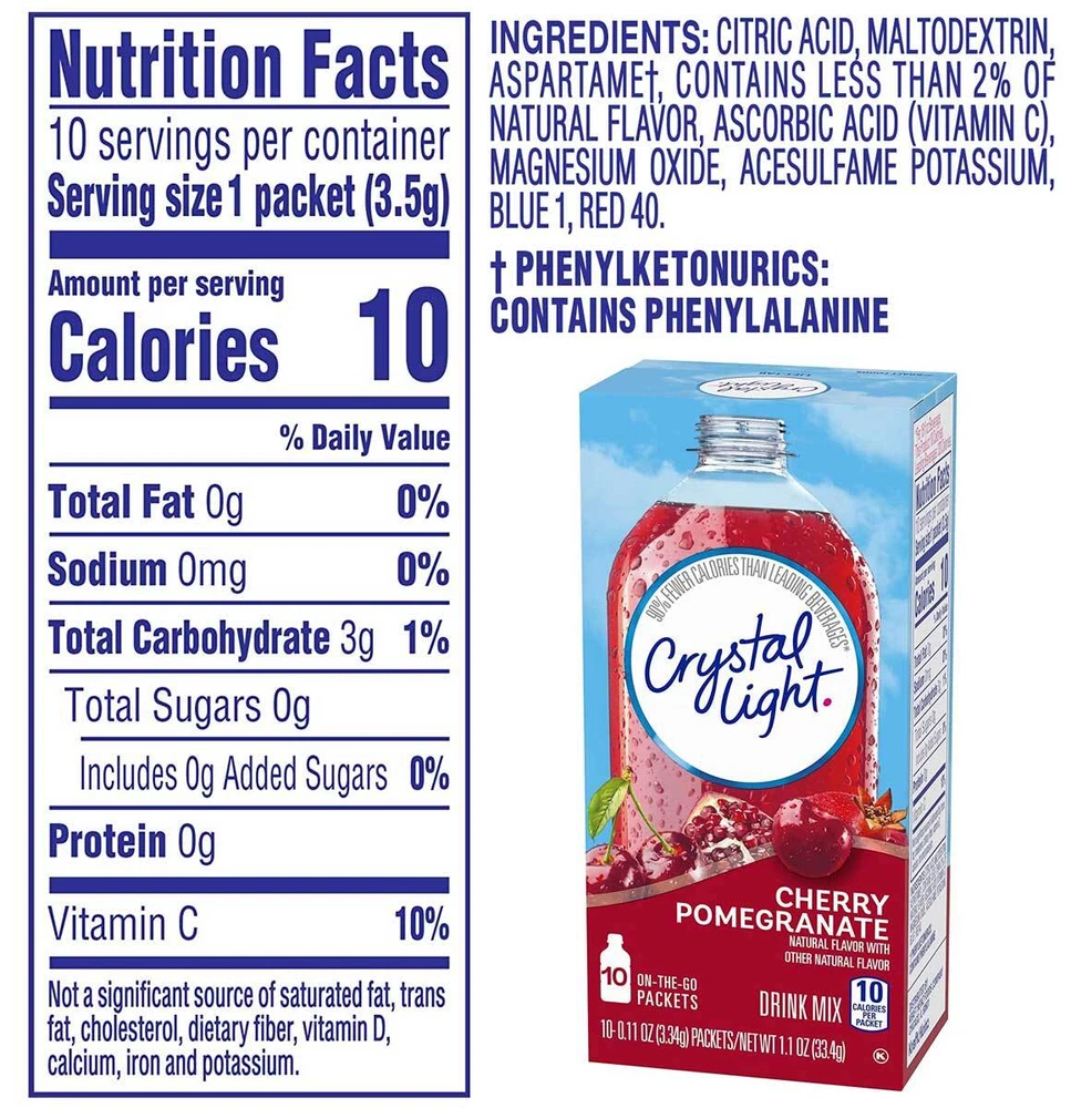 Product Details Crystal Light On-The-Go turns the water you need into the water you will love. It transforms ordinary water into the fabulous fruity flavor of Cherry Pomegranate with just 5 calories per serving. Each sip is the perfect way to refresh, renew and satisfy your thirst for something different. Brought to you by Crystal Light Size: 10 Ct (10-0.11 Oz Packets Per Box) Pack of 1 - EACH Buy In Bulk and SAVE! Upc: 043000017289 (FAQ) FREQUENTLY ASKED QUESTIONS: Payment: We accept the following forms of payment: PayPal, Visa, Master Card, American Express and Discover. Shipping: All purchases are shipped within 2-5 business days unless specifically stated on listing under Delivery Time. Shipping times are very close to what is listed on the eBay listing. Emailing us prior to the shipping time stated in the listing will not expedite the shipping time. If the shipping time exceeds the time stated in the listing, please contact us and we will look into the order. Tracking Numbers: We upload tracking numbers when the item leaves our facility. PLEASE NOTE the shipping time frame listed next to Delivery in the eBay listing. If you do not see a tracking number within the shipping time stated in the listing, then please contact us. Please make sure that our email messages don't go into spam or junk. We cannot assume responsibility for lost shipments after tracking shows the parcel has been delivered. Please contact the delivery service to investigate should this happen. Shipping Locations: We ship to the 48 contiguous United States excluding Military APO & FPO and PO Boxes. At this time, we do not ship to any International locations. P.O. Boxes and Street Addressing: We do not ship to PO Boxes, however, some of the larger Post Offices have a system called “Street Addressing” and will work with customers with a PO Box so their packages can be delivered to the Post Office street address and they will forward the item to their PO Box. This is especially beneficial in case your item is shipped via SurePost or SmartPost and will keep the item from being returned to us for an insufficient address. Please check with your local USPS Office to see if they offer this option. Shipping Service: We primarily use UPS and DHL, which can sometimes coincide with USPS, as well as USPS and FedEx. Our shipping department makes the decision of which service to use based on the weight of the package and the contents. Expedited Shipping: We do not offer expedited shipping at this time. Address Change: Please be sure your address is listed correctly in both eBay and PayPal prior to making a purchase. If you have listed the incorrect address and the item has not yet shipped, please contact us immediately and we can change the address for you. If the item has already shipped and is returned due to a bad address, a refund will be issued minus any costs incurred to us for the return of the item. Damaged During Transit: If your item arrives damaged – do not discard! The best way to receive a refund is to take pictures of the damage and send them to us. We will need a clear picture of the label, the box, and the damaged item. If you cannot send a pic, then you will need to return the item for a refund by opening a return in eBay. We do need to have validation that the item was damaged. If you throw it away, and then claim the item was damaged, you will not be refunded. No exceptions, please! Expiration Dates: Due to expiration dates constantly changing, we do not supply the expiration date as we ship large quantities daily. With that said, please note our priority is that all grocery items have a minimum shelf life of 90 days. If your product does not meet this standard, please contact us for further instruction. Please Note: Fresh baked bakery items and refrigerated items that are perishable have short shelf lives – some of these can be as little as two weeks from the date of receipt – these items are NOT covered by our minimum 90 day guarantee. Item as Pictured: While we work to ensure that product information is correct, on occasion manufacturers may alter their ingredient lists or packaging. We do upload our pictures by the UPC# (stock photos) and actual product packaging and materials may contain more and/or different information than that shown on our listing. We recommend that you do not solely rely on the image presented. If our image appears outdated, the items we carry are always the most current version of the product . The product images shown are for illustrative purposes only. Count Size/Pack Size: The count size (written “Ct”) is how many individual items are in each package. The Pack size is how many of the packages will be sent. Example: A box of cookies has 30 cookies in each package. The listing is for 6 packages. The listing will read: Cookies – 30 Ct – Pack of 6. Returns: We accept returns up to 30 days after receipt. Item must be in NEW and UNUSED condition. All returns will be inspected prior to credit being issued. Items returned must be accompanied by the original packaging and the Return Packing Slip. Credit will be issued for the purchase price of the item(s) returned. If you wish to return your item, please open a Return through the eBay returns. Refunds will be issued in the same form of payment as the original purchase. Exchanges/Replacements: We are sorry but we do not have an exchange/replacement policy at this time. We ask that you re-purchase the item and return the unwanted item. You may return a product within 30 days of receiving your item. Please see our Return Policy above. Customer Service: To contact Customer Service, please go to the listing page for the item you have a question about and click on Contact Seller in the Seller Information text box. Our business is open during normal business hours, so please allow an appropriate amount of time for a response. Feedback: We leave feedback as soon as payment is made. We do ask our customers if for any reason they ar