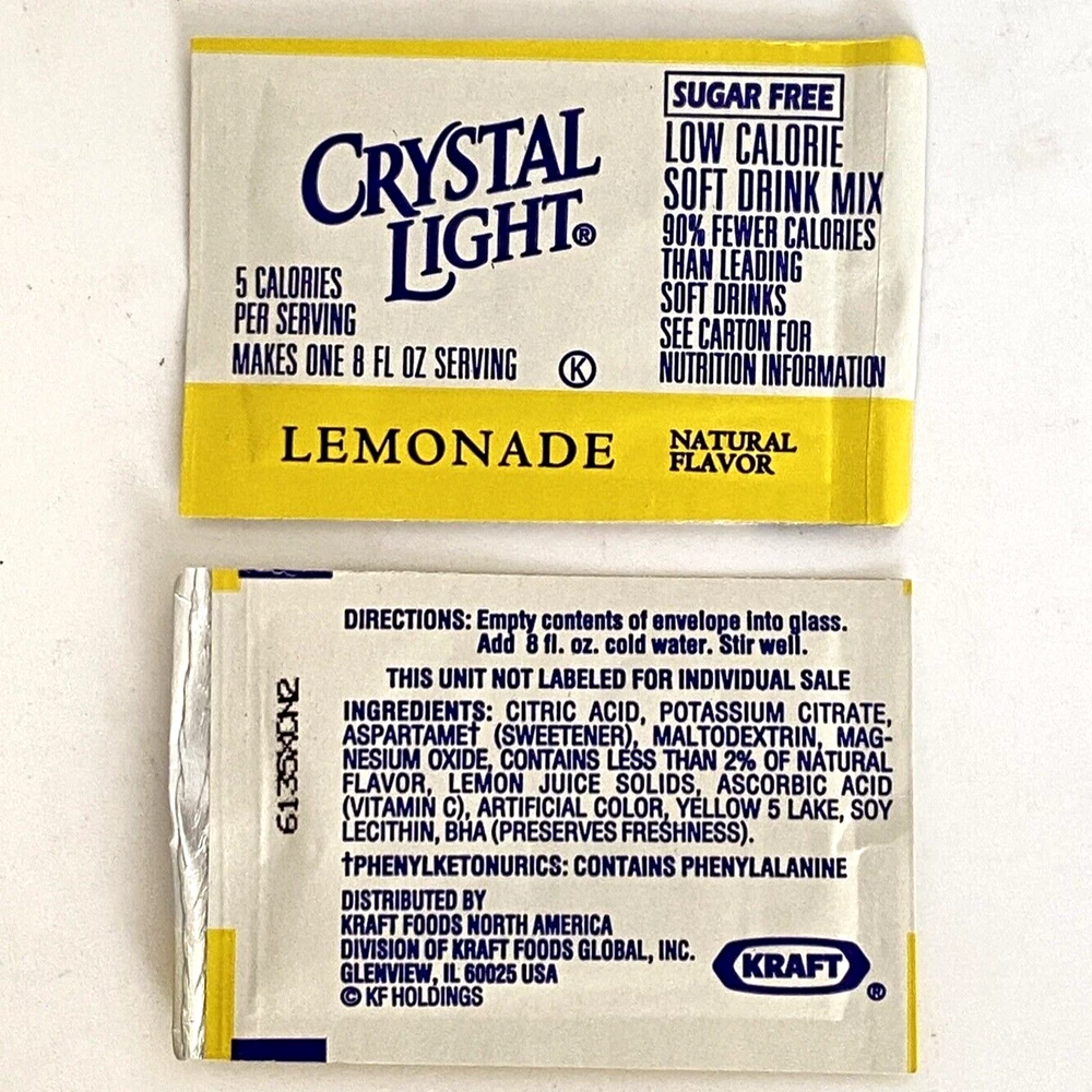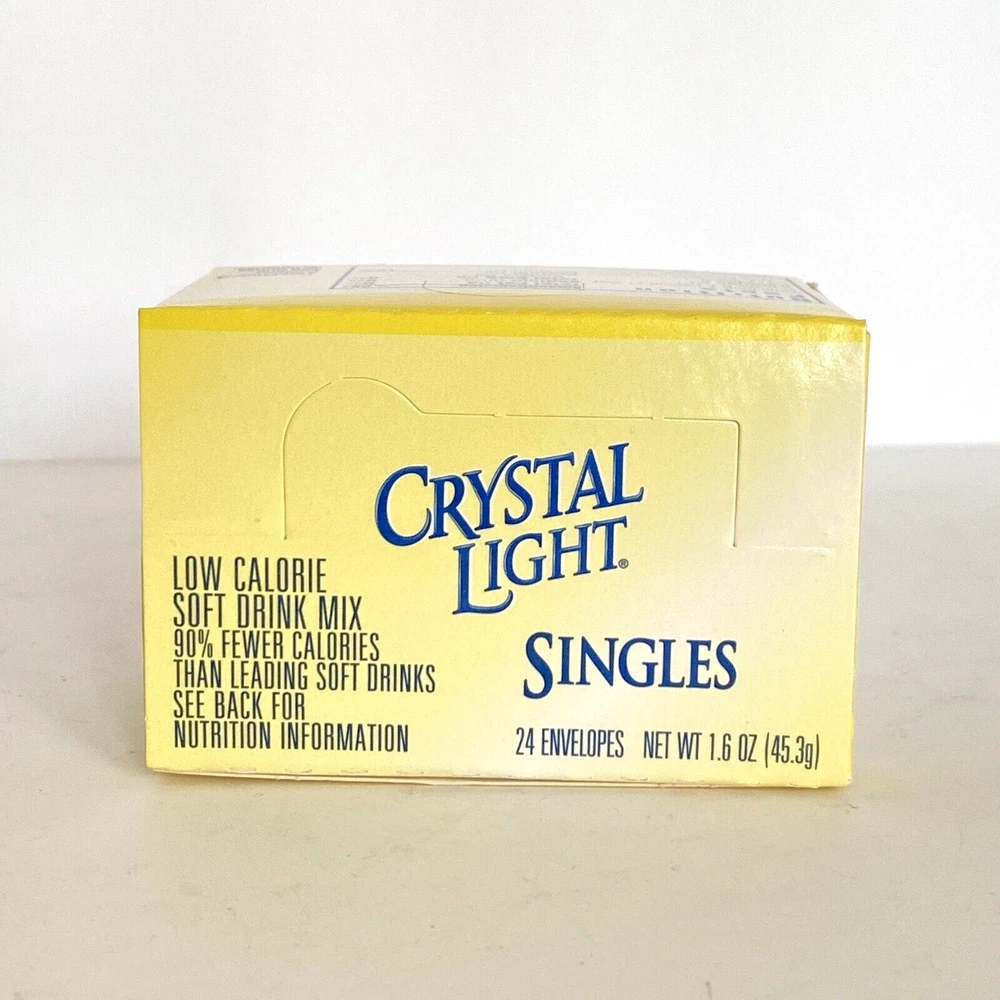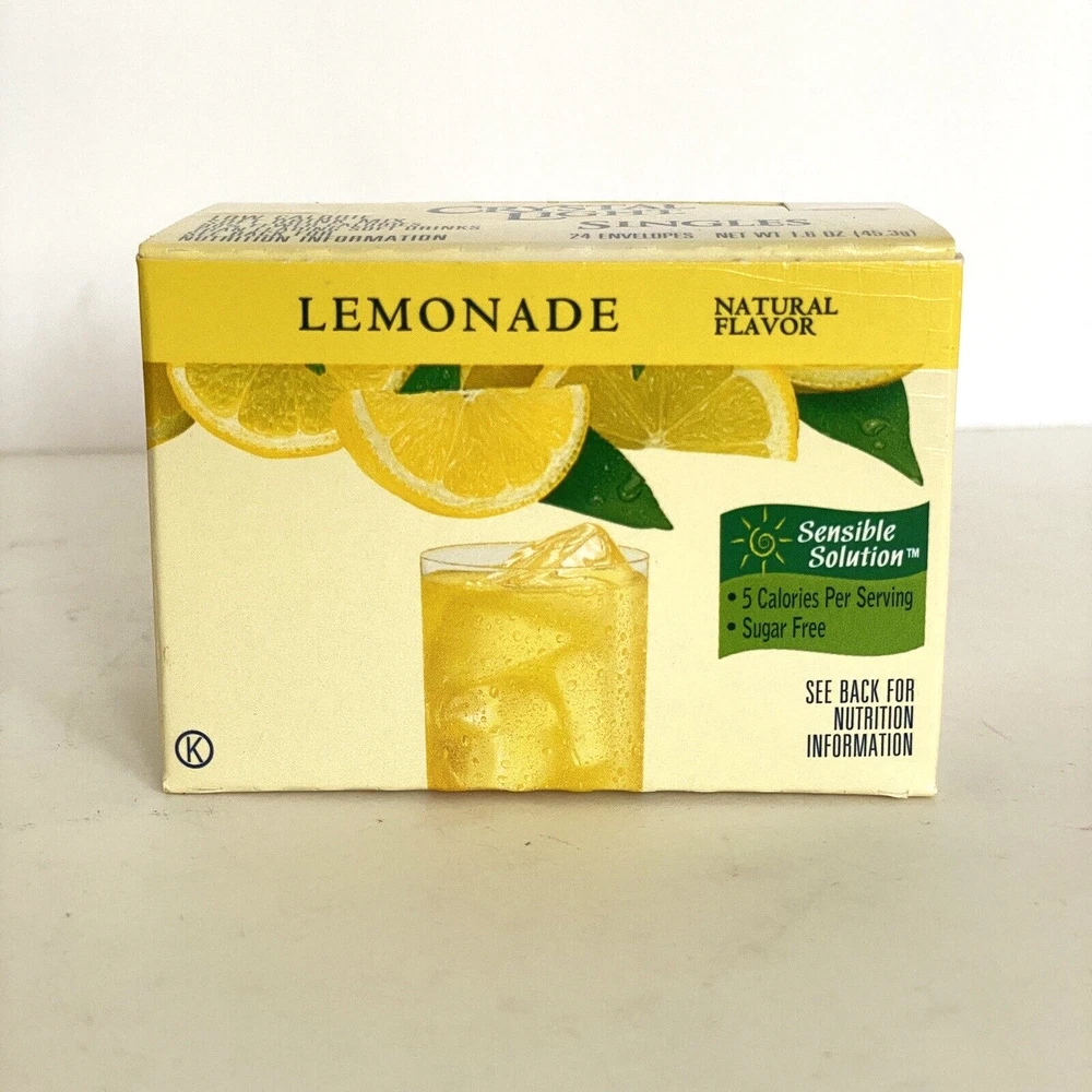 Crystal Light Singles Sugar-Free Lemonade Natural Flavor Low Calorie Soft Drink Mix 24 Envelopes (1-Box). Mix One Envelope into 8 Ounces Water for a Single Serving. 5 Calories per Serving. Contains Soy and Phenylalanine.