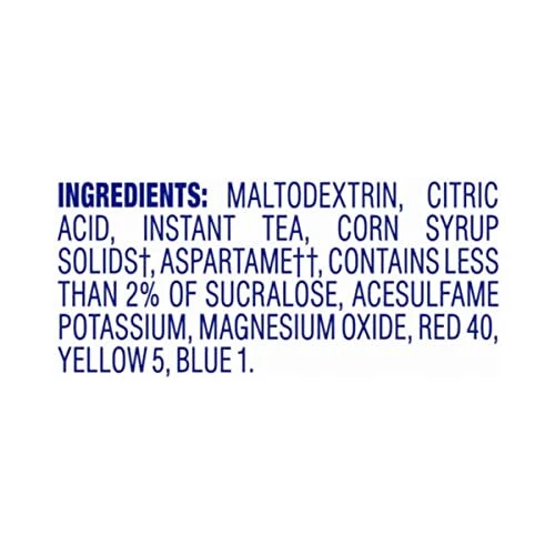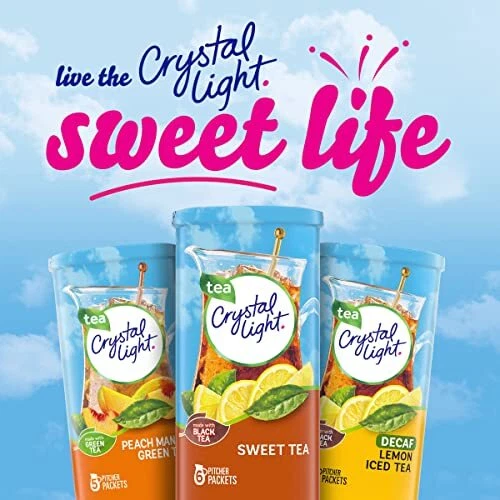 Crystal Light Naturally Flavored Sweet Tea Powdered Drink Mix is a refreshing beverage you can enjoy at any time of day. With zero grams of sugar and 5 calories per serving, Crystal Light is a sweet alternative to juice and soda and has 90 percent fewer calories than leading beverages (this product 5 calories, leading beverages 100 calories), so you don't have to choose between taste and calories. It's also made with real black tea for a refreshingly smooth taste. Each pitcher packet of powdered iced tea mix in this 6 count canister is perfectly portioned to make 2 quarts or 1 pitcher of Crystal Light, so there's plenty to share with family and friends. Simply mix one drink mix packet with 8 cups or 2 quarts of water, stir, and enjoy! All the flavor and only 5 calories, just the way you like it. One 6 ct canister of Crystal Light Naturally Flavored Sweet Tea Powdered Drink Mix Crystal Light Naturally Flavored Sweet Tea Powdered Drink Mix delivers low calorie refreshment Each pitcher packet makes 5 servings or one 2-quart pitcher Made with zero sugar and 5 calories per serving for guilt-free refreshment Made with real black tea 90 percent fewer calories than leading beverages; this product 5 calories, leading beverages 100 calories Comes in a variety of sizes for all your beverage needs