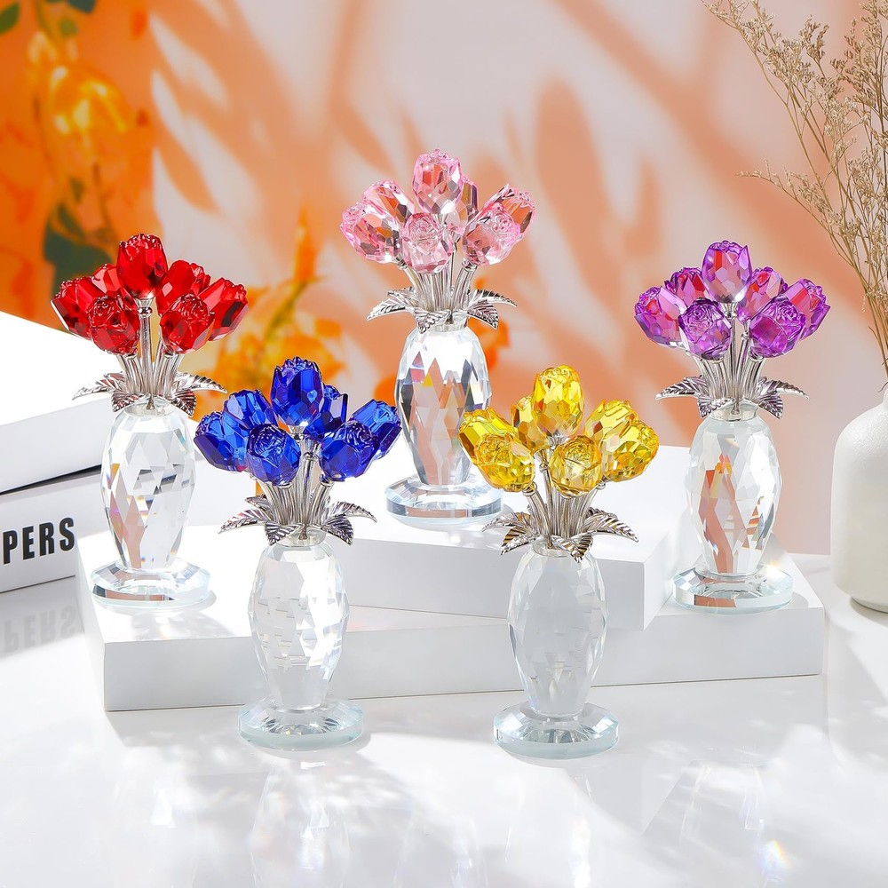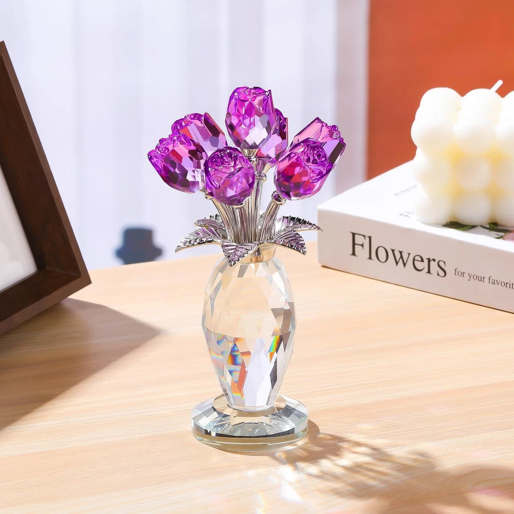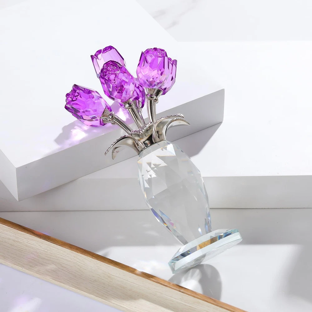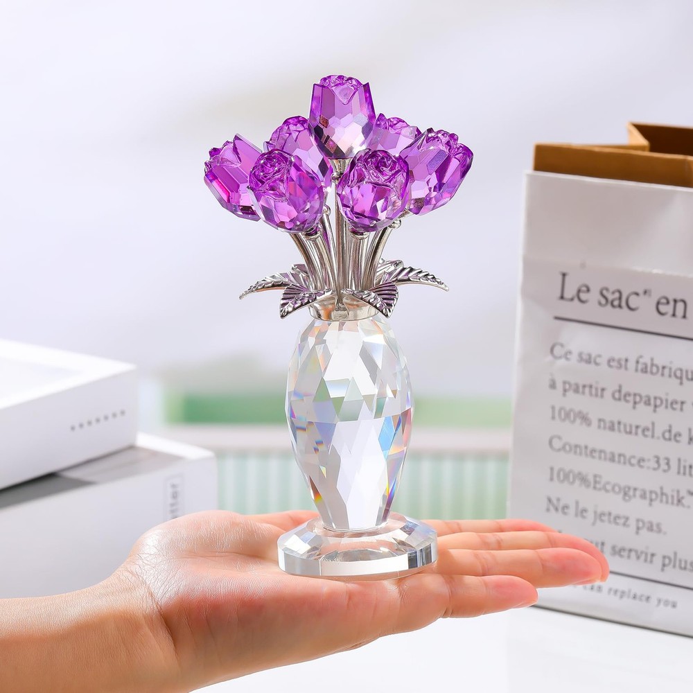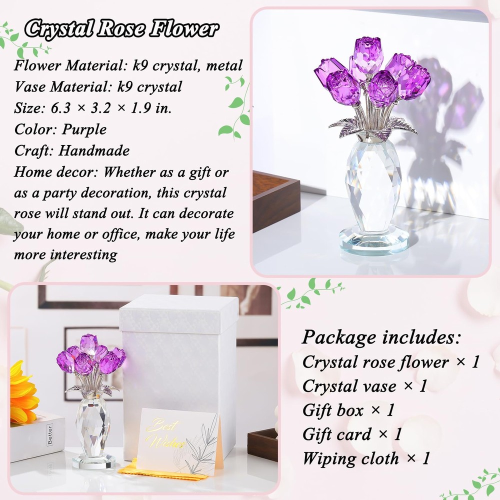 Crystal Purple Rose Flower Figurine with Vase, Handmade Romantic Rose Gifts Bouquet for Wife Mom Women, Glass Rose Flower with Stem Home Decor for Valentine Mother's Day Christmas Crystal Purple Rose Figurine: The petals and vase of the rose statue are made of K9 crystal, and the long stem and leaves are made of metal. This crystal purple rose flower figurine shows romantic love with its delicate rose shape. The crystal material is durable and not easy to fade or damage. The transparency and luster of the crystal gave this rose a vivid vitality Versatile Home Decoration: Size: 6.3 × 3.2 inches, the small crystal rose statue makes it suitable for a variety of home decoration scenes. Whether it is placed on a desk, a living room coffee table, or a bedroom bedside table, it can add a touch of elegance and romance to your home environment. It can also be used as a wedding or party decoration Handmade Exquisite Craftsmanship: The rose statue is handmade by our professional craftsmen, and the high-quality crystal has a good reflection effect. The rose can be given as a gift, handmade crystal crafts, photography props, art collections, crystal rose jewelry, and floral sculptures Perfect Rose Gift for Women: Whether it is a romantic gift for Valentine's Day, a gift for Mother's Day, a birthday gift or a festive decoration for Christmas, this crystal pink rose flower figurine is a very thoughtful choice. It is not only a beautiful gift, but also symbolizes affectionate blessings and sincere feelings, which can make the recipient feel your warmth and love Gift Box Package: This crystal rose figurine comes with a blank gift card and a wiping cloth. You can write any words you want to express on the card and use the wiping cloth to wipe the dust and fingerprints on the glass. Everything is packed in a white gift box Purple roses represent eternal, precious and unique love, expressing the unwavering love of lovers for each other, but also representing elegance and nobility, which can express love for a person. Crafted with K9 crystal, this pink rose figurine is exquisite and gorgeous, it is a great centerpiece for weddings, parties, celebrations, Christmas, office, etc. It is also the perfect gift for friends and family, on birthdays, anniversaries, Christmas, weddings, Mother's Day, and Valentine's Day for mom, wife, girlfriend, daughter, sister, or teacher, they will be very happy and touched when they receive the gift, we combine pure crystal with roses, our crystal rose bouquet home decor is a unique gift for your loved one that never fades and keeps your love alive. Product Specifications: Size: 6.3 × 3.2 × 1.9 in Material: K9 crystal and metal Craft: Handmade Package includes: 1 x Crystal rose figurine 1 x Gift box 1 x Gift card 1 x Wiping cloth Shipping We offer FREE shipping on all orders! We ship within Three business days of payment, usually sooner. We use a selection of shipping services such as UPS, FedEx, USPS etc. We only ship to the lower 48 states, no APO/FPO addresses or PO Boxes allowed. Local pickups and combined shipping options are not provided at this time. Return You can return a product for up to 30 days from the date you purchased it. Any product you return must be in the same condition you received it and in the original packaging. Please keep the receipt. Payment We accept payment by any of the following methods: PayPal Please pay as soon as possible after winning an auction, as that will allow us to post your item to you sooner! Feedback Customer satisfaction is very important to us. If you have any problem with your order, please contact us and we will do our best to make you satisfied. Contact Us If you have any queries, please contact us via ebay. We usually respond within 24 hours on weekdays. Please visit our eBay store to check out other items for sale! Thank you for shopping at our store.