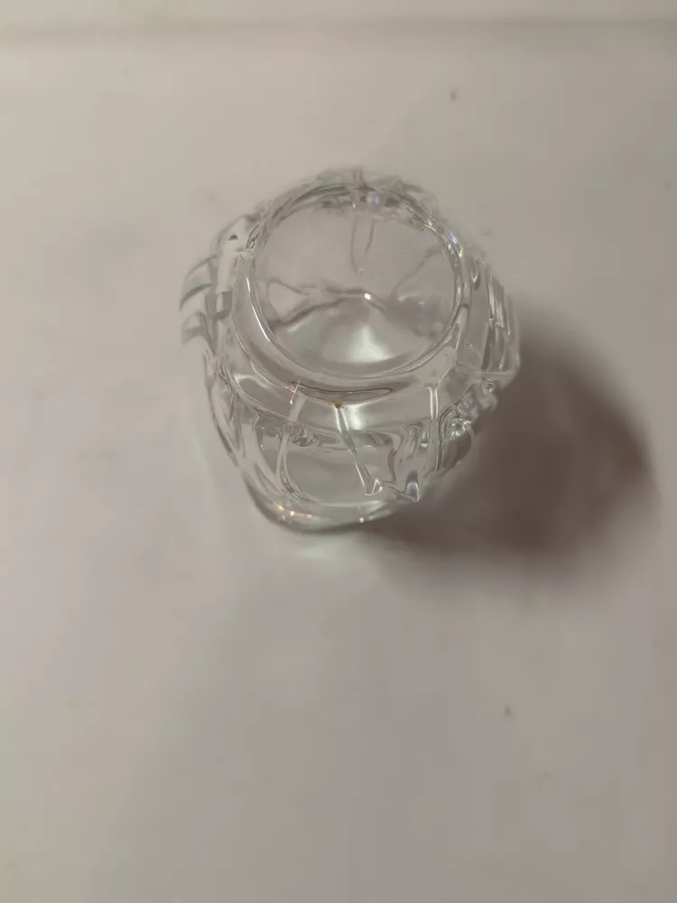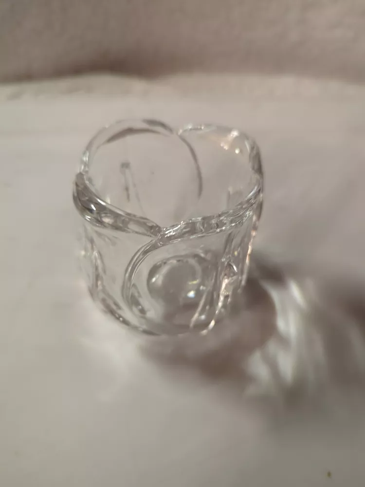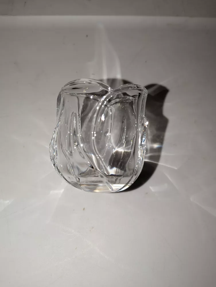 This product is a small, clear glass candle holder shaped like a flower with crystal accents. It is suitable for votive candles and is contemporary in style. The holder is 3 inches tall and 2-3/4 inches wide, and it features a glossy finish.