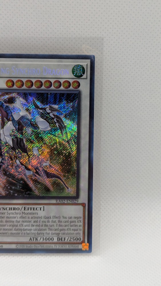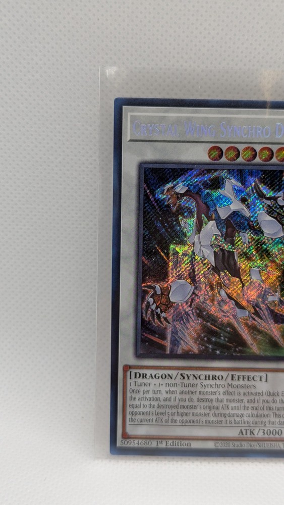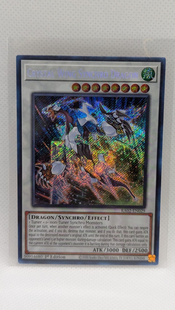 Same Day Shipping, Always Pack Fresh, Always Near Mint This is a rare and powerful Yu-Gi-Oh! TCG card called the Crystal Wing Synchro Dragon. It is a Secret Rare card from the 25th Anniversary Rarity Collection II, with the card number RA02-EN029. This card has an attack power of 3000 and a defense toughness of 2500, making it a formidable creature/monster type Dragon card. The card features the attribute/color of Wind and has the card type of Synchro and Effect. It is a 1st Edition card and is in English language. The manufacturer of this card is Konami. This card is a great addition to any collector's or player's deck.