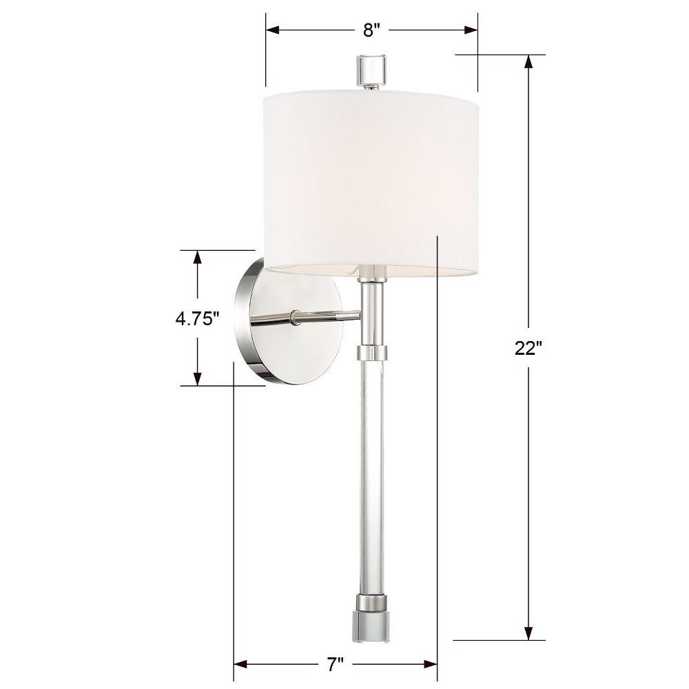 MPN: RACA3501PN Room: Dining Room, Entryway, Bathroom, Bedroom, Kitchen, Living Room Energy Star: A Item Diameter: 8 Depth: 7 inches Features: Dimmable, Wall Mounted UPC: 0633779042485 Color: Silver Product Line: Rachel Power Consumption: 60.00 Amperage: 1 A GTIN: 0633779042485 Shade Shape: Drum Voltage: 120 V Brand: Crystorama Installation Area: Indoor IP Rating: IP65 Finish: Polished Nickel gtin13: 0633779042485 Sensor Type: Light Item Height: 22.12 Power Source: Corded Type: Wall Sconce Material: Nickel, Metal Item Weight: 2.00